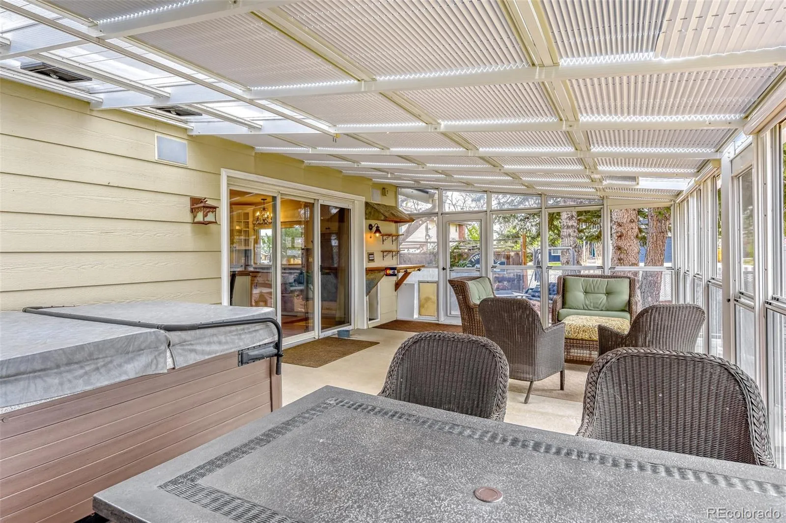 The enclosed 15′ x 27′ sunroom includes a new roof (2025), window coverings, fully functioning windows and screens for year-round living providing so much extra living space! The included hot tub will soak your worries away. The covered BBQ smoke shack, with cold water hook up and electricity, also provides the chef of the house an outdoor kitchen! PLUS a connected natural gas BBQ is also included. Still concerned with storage space? Two outdoor sheds, with electricity, will protect your outdoor toys, gardening tools and much more! Relax by the firepit while enjoying the beautiful CO sunsets from your own backyard. This home will not disappoint! ** NEW CLASS 4 ROOF WITH OVERSIZED GUTTERS INSTALLED 2024 ** NEW EXTERIOR PAINT (2024) ** NEW FENCE SYSTEM (2024) ** NEWER FURNACE, A/C AND WATER HEATER (2019) ** ** HEATED GARAGE **