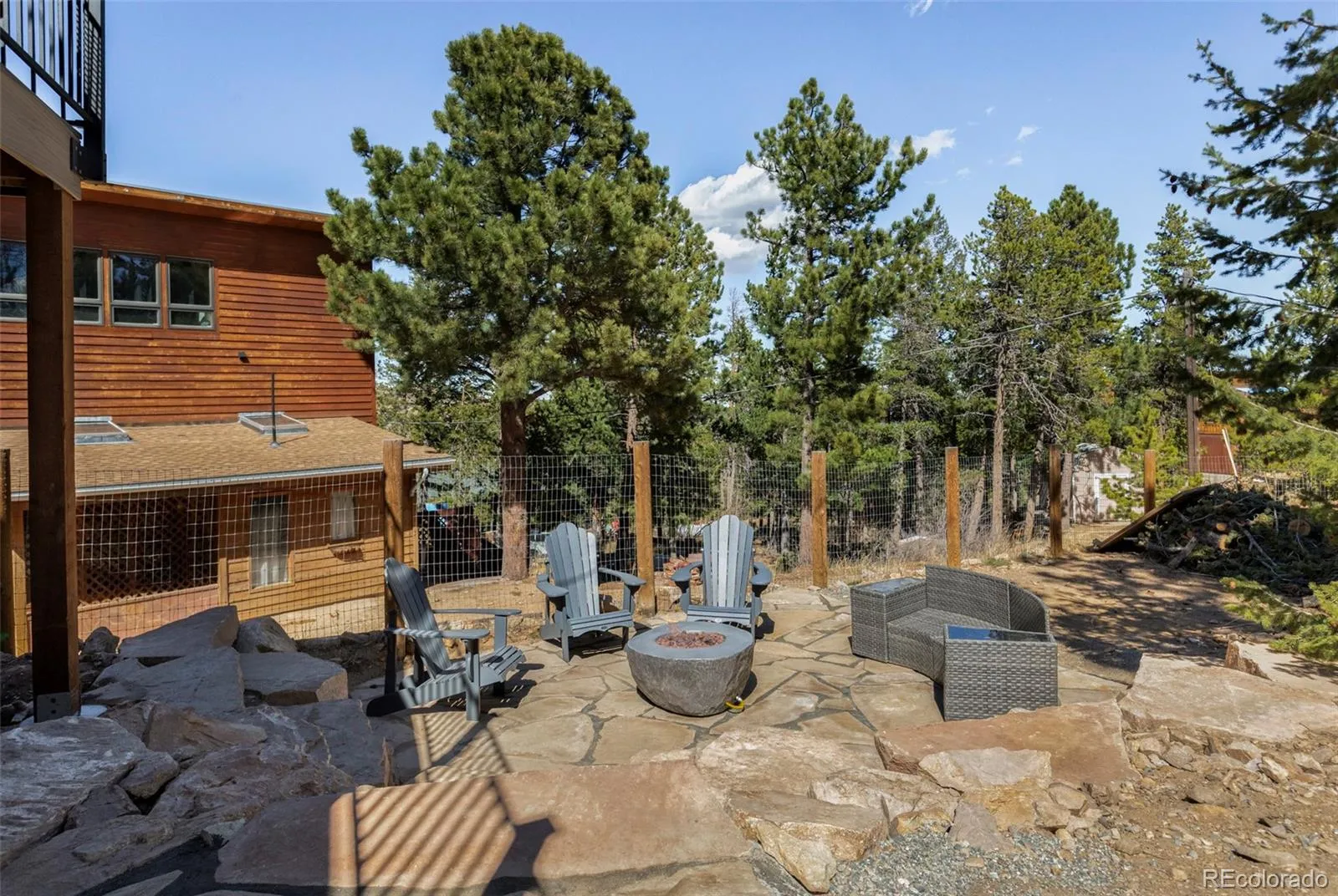 Mountain living is reimagined in this fully renovated Coal Creek Canyon retreat, where thoughtful design meets breathtaking natural surroundings. Set on a private lot with stunning mountain views, this home offers an open-concept layout filled with warmth and light. The inviting living area features classic shutters and a cozy fireplace, flowing seamlessly into a dining space highlighted by a rustic contemporary chandelier and a beautifully updated kitchen with light wood cabinetry and a center island. Renovated down to the studs, the home boasts new HVAC, ductwork, a tankless water heater and a whole-house multi-stage water filtration system. The primary suite offers a spa-like escape with a large walk-in shower and dual vanity, while a spiral staircase leads to a finished walkout basement with a rec room and space for a home office. Outdoors, enjoy an enclosed backyard with a 720 sq ft Trex deck and firepit lounge. Paid Tesla solar panels and EV charging complete this refined haven.