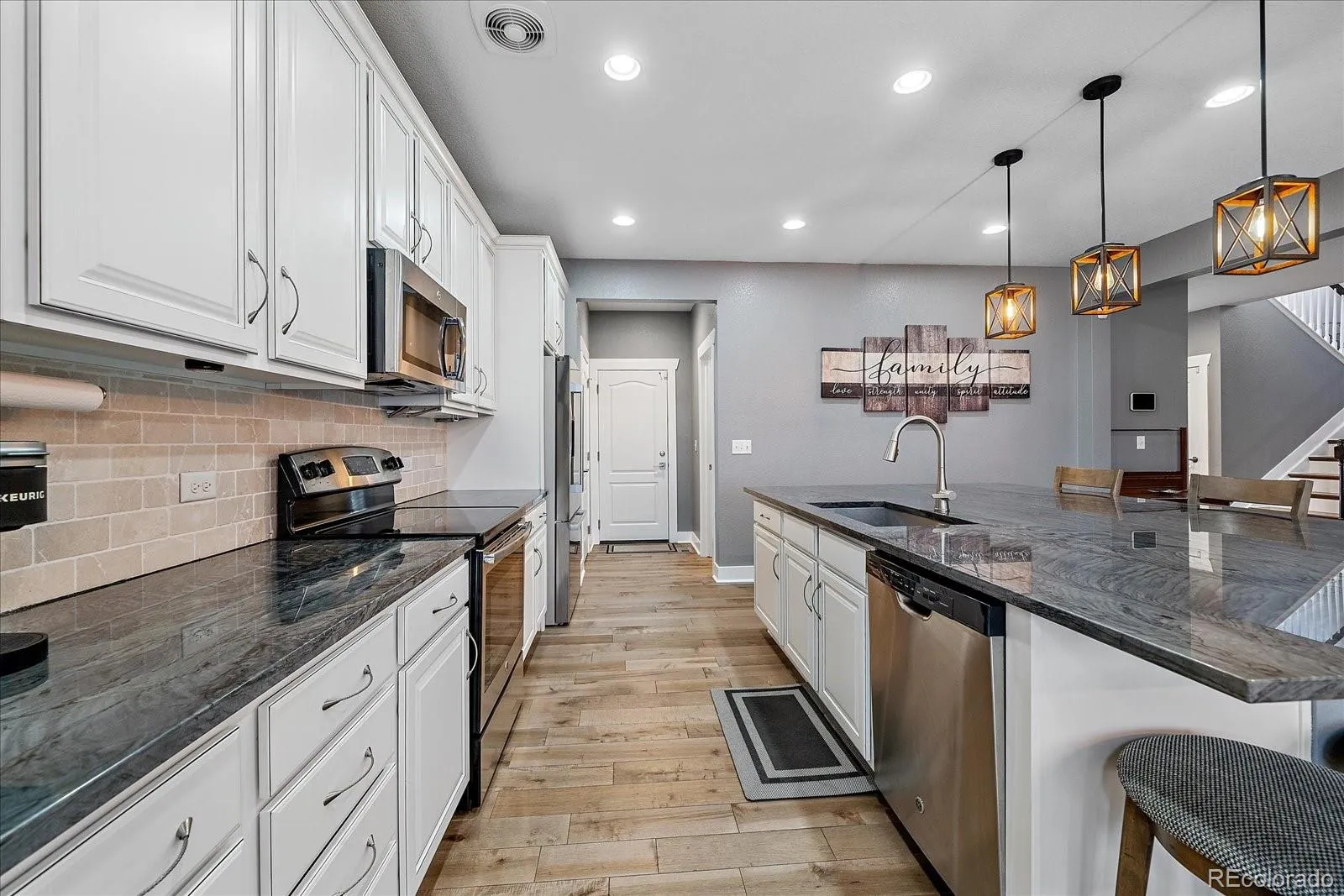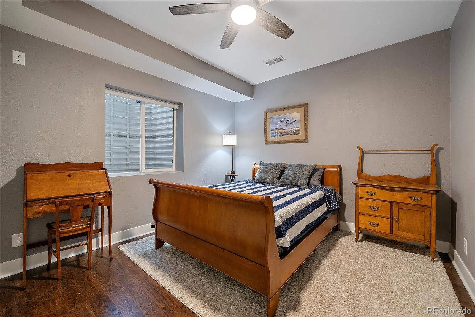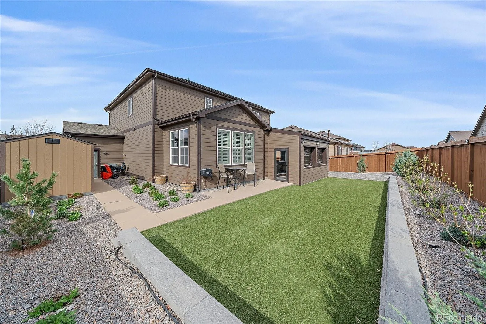 The finished basement provides even more living space with three additional bedrooms, a bathroom, and a large recreation area perfect for guests, hobbies, or movie nights. Outside, the stamped concrete patio creates an inviting backyard retreat for relaxing or entertaining. Additional highlights include LED lighting throughout, a smart thermostat, smart exterior lights, an included security system, a solar attic fan, a whole house fan, a water softener, wiring for 1 GB internet speeds, all furniture negotiable, and a new roof installed in 2024. Conveniently located near I-70 and E-470, with easy access to shopping, dining, and schools, this home offers the perfect blend of style, space, and location.
