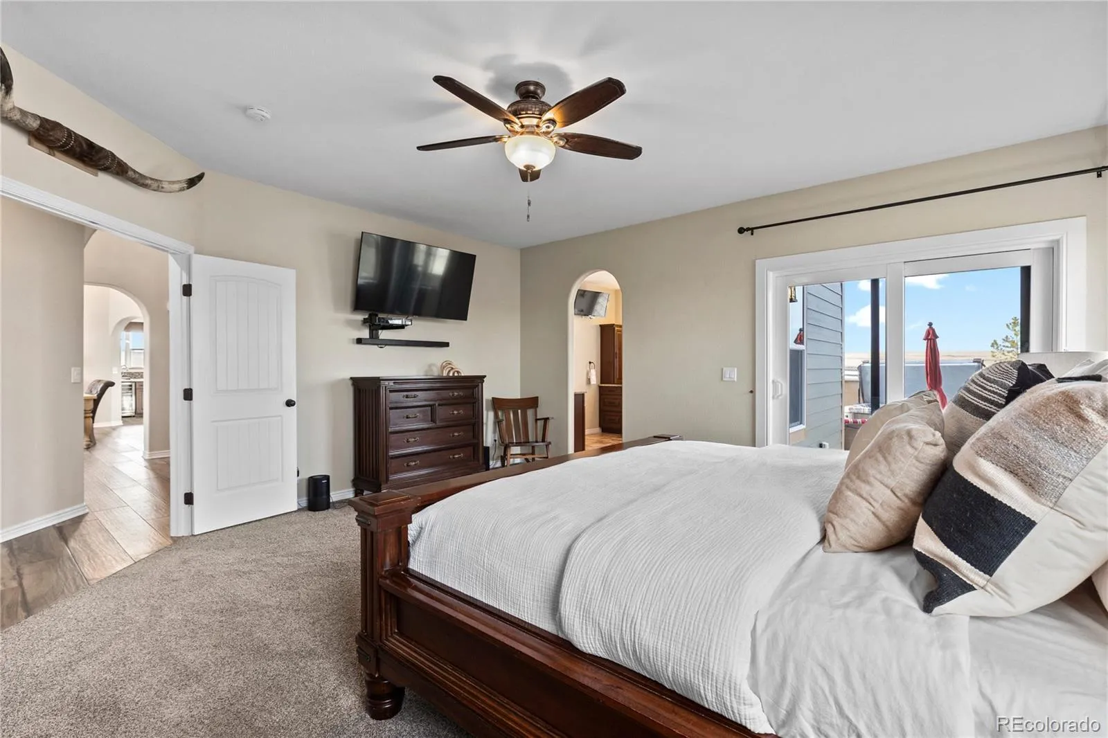 Perched atop 4.05 acres in Spring Valley Ranch, this custom two-story residence captures the privacy and openness that define Colorado living. Warm, inviting interiors are grounded by beautiful tile flooring, custom cabinetry, granite surfaces, and a striking rock fireplace, while the kitchen is designed for both gathering and function with a cook’s island and double ovens. With four bedrooms, four baths, A/C, and a dedicated safe room, this home offers both comfort and peace of mind.