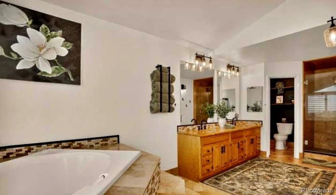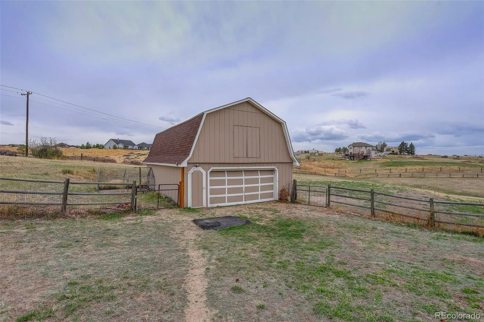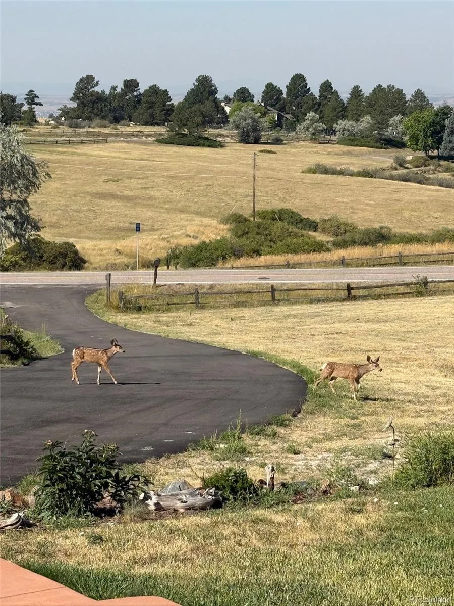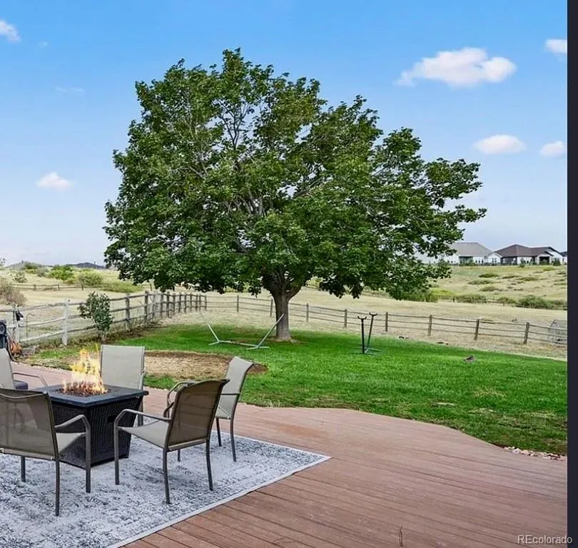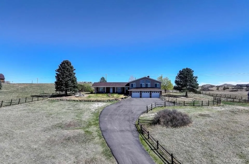Bask in commanding views from Pikes to Longs Peak at the 5-acre Rancho Cielo (“Sky” or “Heaven”). This estate offers a blend of modern updates with timeless charm, creating a retreat that feels both elevated and warm! The lovely living room welcomes you with a cozy fireplace and large bay windows that perfectly frame the mountains. The kitchen/dining area share the same breathtaking panorama through their own bay windows. The beautifully refreshed kitchen offers granite countertops, a large island, stainless steel appliances, updated lighting, and a walk-in pantry. Next, step into the home’s showpiece: an impressive 1,400-sq-ft great room designed for unforgettable entertaining. This space features a full wet bar, a dramatic floor-to-ceiling fireplace, and surround sound. French doors open to a private outdoor oasis with TREX deck, hot tub, and a gas grill—perfect for gatherings or quiet evenings under a star-filled sky! Upstairs, the primary suite has vaulted ceilings, bay windows with plantation shutters, attached bonus space, and more mountain vistas! The en-suite bath includes a soaking tub, separate shower, dual vanities, and generous closet space. Two additional bedrooms and baths complete the upper level. The lower level has versatile space ideal for multi-generational living, office, or bedroom – with cozy fireplace sitting area and nearby bath. Downstairs is another spacious bedroom or bonus room with closet and egress. Outdoors, enjoy the serene covered front porch year-round while watching wildlife or stunning sunsets! Equestrian amenities include a 2-stall barn, fenced pastures, and access to neighborhood bridle paths. The 3-stall garage includes an EV charger, and 1-acre yard features an electric fence. Newer solar panel system is owned! Located minutes from downtown Parker and E-470, this property is quick access to DTC, downtown and endless recreation. Rancho Cielo offers a rare opportunity to own a sanctuary with unmatched views! NO HOA!
