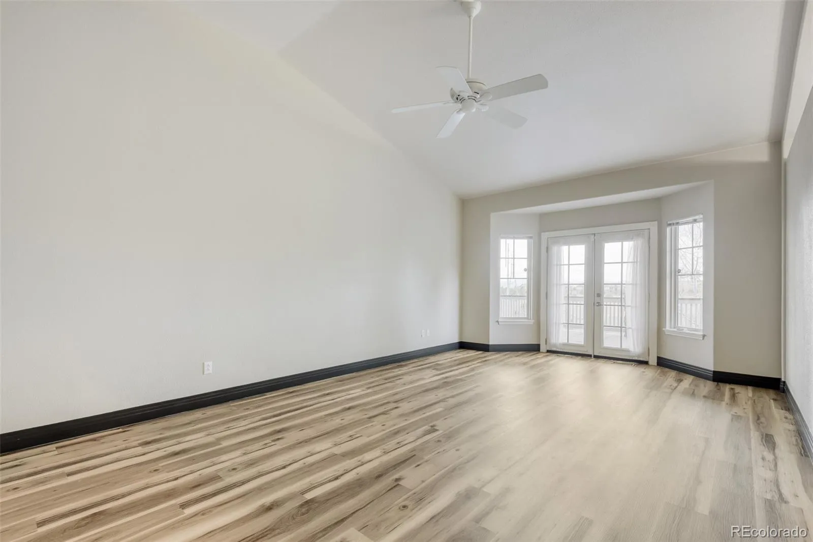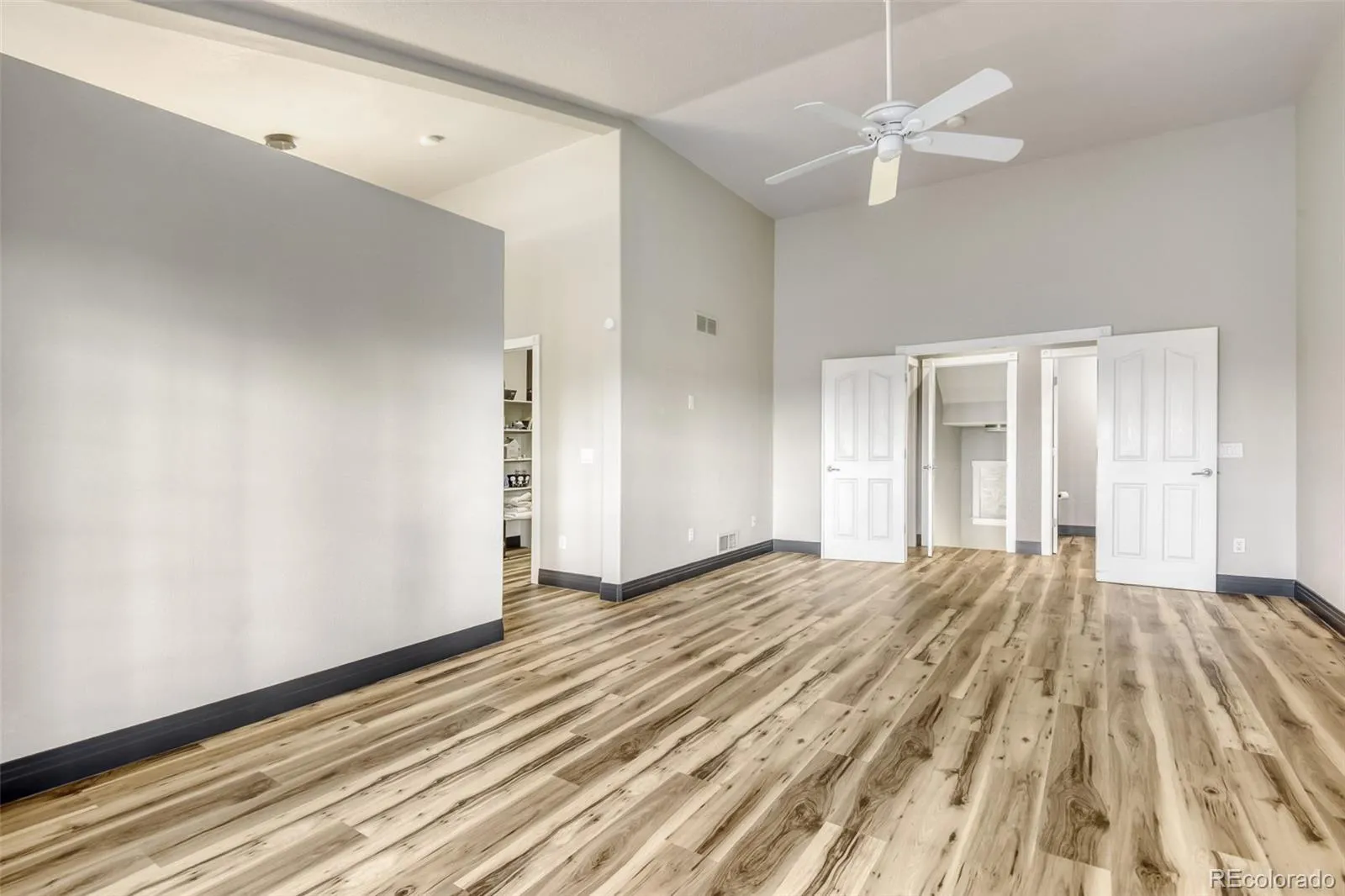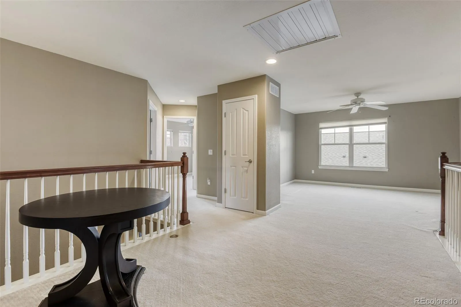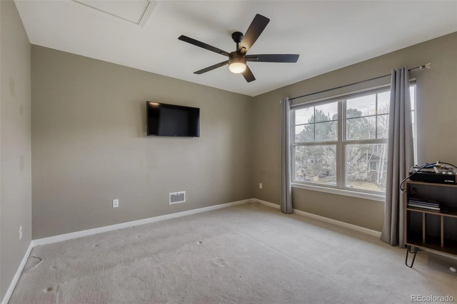Upstairs offers 2 more spacious bedrooms, a full bath, and a large loft ideal for a media room, playroom, or additional lounge space. The maintenance-free custom deck is a true highlight, featuring ceramic tile flooring, a vaulted roof, powered sunshades, and scenic views off the deck that create a seamless indoor-outdoor living experience. Enjoy mountain sunsets, fireworks, and a professionally landscaped yard, artificial grass, with mature trees for added privacy. Just a short walk to the neighborhood park and exceptional clubhouse, this rare move-in ready home offers luxury, space, views, and unmatched versatility.