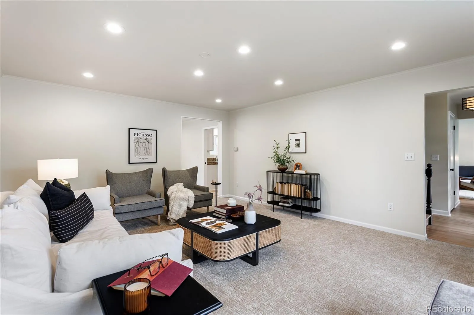 Excellent updated mid century 2-story on a prime & ultra-quiet block of Belcaro. With over 3800 total square feet, this home features 4 bedrooms on the 2nd floor + a large 5th non-conforming basement bedroom with egress window & ensuite bath. 3 bathrooms on the 2nd floor including 2 ensuite baths. Excellent main floor layout with large living room with gas log fireplace, expansive family room, formal dining room with new solid oak hardwood floors, powder bath, & breakfast nook area off kitchen. Finished basement with large rec room & bonus room or bedroom with newly remodeled (2026) ensuite bath with steam shower (shower glass door on order & to be installed soon). Beautiful newly refinished mid century classic 1.5″ oak strip hardwood floors. New carpet just installed. New interior & exterior paint. Newer sprinkler system. The electrical panel has been updated from the original panel. Brand new sliding patio door. Central A/C. Class 4 impact resistant shingle roof (which saves on insurance premiums with many carriers). The exterior features a huge private back yard with covered & open patio areas, garden areas with sprinkler system/drip lines to plants & more. Ample parking with the 2 car garage + huge bonus concrete parking area on driveway. Absolute prime location close to Washington Park, Cherry Creek, Bonnie Brae & much more. All kitchen appliances plus washer & dryer included. Buyer to verify square footage.