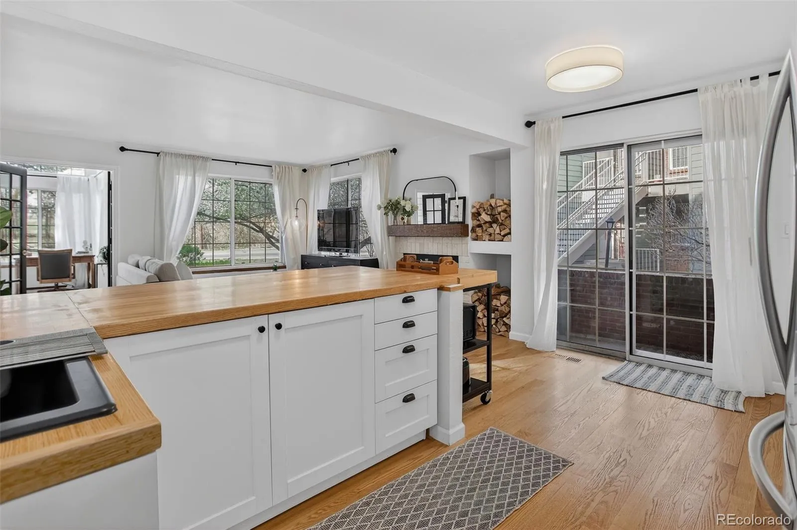 Natural light pours into the home from every angle, highlighting the rich hardwood floors and fresh, modern finishes throughout. The open-concept layout creates a seamless flow between the kitchen, dining, and living spaces, anchored by a cozy fireplace and extending out to a private covered patio that overlooks peaceful, park-like surroundings.