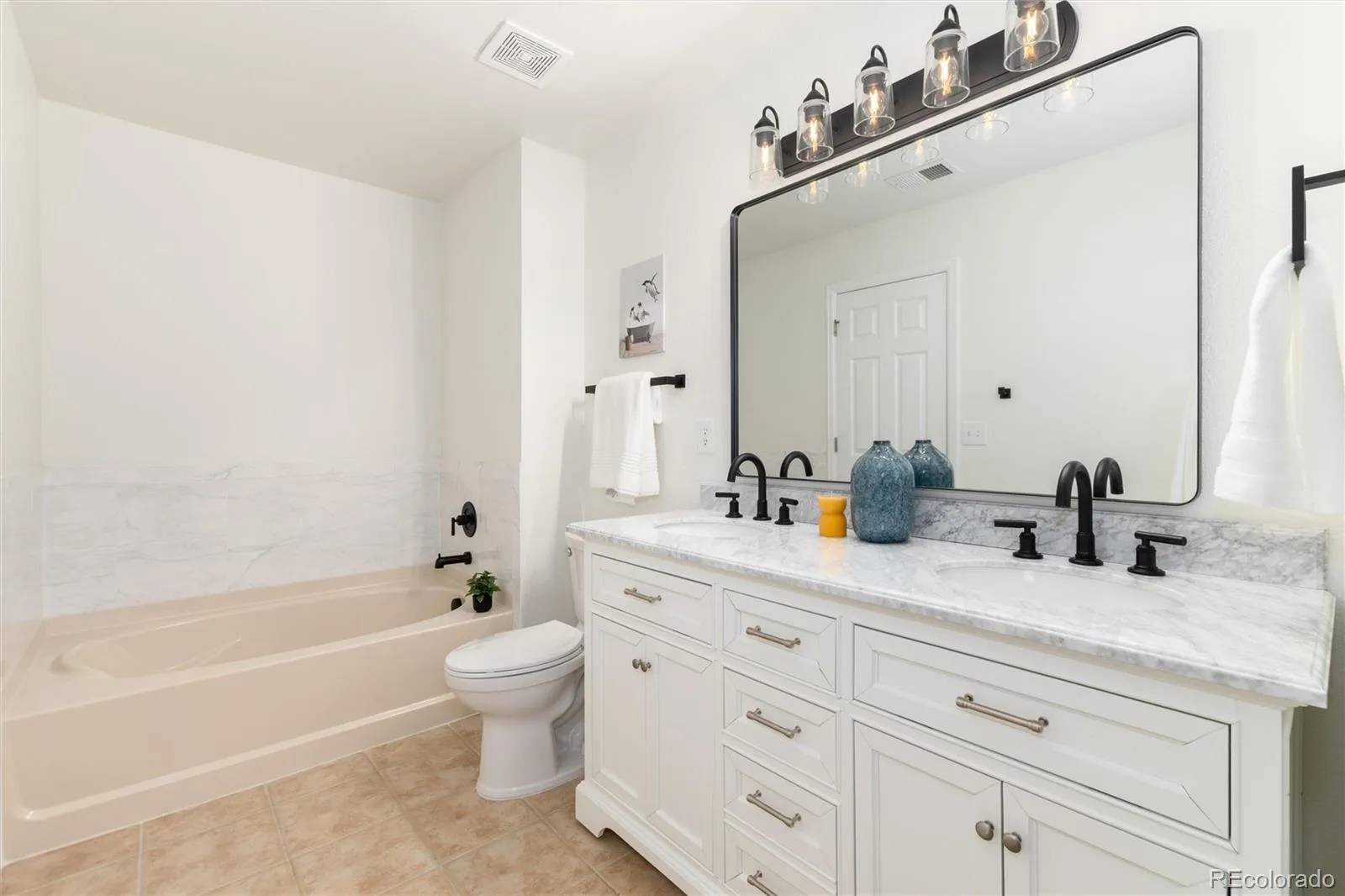 The primary suite is a true retreat with two closets and a beautifully updated en-suite bath featuring a new double vanity, matte black fixtures, soaking tub, and separate shower. The second bedroom is ideal for guests or a dedicated office space, complemented by a fully remodeled hall bath with new tub, tile, vanity, and flooring.