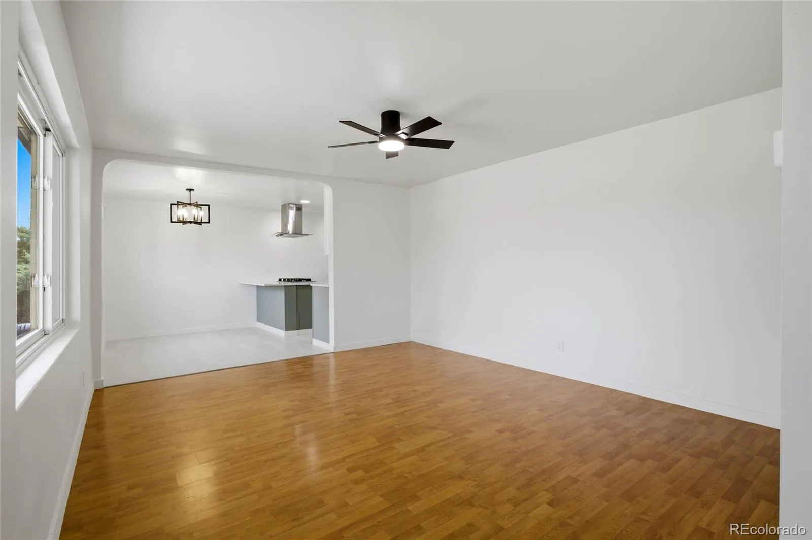 The main living area includes updated flooring, recessed lighting, and a contemporary light fixture, creating a bright and open interior. The space flows naturally from the kitchen into the living area, providing flexibility in how the rooms are used.
