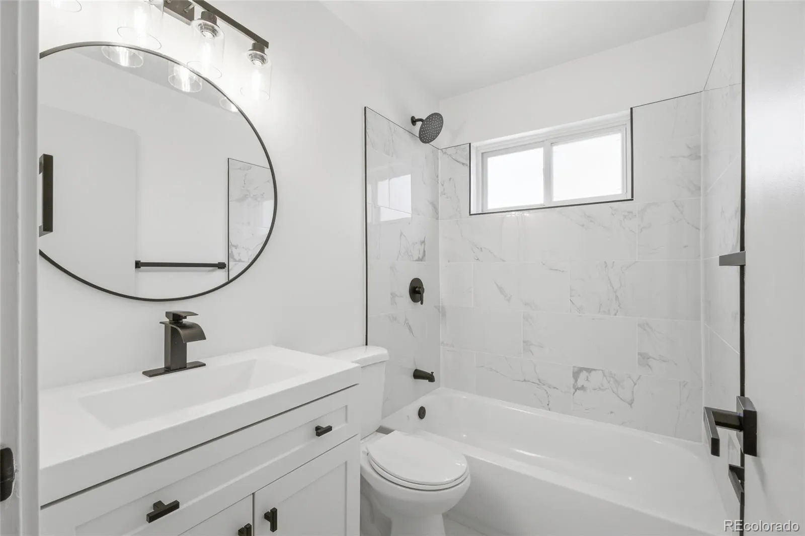 This updated home features a refreshed interior with modern finishes and a clean, cohesive design throughout. The kitchen has been renovated with updated cabinetry, solid surface countertops, stainless steel appliances, and a center island with a built-in cooktop and overhead vent hood. Tile flooring and a stylish backsplash complete the space.