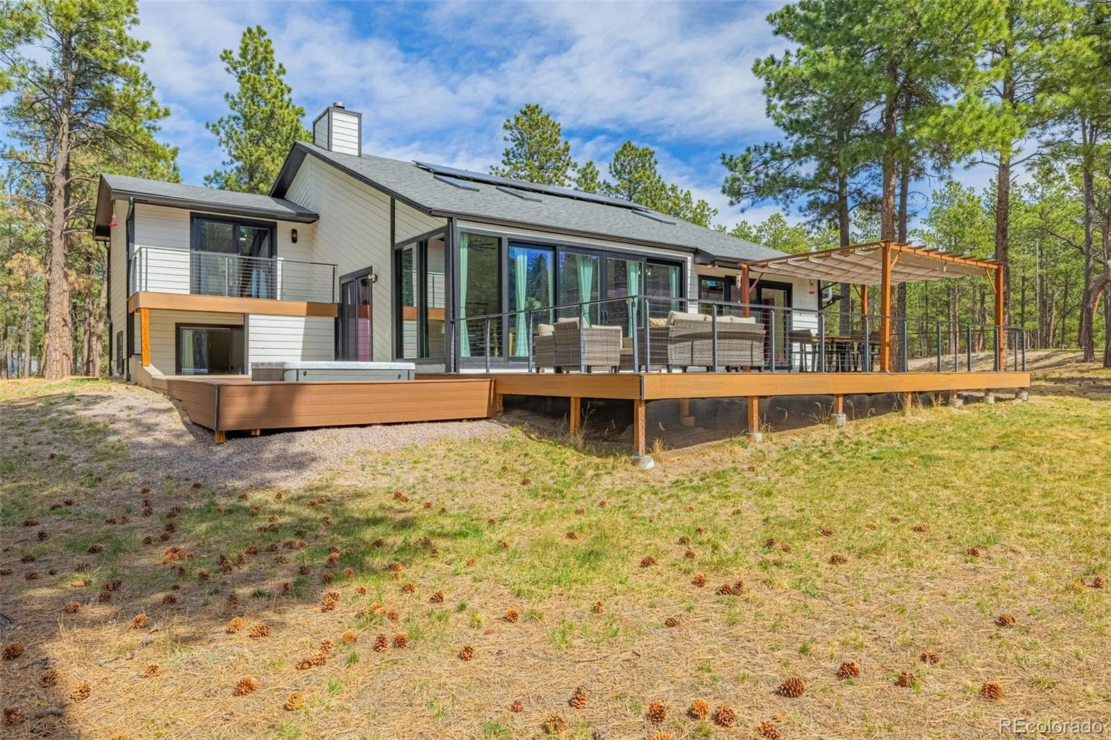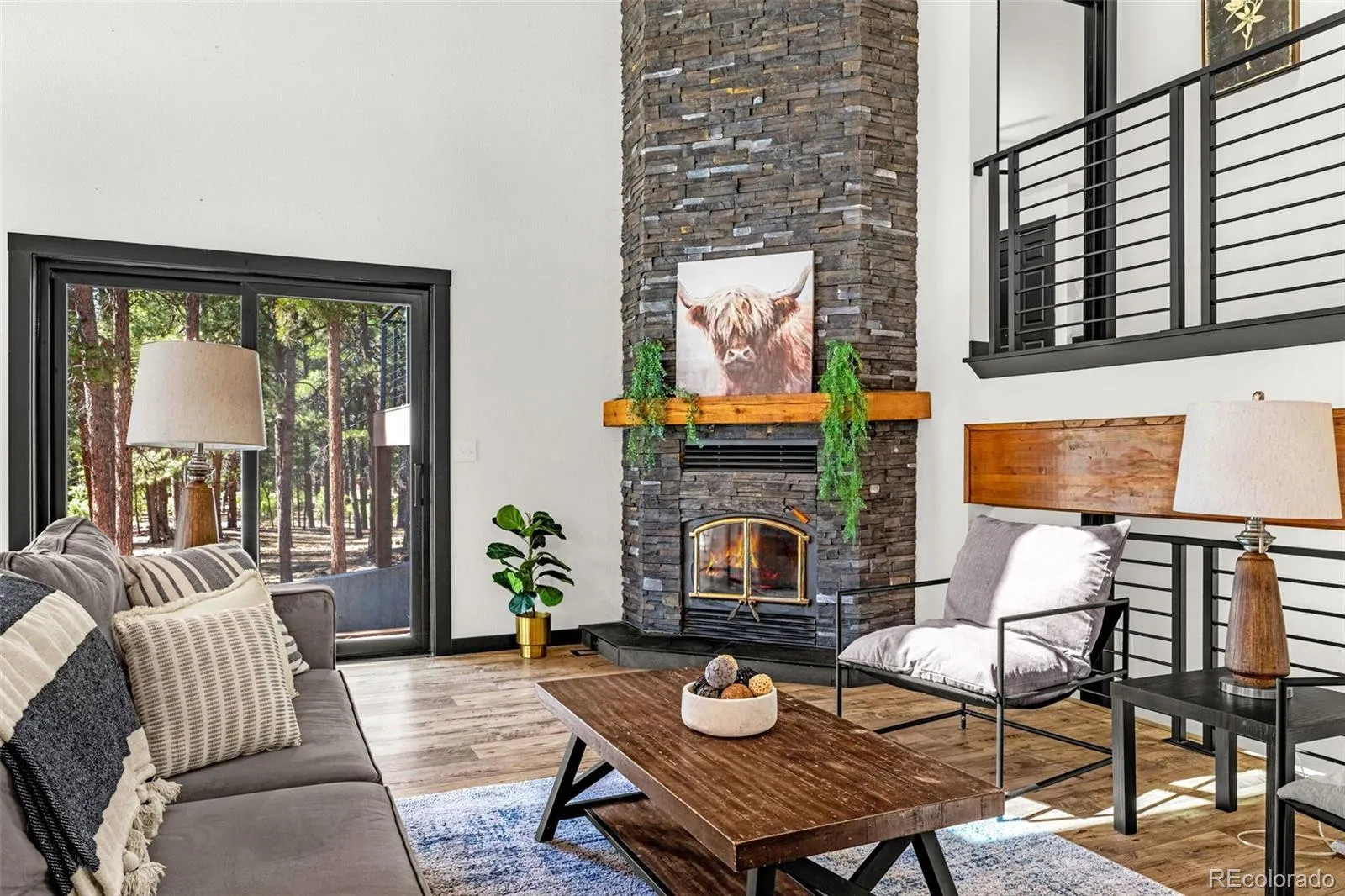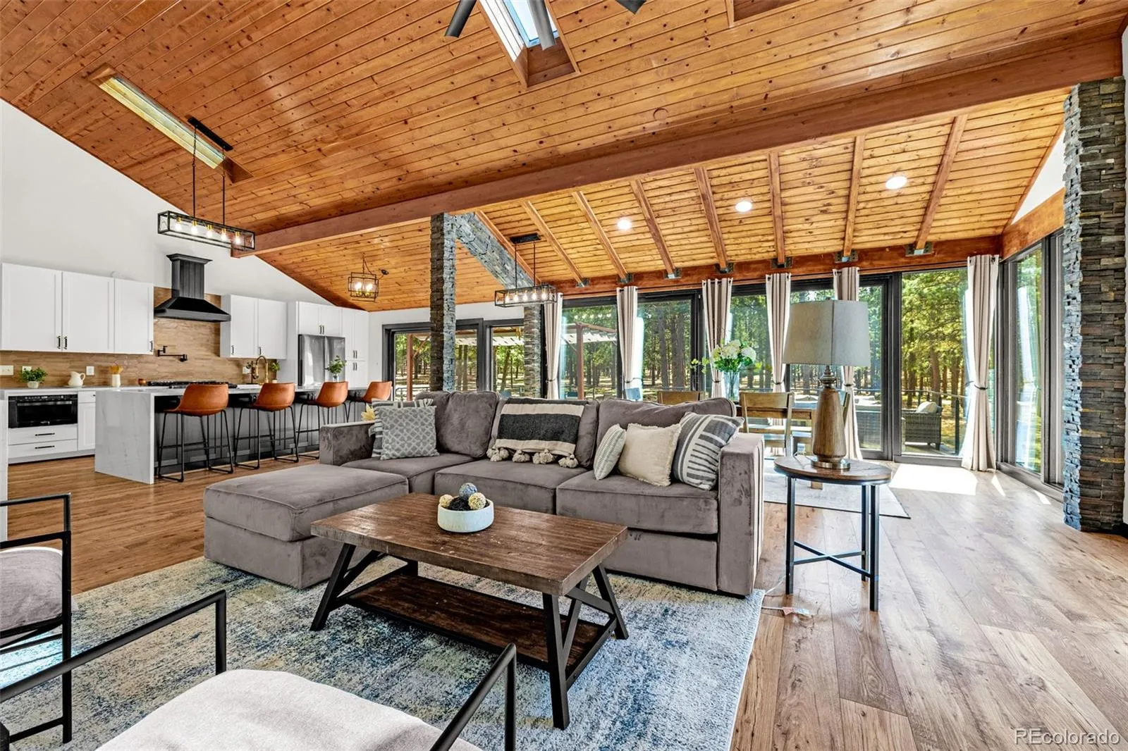 Beauty in Black Forest. Blending luxury and rustic living with 6.1 acres and an amazing, completely updated home. Ample space and a scenic, peaceful setting. The open concept floor plan features a vaulted wood-beamed ceiling, allowing abundant natural light to fill the interior. The spacious kitchen boasts abundant cabinetry and modern finishes, including a waterfall countertop and gourmet appliances. The primary bedroom showcases a large window, exposed beams, and a spacious en-suite bathroom with a rustic stone accent wall. The home’s open layout seamlessly connects the living, dining, and kitchen areas, creating a cohesive and comfortable flow. Hardwood-style luxury laminate flooring runs throughout, complementing the property’s rustic charm. At first glance, it might be difficult to find the basement, because it is hidden behind a Murphy Door, offering a fun surprise for guests and privacy. Additional features include a huge detached garage/workshop and a sprawling, fully treed lot that provides ample room for outdoor enjoyment, new solar panels and battery system, and relaxation amidst the stunning natural surroundings.