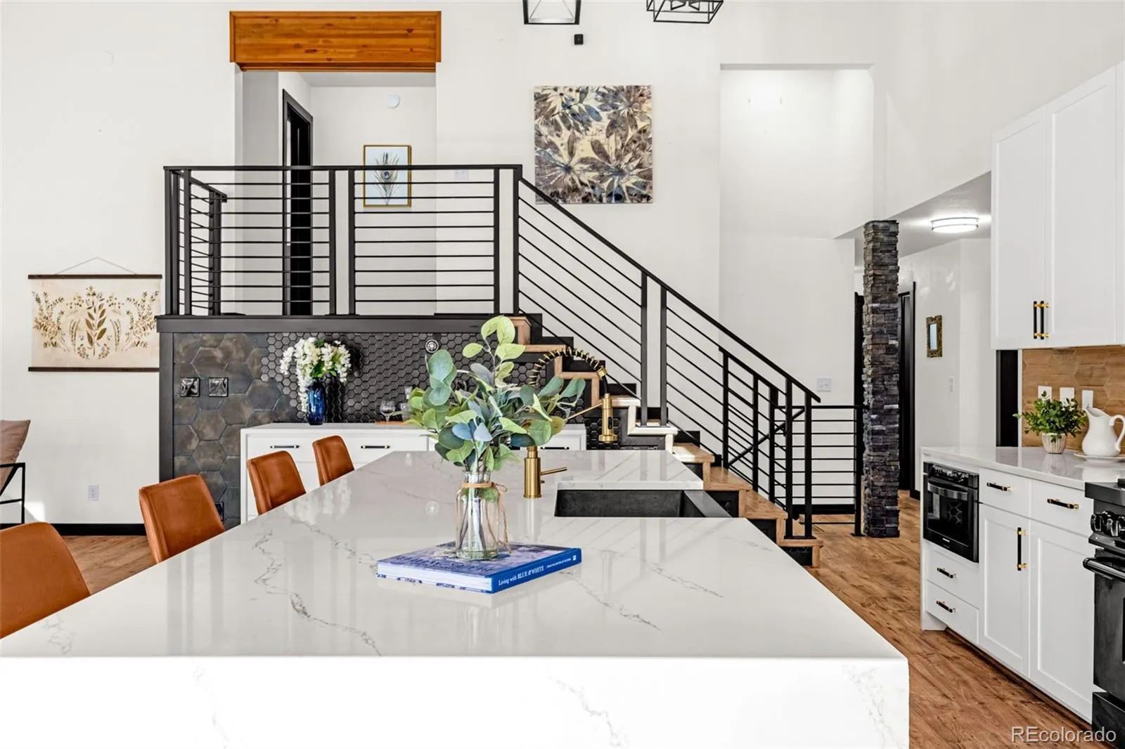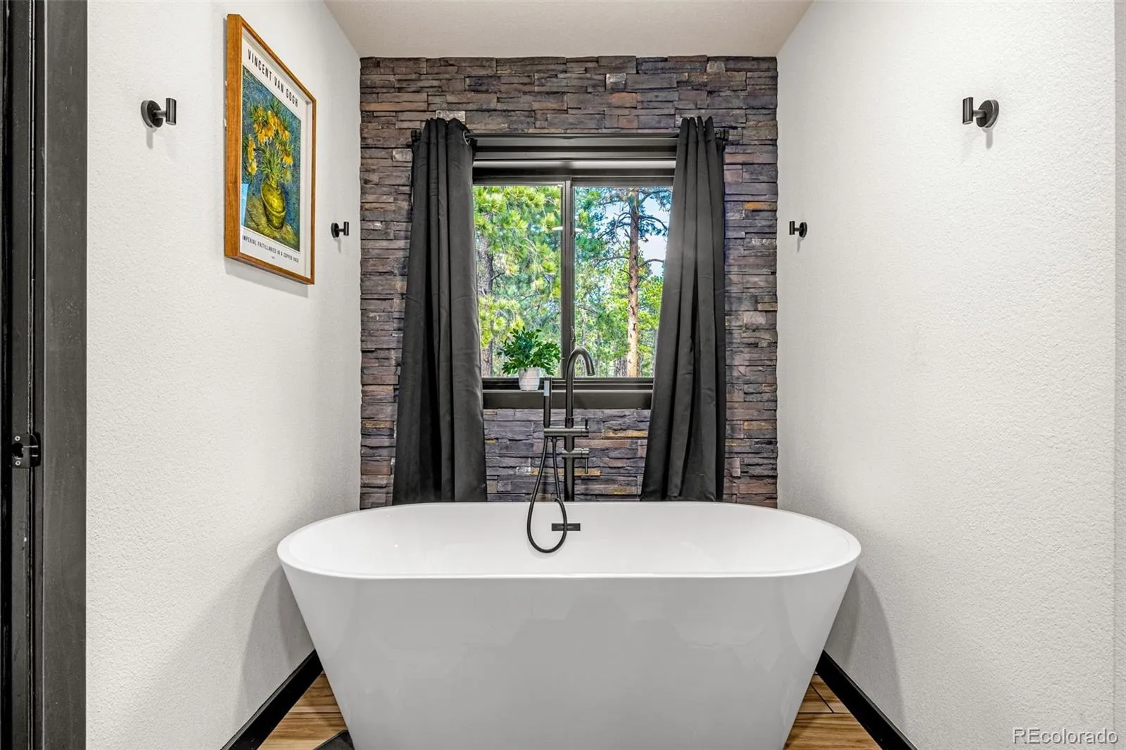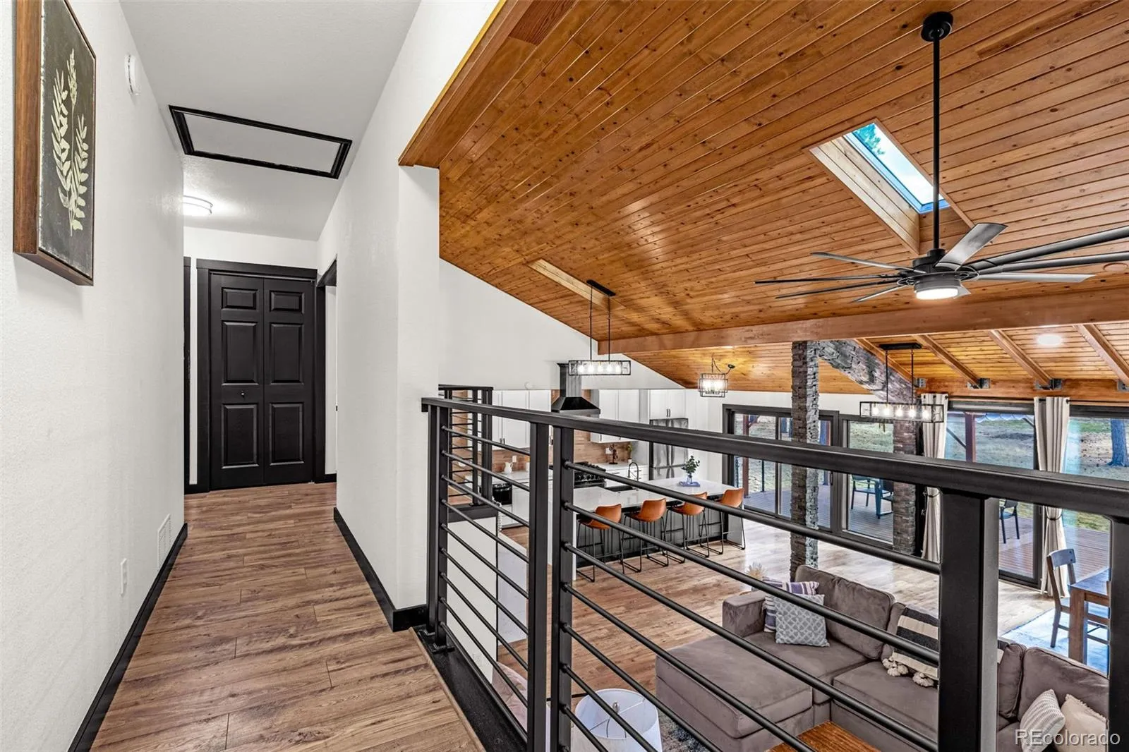Beauty in Black Forest. Blending luxury and rustic living with 6.1 acres and an amazing, completely updated home. Ample space and a scenic, peaceful setting. The open concept floor plan features a vaulted wood-beamed ceiling, allowing abundant natural light to fill the interior. The spacious kitchen boasts abundant cabinetry and modern finishes, including a waterfall countertop and gourmet appliances. The primary bedroom showcases a large window, exposed beams, and a spacious en-suite bathroom with a rustic stone accent wall. The home’s open layout seamlessly connects the living, dining, and kitchen areas, creating a cohesive and comfortable flow. Hardwood-style luxury laminate flooring runs throughout, complementing the property’s rustic charm. At first glance, it might be difficult to find the basement, because it is hidden behind a Murphy Door, offering a fun surprise for guests and privacy. Additional features include a huge detached garage/workshop and a sprawling, fully treed lot that provides ample room for outdoor enjoyment, new solar panels and battery system, and relaxation amidst the stunning natural surroundings.