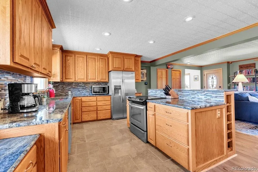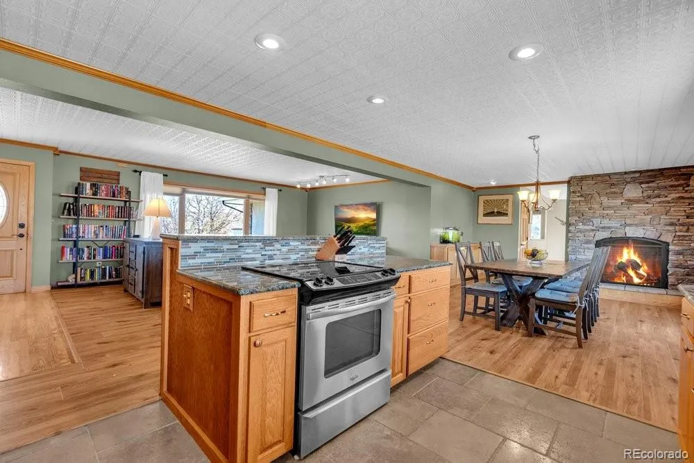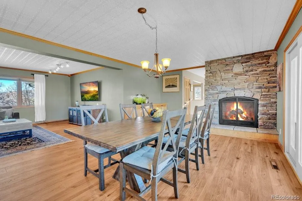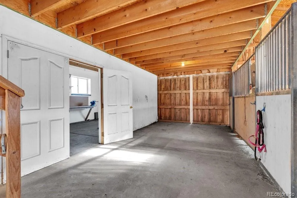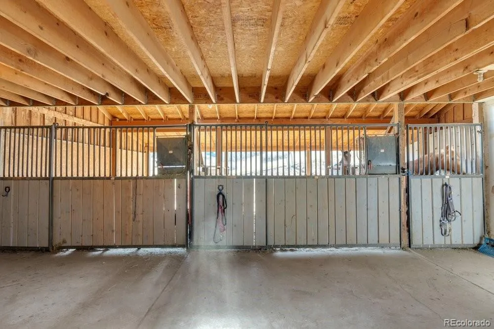 Tucked away at the end of a private cul-de-sac on 5 quiet acres, this exquisite 3500 square foot stucco & stone home is located within the sought-after equestrian community of Indian Creek Ranch. This beautiful home features new flooring, embossed ceiling tiles, floor-to-ceiling stone gas fireplace, lots of windows all framed by breathtaking mountain views. Designed as a culinarian’s dream, the kitchen boasts granite countertops, custom backsplash, new dishwasher, 42-inch high cabinetry w/crown molding, built-in wine rack & a butcher bar. Enjoy the convenience of 100% main-floor living with an expansive primary suite featuring a reading nook, new flooring, dual closets w/built-in drawers, glass doors to the deck and a 5-pc bath featuring dual sinks, a jet tub & heated floors. Even the laundry & mudroom are thoughtfully positioned on the main level to maximize ease & functionality. The walk-out basement expands your living space with 3 additional BRs, full bath and a billiards room which includes the pool table! Glass doors lead to a fenced flagstone patio, complete with a firepit & custom rock water feature—perfect for Colorado evenings. The home also features a humidifier, whole-house filtration system, a 2022 A/C unit and don’t forget the attached, oversized 2-car garage, complemented by an expansive driveway & apron that offers plenty of room for guest parking! Equestrians will find everything they need in the 3-stall heated barn, equipped with electricity, Nelson Automatic Waterers, a tack room & storage for plenty of bales of hay. Within the barn is an insulated & heated workshop which provides the perfect space for projects. Located adjacent to a bridle path, the property also grants access to a community arena, playground & clubhouse. Despite its privacy, you remain minutes from top-rated schools, shopping & dining. With its rare combination of beauty, comfort, friendly neighbors & low HOA fees, this is the ultimate retreat for you & your horses.