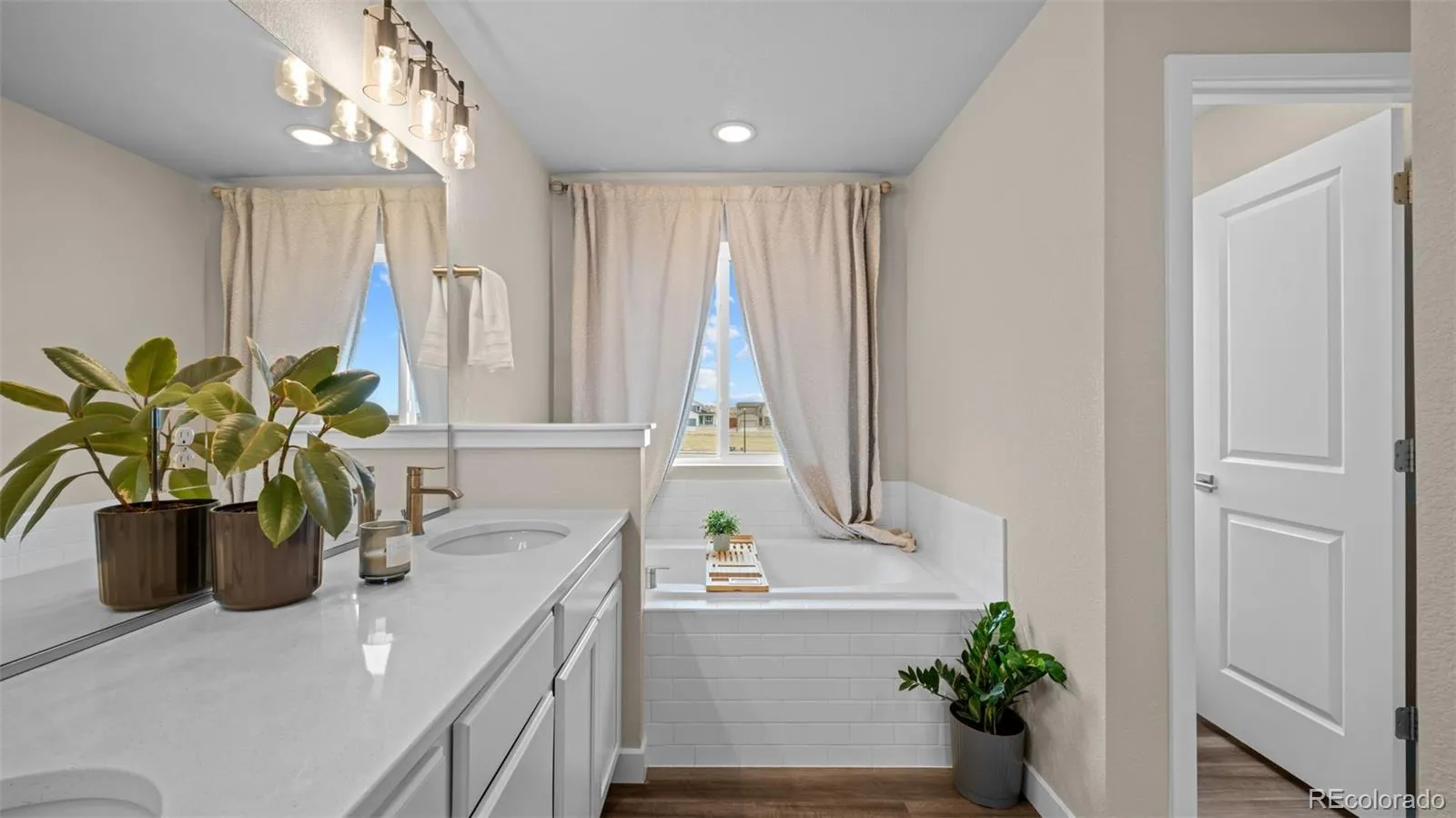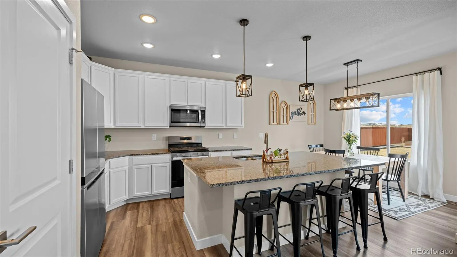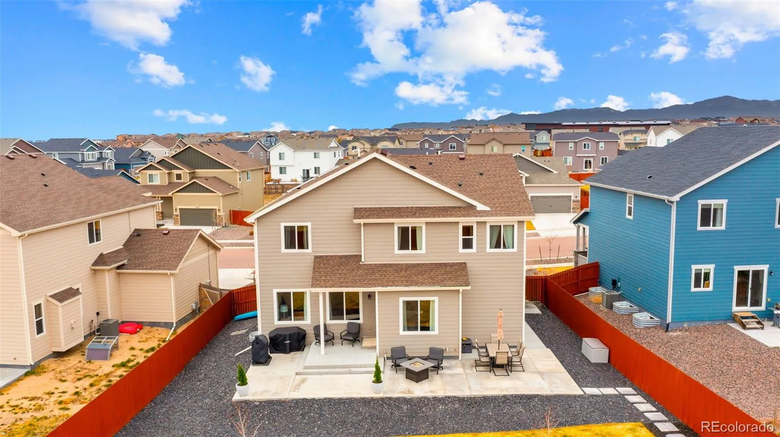 Welcome to this beautifully appointed two-story residence in the highly sought-after community of Meridian Ranch. Offering 4 bedrooms, 3 bathrooms, & a 3-car garage, this home showcases elevated finishes, & well-designed spaces throughout. Upon entry this home is both inviting & functional, centered around an open-concept layout ideal for everyday living & entertaining. The spacious kitchen with quartz countertops flows seamlessly into the dining area & living room, where a beautiful gas fireplace framed by floating shelving creates a warm and sophisticated focal point. Large windows fill the space with natural light & frame views of the beautifully finished backyard. Designed for both relaxation & entertaining, the outdoor living space features a covered patio that extends into an expansive concrete patio, offering ample room for outdoor dining, grilling, & gathering. A large level lawn & dedicated space for garden boxes add to the backyard’s versatility. The main floor also features an office & powder bath which provide added convenience & flexibility. Upstairs, the spacious primary suite offers a true retreat with a private sitting area, dual closet space, & a 5-piece ensuite bath. Three additional bedrooms, each with walk-in closets, a full secondary bath & an upstairs laundry room complete the upper level with functionality in mind. The unfinished basement is filled with natural light & presents an excellent opportunity for future expansion, customization, or additional living space. Thoughtful lighting upgrades throughout the home add a refined touch beyond standard builder finishes. Ideally located within Meridian Ranch, residents enjoy access to an exceptional lifestyle with community events, indoor & outdoor pools, a new field house, scenic walking/hiking trails, Antler Creek Golf Course, & a recreation center with modern fitness amenities and classes. Perfectly located with easy access to Military installations, shopping and dining.