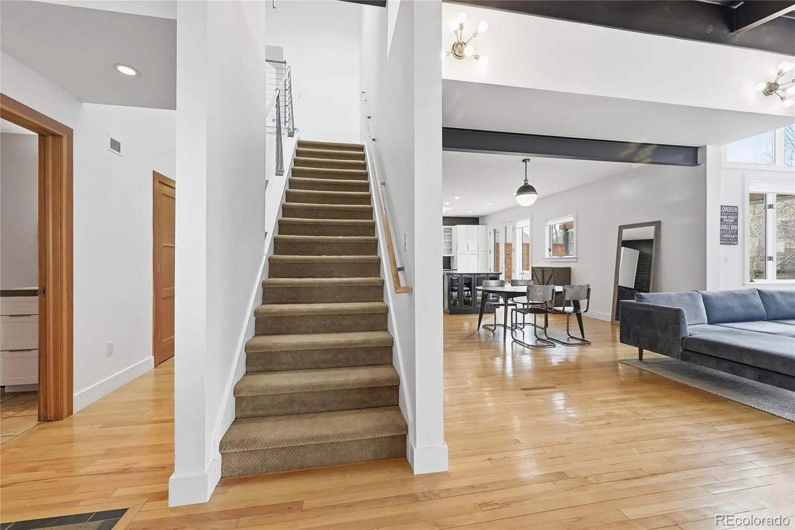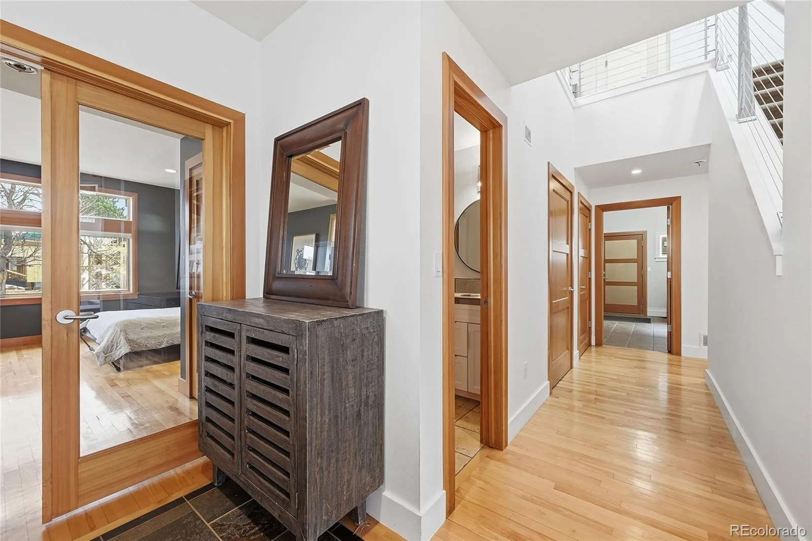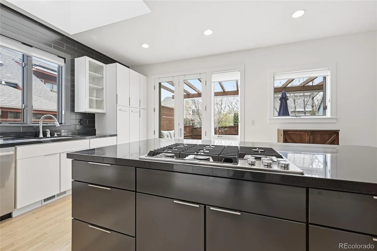 A striking architectural residence in one of North Boulder’s most desirable pockets, perfectly positioned between Wonderland Lake and Foothills Community Park offering immediate access to miles of trails, open space, and some of North Boulder’s most coveted outdoor amenities. This 5-bedroom, 4-bath masterpiece offers over 4,000 square feet of thoughtfully designed living. Masterfully designed by architect JV DeSousa, the home is defined by clean lines, abundant natural light, soaring ceilings and a sense of volume and ease throughout. The open-concept main level is both refined and highly livable, anchored by custom artistic elements by local artist Osbourne Sculpture, including a statement fireplace, sculptural railing, and bespoke kitchen island. The flexible layout offers true versatility, featuring a spacious main-level office that easily converts to a guest suite with a built-in Murphy bed and access to an ensuite full bath. Function is seamlessly integrated with walk-in closets, built-in dressers, generous shelving, and a well-appointed laundry/mudroom with utility sink and custom cubbies. An oversized garage adds storage and convenience, while recent system upgrades, including two new furnaces, A/C systems, and solar panels producing energy beyond current usage, enhance efficiency and long-term value. Thoughtful capital improvements have been made throughout, including an extension of the outdoor living experience with a composite deck, wood fencing, a premium pergola, and low-water landscaping creating a private, low-maintenance setting designed for both relaxation and entertaining. The fully finished lower level expands the living space with a versatile layout, complete with built-in Murphy bunk beds, ideal for guests, media, or play. Fresh, intentionally minimal and architecturally distinct, this home offers a refined backdrop and a rare opportunity to own a truly enduring piece of North Boulder.
