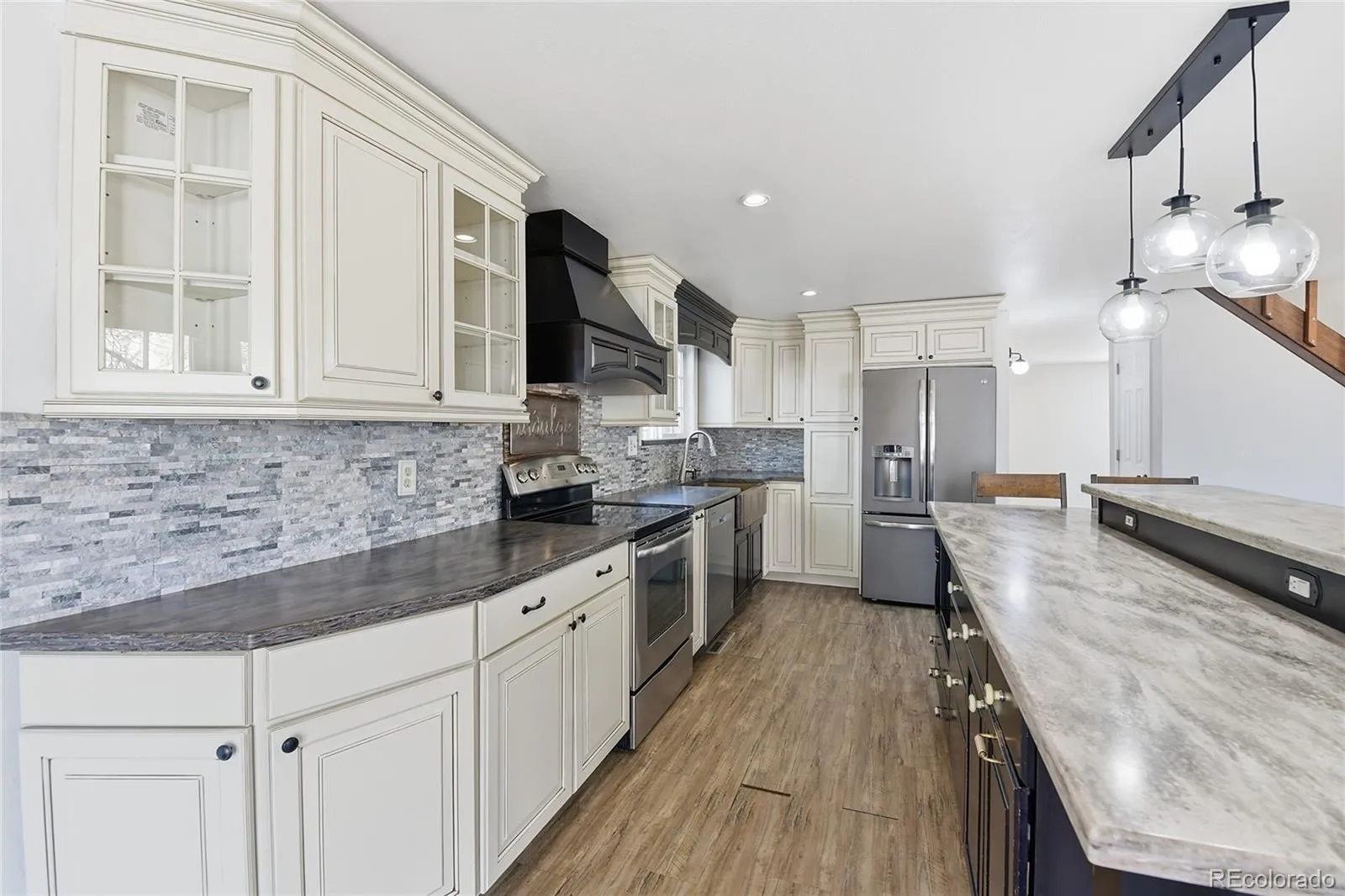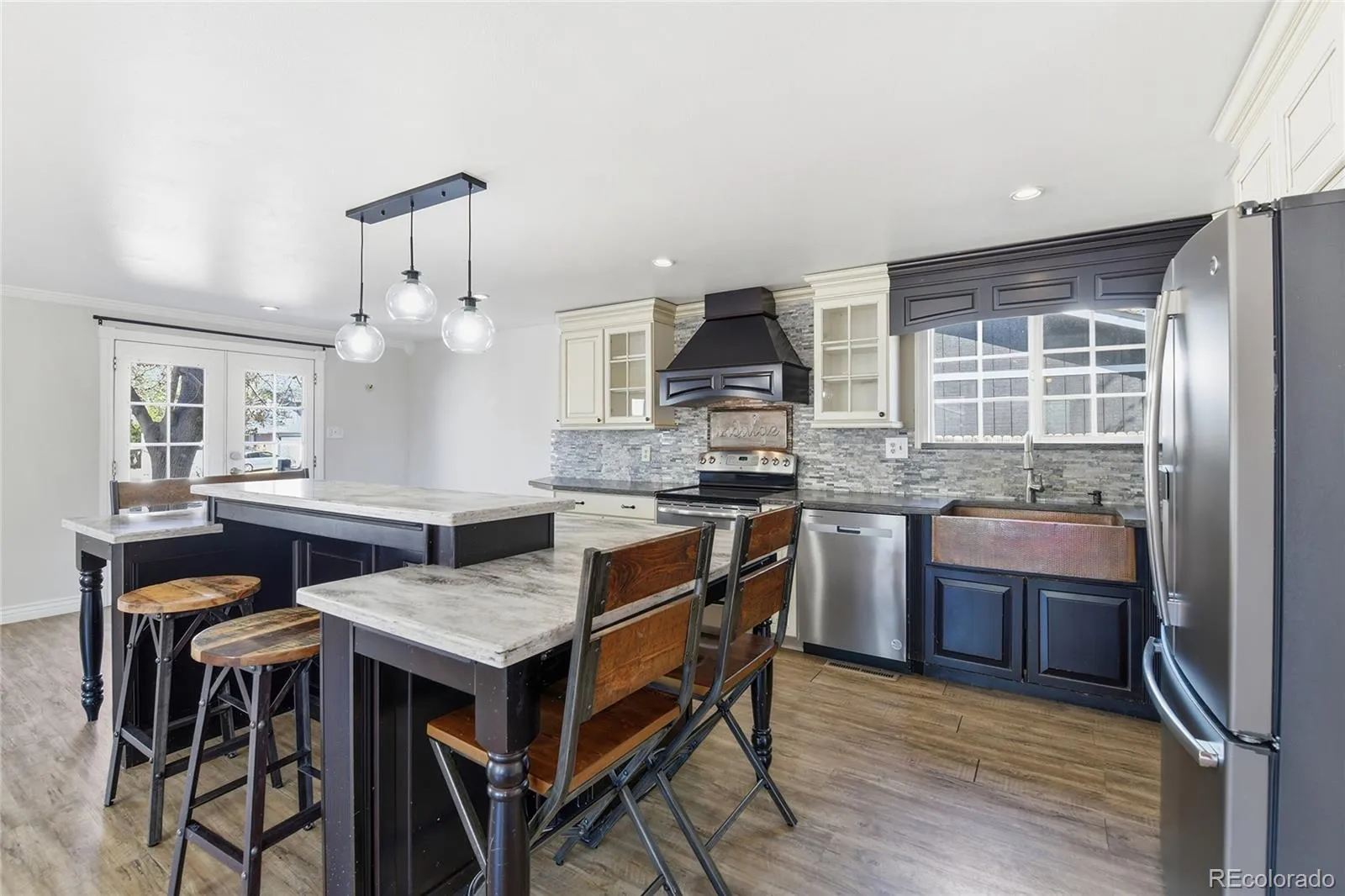 At the heart of the home, a thoughtfully designed custom kitchen creates a true centerpiece for daily living and entertaining. Featuring soft-close cabinetry, quartz composite countertops, a striking copper sink, granite backsplash, and sleek newer appliances, this space delivers both style and practicality.