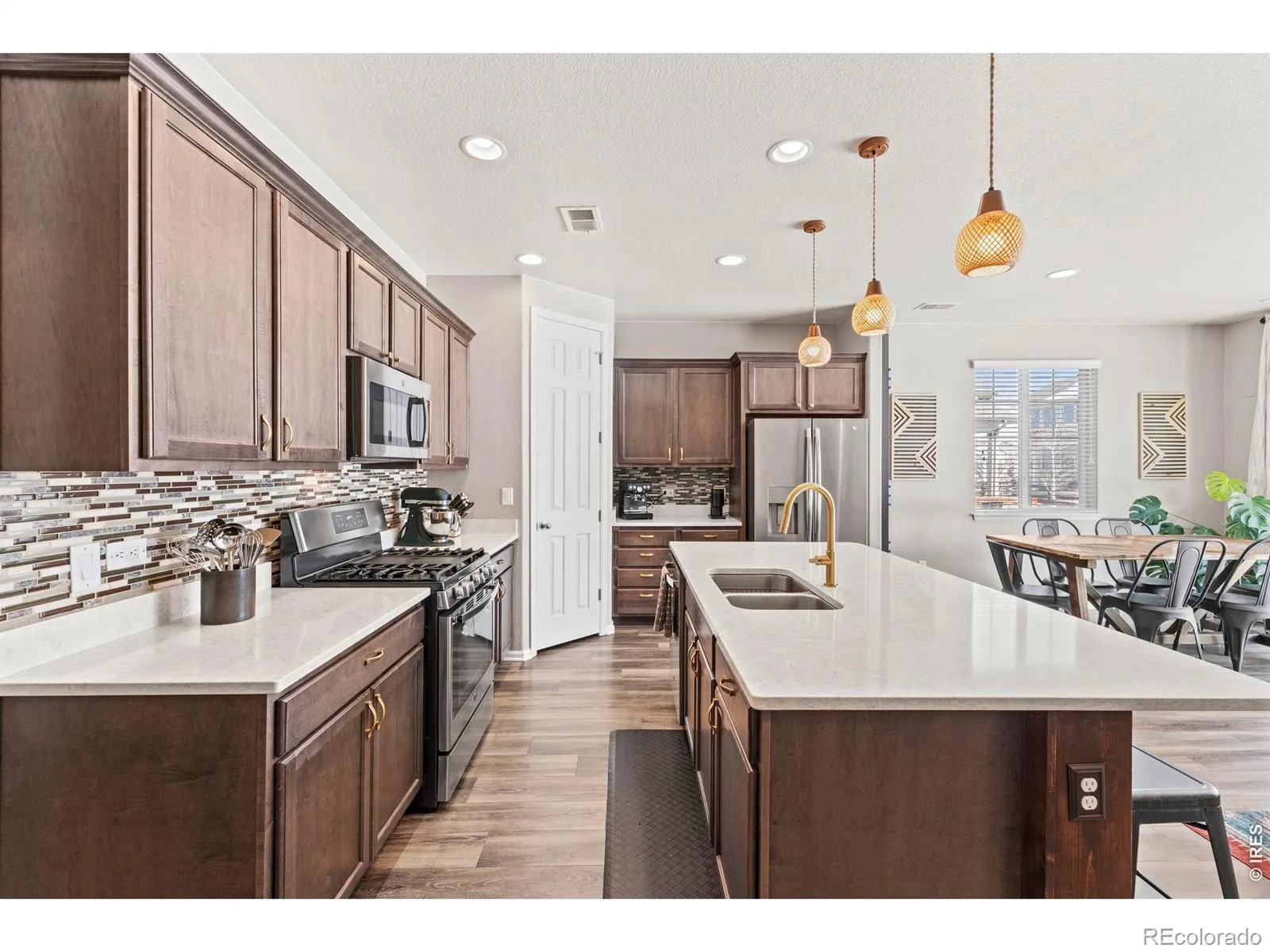 Discover this beautiful three-bedroom ranch-style home in the coveted Lakes at Centerra community in Loveland. Filled with natural light from large windows, your new home features durable luxury vinyl plank flooring and a bright, open floor plan designed for comfortable living. The sprawling kitchen offers stainless steel appliances, quartz countertops, and a generous pantry for added storage. The welcoming great room with separate dining space centers around a cozy gas fireplace with classy woodwork, perfect for relaxing evenings at home. The spacious primary suite provides a peaceful retreat, complete with a large, freshly updated attached bathroom and walk-in closet. You’ll find custom carpentry throughout and truly functional living space. Step outside to enjoy the extended covered patio and fully fenced backyard, ideal for entertaining, pets, or quiet evenings outdoors. An attached, fully finished and insulated two-car garage adds great workspace. Ideally located near Boyd Lake State Park, local trails, schools, and easy access to I-25, this home offers the perfect blend of comfort, convenience, and value in one of Loveland’s most popular communities.