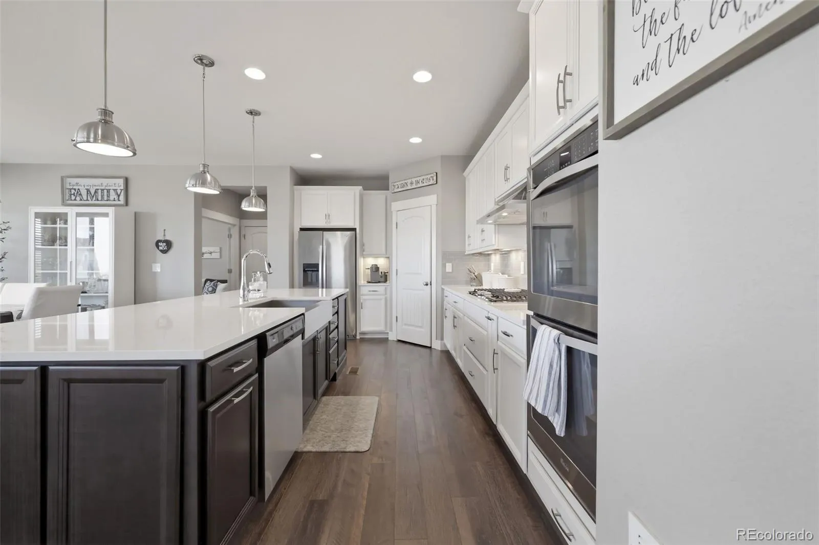 The gourmet kitchen features a 10’ island, quartz countertops, stainless apron sink, double ovens, gas cooktop, walk-in pantry, and extensive cabinetry. It opens to a bright dining area and large family room with a tiled gas fireplace, surround sound, and expansive windows overlooking the open space.