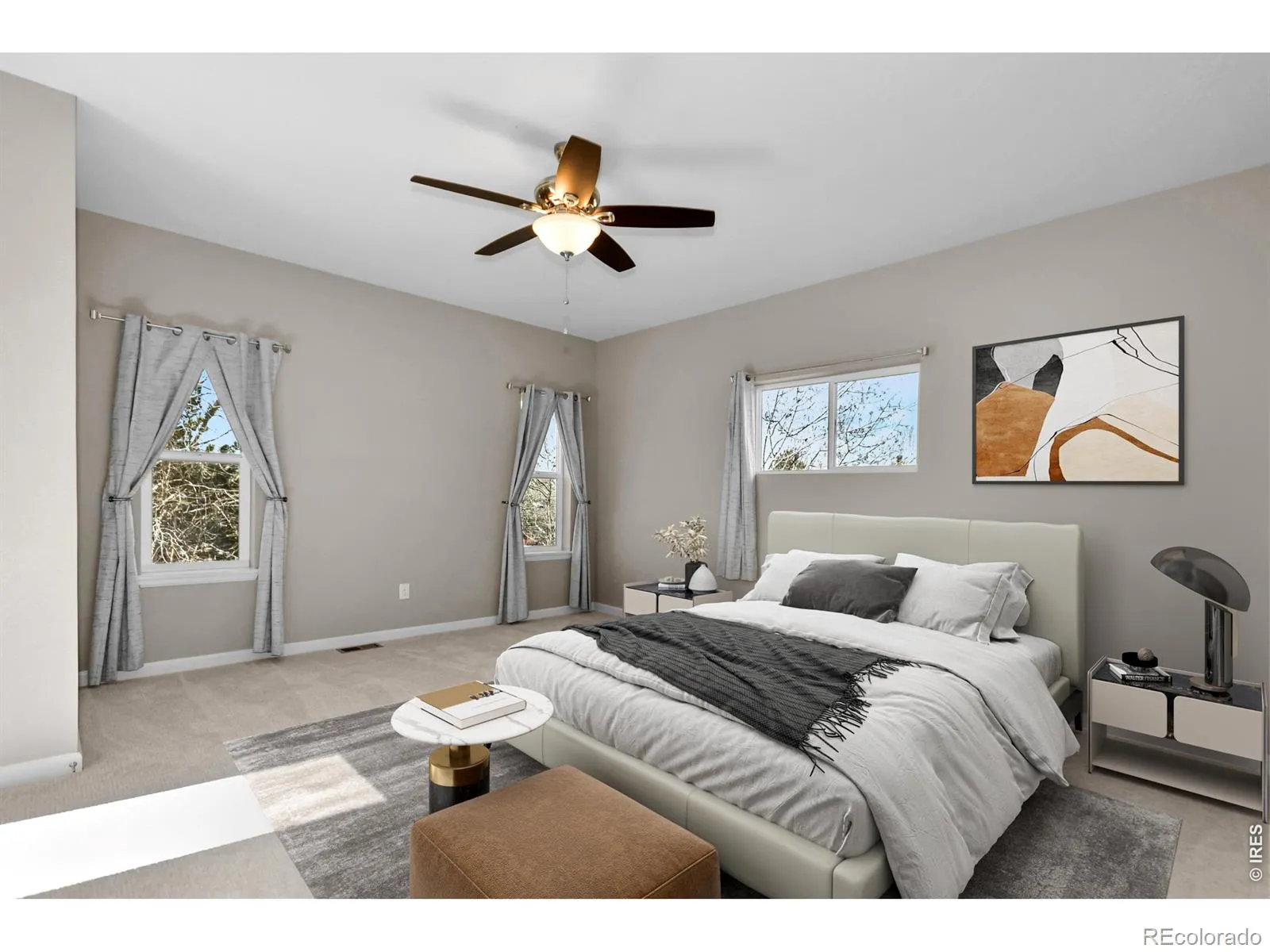 Don’t Wait! 4-bed, 3-bath 2 Story Home in South Loveland! Entering this home you will notice high ceilings with an open floor plan. The spacious living room features a Gas Fireplace and an abundance of natural light. The stunning kitchen is perfect for entertaining with an Island/Breakfast Bar. Retreat to your Primary Suite. You’ll enjoy the beautiful bathroom’s Stall Shower, Walk-in closet and venture out on your Private Balcony to enjoy Fresh Air and Mountain Views! 2 more Bedrooms upstairs plus a Loft and Laundry for convenience. New Carpet, Freshly Painted Interior Main level, and Exterior. Highlights include attached 3 car garage and unfinished basement with room to expand. Conveniently located near schools, dining, shopping, biking trails, Loveland Sport Park, and major roads for an easy commute. This Home also has a less than 3 year old 4.94 KW 13 Panel Solar System that will be Paid Off at Closing. That’s Over a $24K Value to the Buyers plus Future Savings. HOA includes Clubhouse, Pool, Play Area, Common Recreation/Park Area and Hiking/Biking Trails.