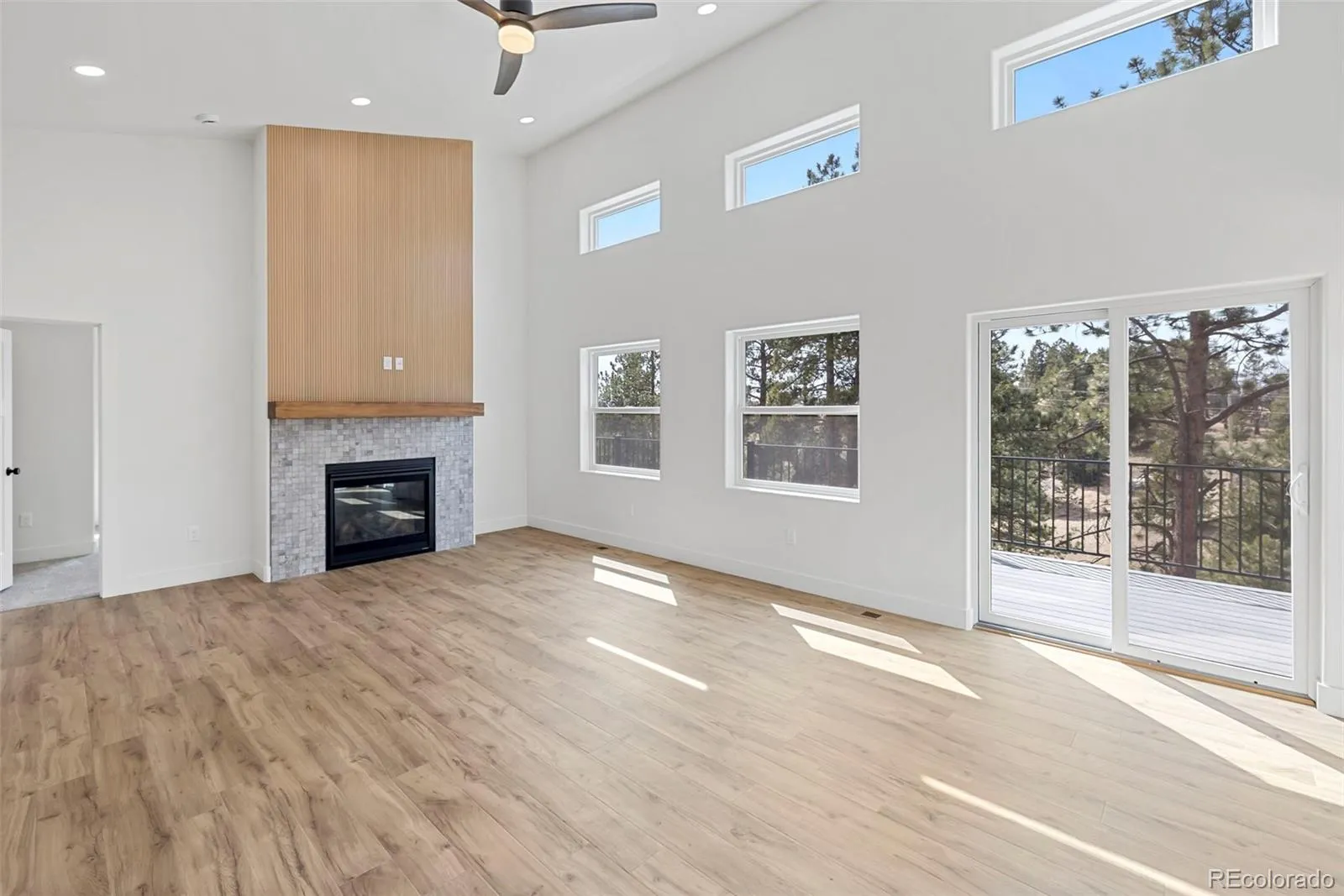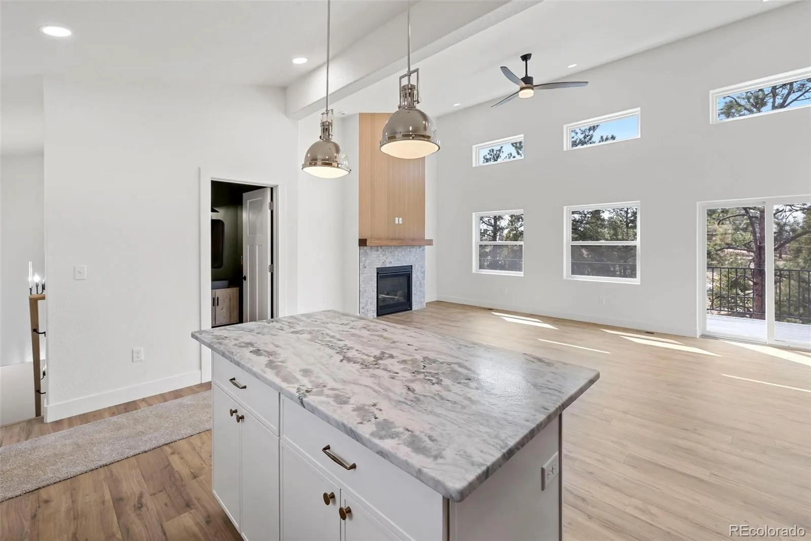 A welcoming front patio invites quiet moments of relaxation, while inside, the home opens to a dramatic great room featuring a soaring wall of Anderson windows and a striking floor-to-ceiling fireplace that frame natural light and mountain views. The adjacent kitchen is both functional and beautifully appointed with Fabuwood cabinetry, granite countertops, tile backsplash, stainless steel appliances, and a spacious island.