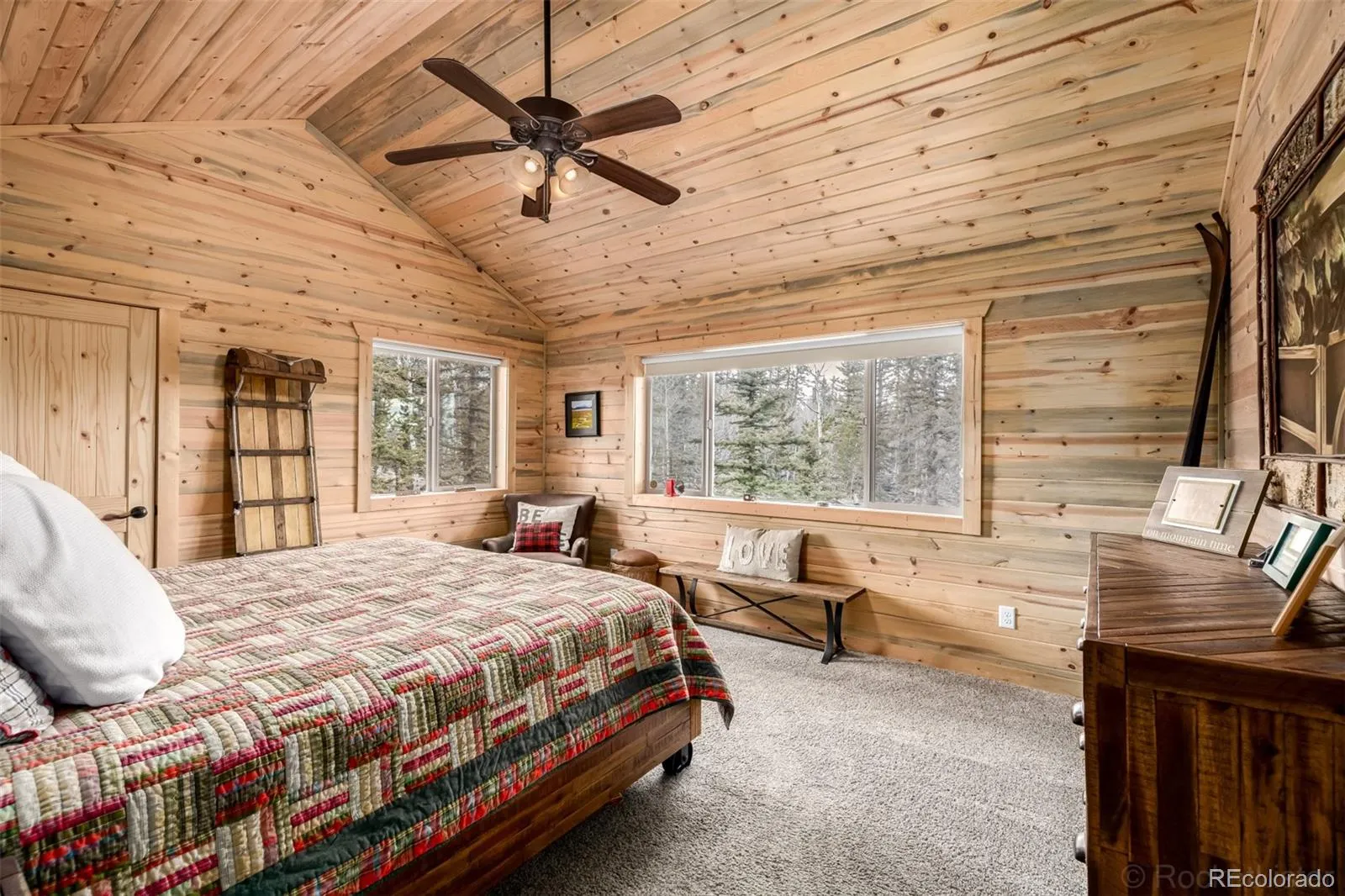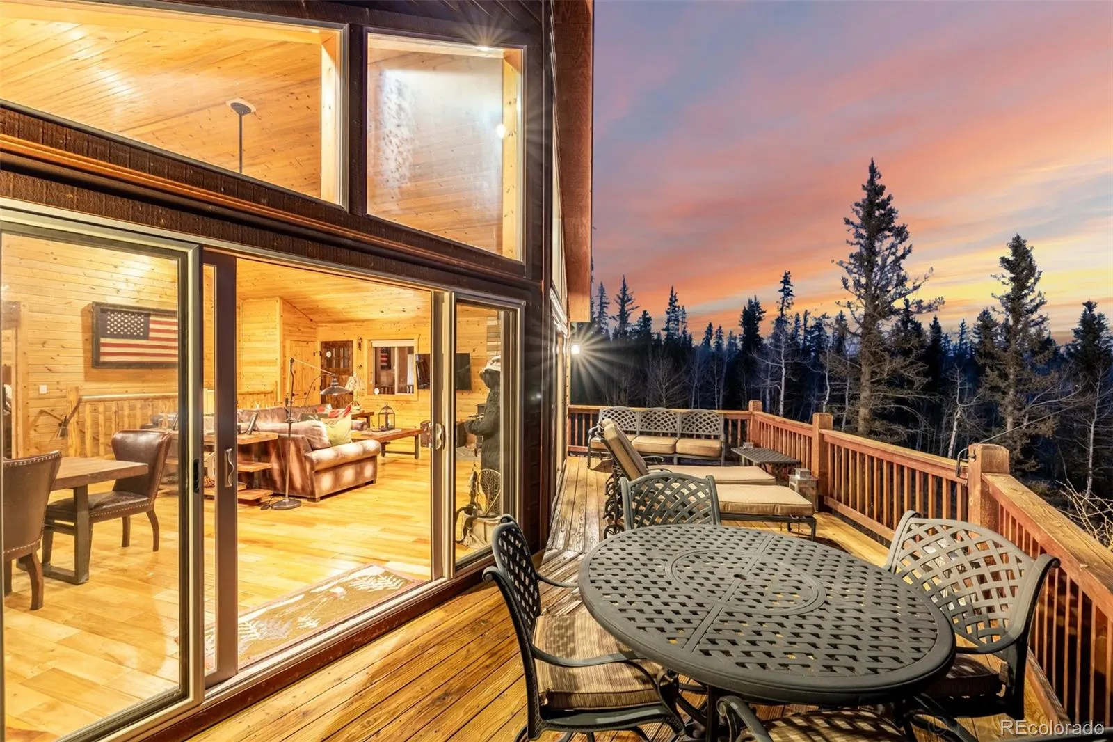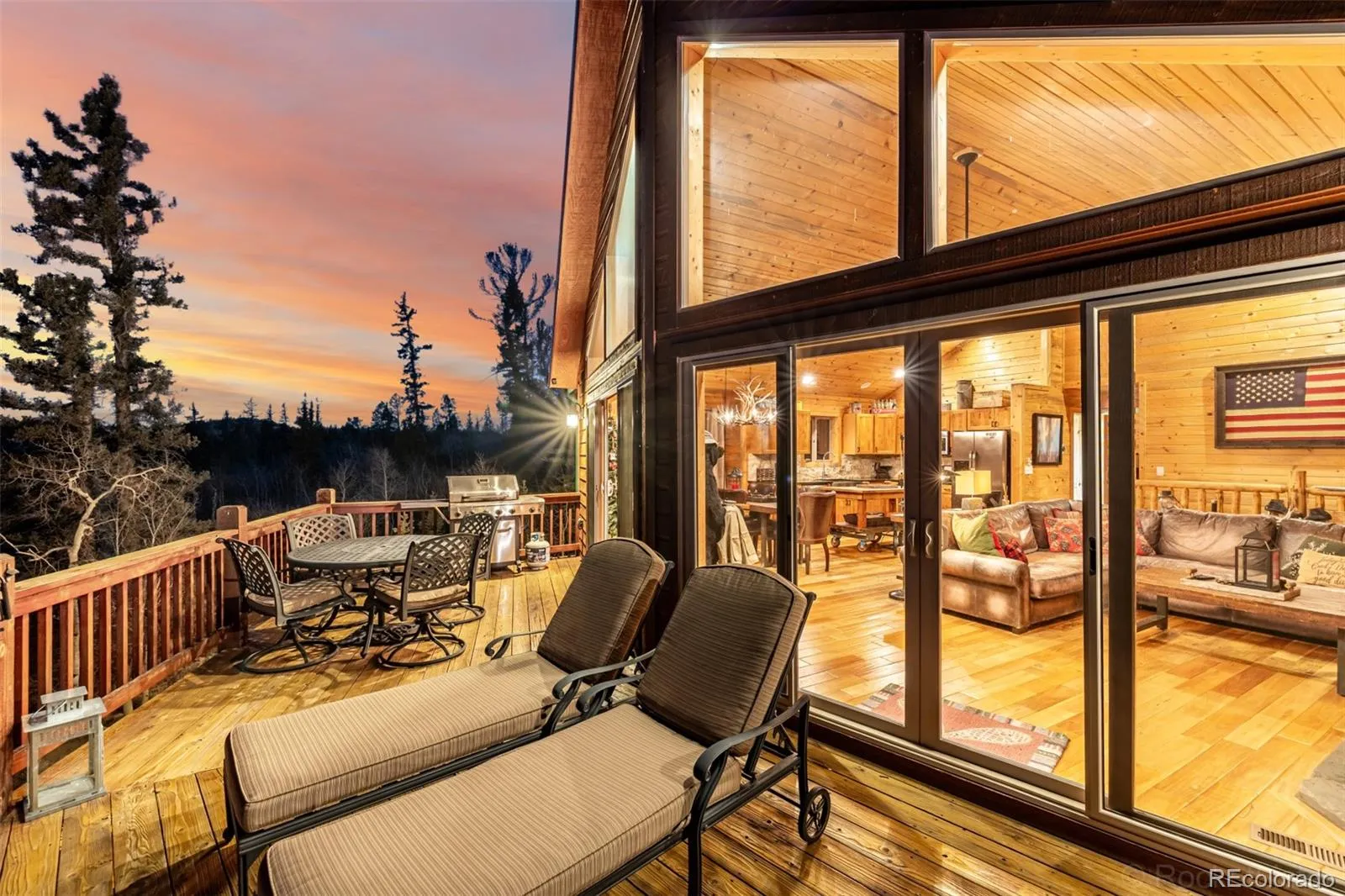 Nestled among towering pines and striking rock outcroppings, this exceptional custom mountain residence offers a rare blend of refined craftsmanship and serene seclusion. Designed with a contemporary mountain aesthetic, the home invites you to escape city life and immerse yourself in crisp alpine air and natural beauty. Begin mornings on the covered porch, where peaceful forest views set the tone for the day. Inside, the open-concept great room is both grand and inviting, featuring soaring tongue-and-groove ceilings, expansive gable-end windows, and rich wood finishes that create warmth and sophistication. A pellet stove and wood-burning stove with tile surround add comfort and ambiance, complemented by recessed lighting and elegant fixtures. The gourmet kitchen is a true centerpiece, appointed with custom knotty cabinetry, granite countertops, a stone backsplash, stainless steel appliances, and a center island with butcher block surface and farmhouse sink—perfect for everyday living and entertaining. Offering three bedrooms and two bathrooms across approximately 2,376 square feet, the home provides comfort and versatility. The primary suite features a spacious walk-in closet and tranquil woodland views, while all bedrooms offer plush carpeting and a peaceful connection to the outdoors. A beautifully finished bath with a garden tub enhances relaxation. The fully finished lower level expands the living space with a walk-out family room ideal for entertaining or guests, along with a utility room featuring laundry and ample storage. Outdoors, enjoy a spacious deck with sweeping mountain vistas, vibrant sunsets, and a covered patio ideal for gatherings. Evenings are best spent around the fire pit beneath a canopy of stars. Backing to a private ranch, the property offers added openness and exclusivity. Offered with many furnishings included, this remarkable property also presents an excellent short-term rental opportunity.