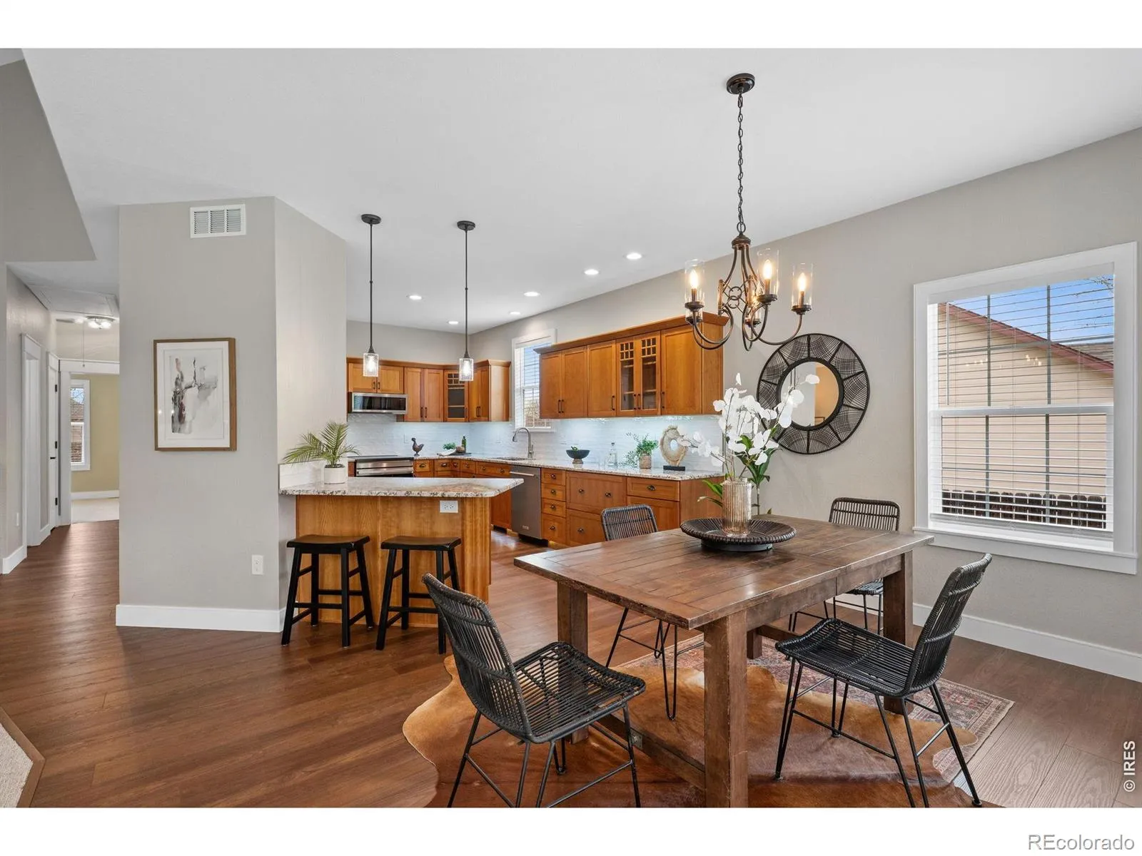 Welcome to this beautifully updated 5-bedroom, 3-bath home offering 3,797 square feet of thoughtfully designed living space on a spacious 0.30-acre lot. From the moment you arrive, you’ll appreciate the charming covered front porch, attractive stone accents, and inviting curb appeal.Inside, soaring vaulted ceilings and abundant natural light create an open, airy feel throughout the main living areas. The spacious living room flows seamlessly into the dining area and kitchen, making it ideal for both everyday living and entertaining.The updated kitchen is a standout with rich cabinetry, granite countertops, tile backsplash, stainless steel appliances, and a large center island with seating. The adjacent dining space is surrounded by windows and offers direct access to the covered patio.Step outside to enjoy the expansive backyard featuring a large covered patio, mature landscaping, and plenty of room to relax, entertain, or create your ideal outdoor retreat.The primary suite provides a private retreat with generous space and a beautifully updated en-suite bath featuring dual vanities, a soaking tub, and a separate glass-enclosed shower.The finished basement offers exceptional versatility with two additional bedrooms, a full bathroom, a dedicated office, and a separate gym space. Expansive living areas and abundant storage provide flexibility for a variety of needs including work, fitness, and recreation.A dedicated laundry room adds convenience, while the oversized 2.5-car garage offers extra storage, workspace, and functionality.With its modern updates, open layout, impressive square footage, and exceptional indoor and outdoor living spaces, this home delivers comfort, flexibility, and lifestyle in a desirable Greeley location.
