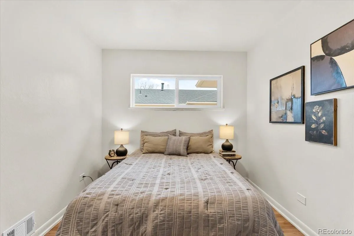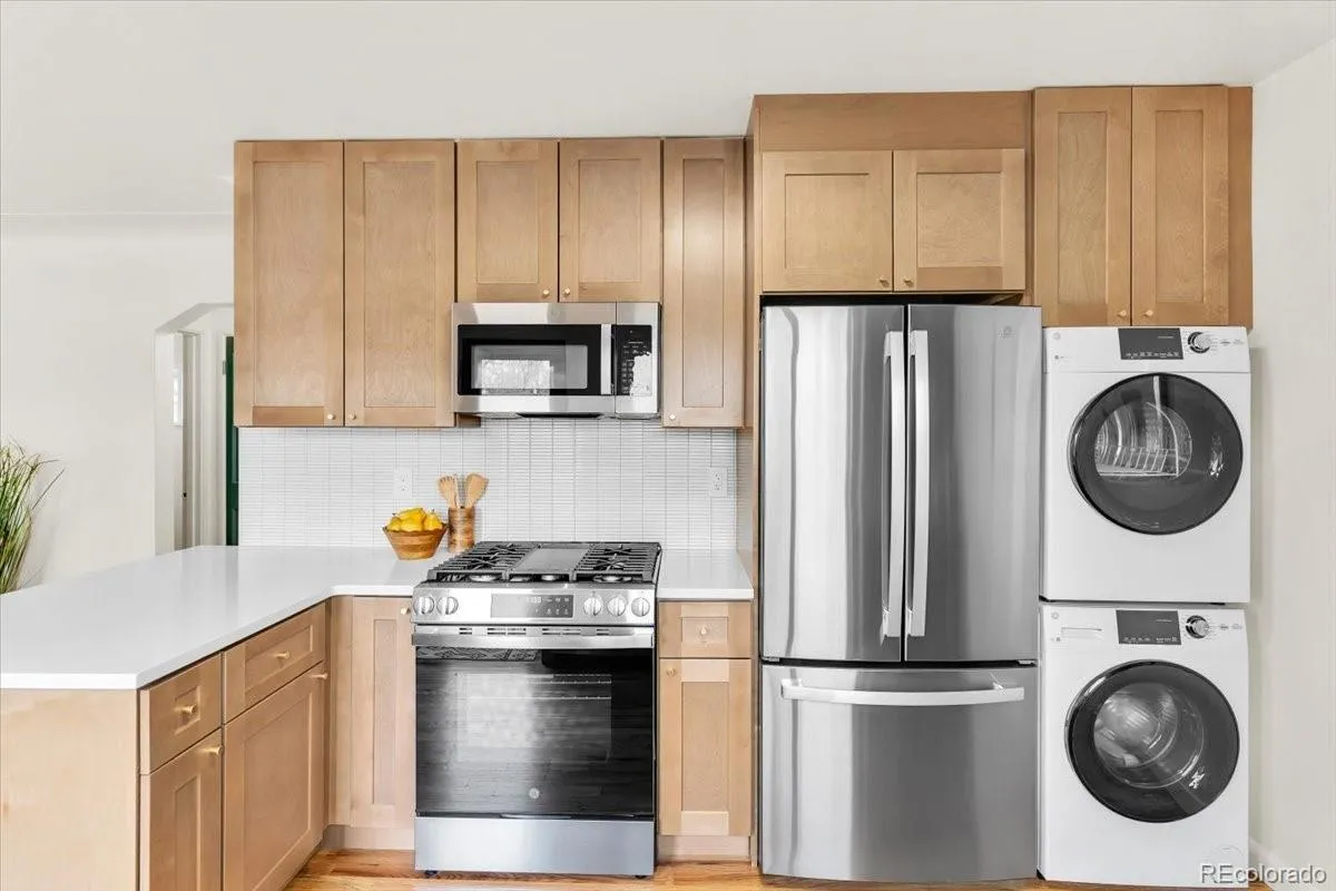 Ask us how to get a lower interest rate with $8,000 lender credit using our preferred lender! Check out this cozy chic 2 Bedroom 1 bath townhome in North Park Hill with NO HOA! Walk into open concept living and dining. The kitchen is the highlight of the home featuring an eat-up peninsula, quartz counters, gas range with over the range microwave, a beautiful backsplash, new solid-wood cabinets, new GE stainless steel appliances, and gold hardware. Move into the hallway and find yourself at the spa-like bathroom. Completely updated with Zellige-style tile and new finishes for a modern aesthetic. 2 spacious bedrooms on either side of the hallway. Flowing naturally from the living dining area out through the back door you have your private yard with artificial turf for easy maintenance. Fully fenced in front yard with front porch area is perfect for relaxing with a cup of coffee, some gardening, letting the pup play, and waiving to the neighbors. The unique Colorado Red Sandstone brick gives this building a native Denver flavor. This home is truly move in ready with nearly everything updated including new roof, new windows, tankless water heater, new HVAC, and brand new washer/dryer included. Off street parking included. Some local favorites close by: Ruby’s Good Shoes, the shops and dining at Park Hill Commons, two blocks to Skyland park, public library, and rec center. Shopping/dining in Central Park nearby as well! Easy access to downtown or I70 to the mountains. Make it home while you can!