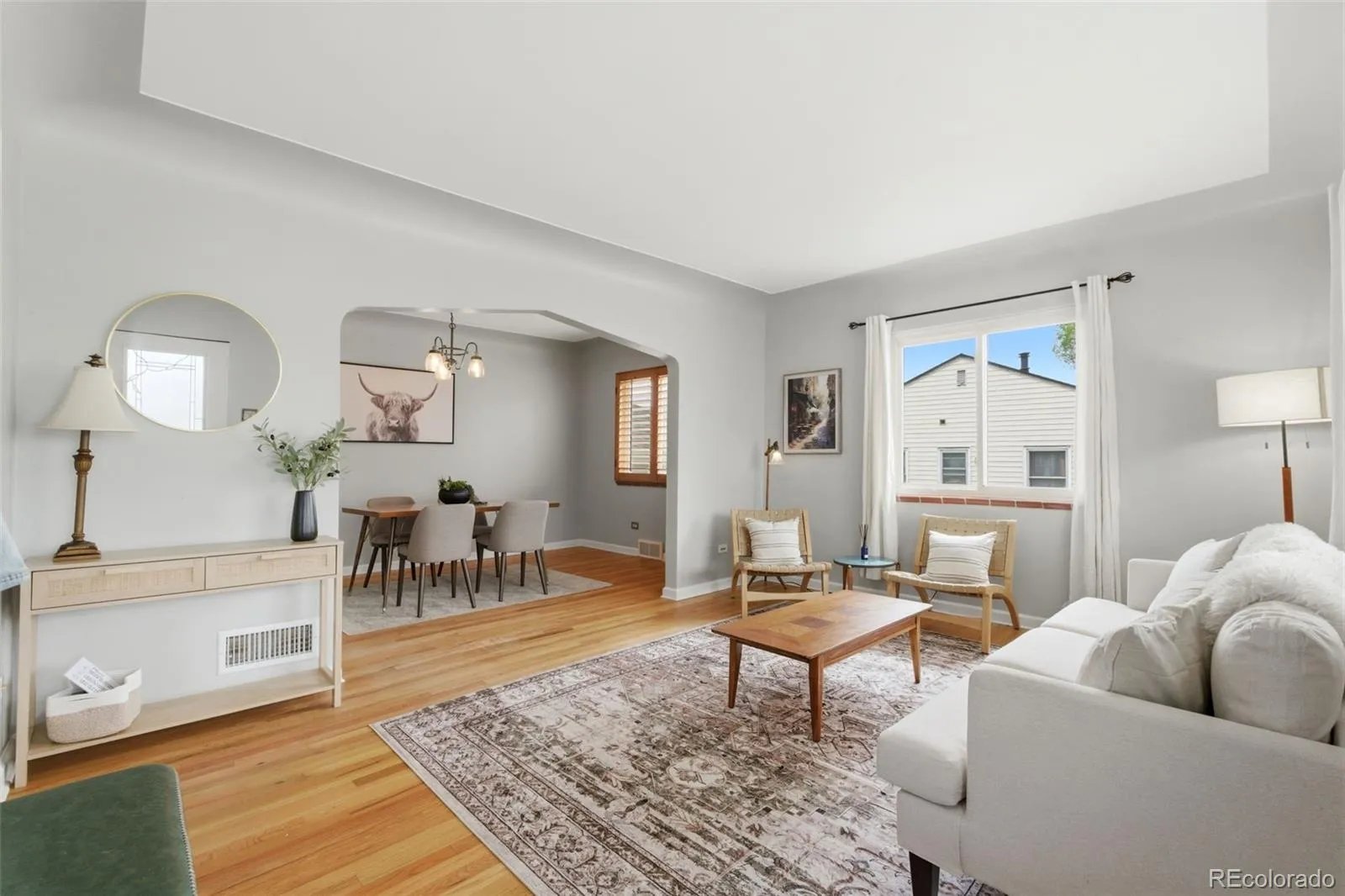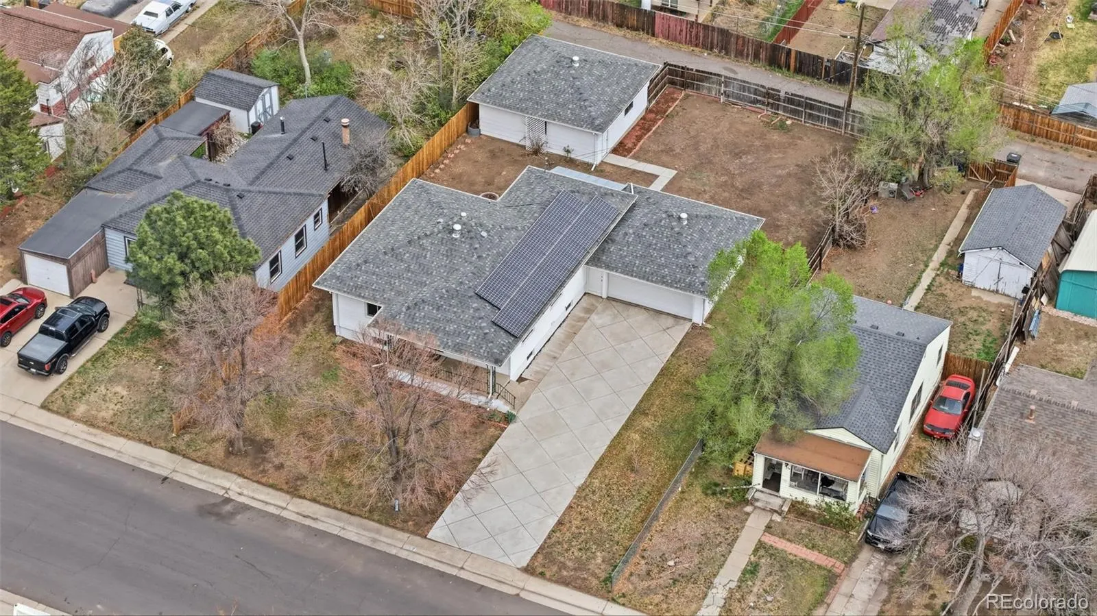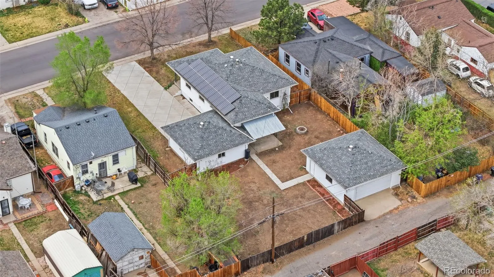 The highlight of this 3-bed, 2-bath Valverde home is the TWO two-car garages! Plus this Valverde home offers tons of potential with over 800 unfinished square feet in the basement. In front, two trees frame this classic home with rose bushes and a covered front porch. The new driveway and paid-off solar system add practical upgrades. Inside, the charm of this 1951 home shines through with beautiful wood floors, cove ceilings, and a graceful arched opening connecting the living and dining rooms. The main level features a large front bedroom that connects through a spacious Jack-and-Jill bathroom to another back bedroom. The kitchen offers plentiful cabinetry, an island, granite counter, and a wall of pantry storage. The house has central air/furnace plus evaporative cooling. The finished attached two-car garage has a brand new smart controller for the 9 zone sprinkler system that was just repaired and is now in working order. Step outside to the covered back porch and fenced backyard, ready for your vision. This home sits on a huge 9,520 SqFt lot (0.22 acres) with E-SU-DX zoning allowing for an Accessory Dwelling Unit (ADU). The oversized detached two-car garage accessed from the alley provides additional parking, workshop space, and storage. The full basement includes one finished non-conforming bedroom plus a basic bathroom area with a toilet and shower (no sink). The rest of the basement remains unfinished, including the laundry room with washer, dryer, utility sink, furnace, tankless water heater, and water softener. A 30’ x 14’ insulated, unfinished space could easily be finished into an amazing rec room while still leaving room for another bedroom and additional storage under the porch. Located just south of convenient 6th Avenue, this home offers quick access to downtown Denver and the mountains, plus 15 minutes to Wash Park/South Broadway, and 15 minutes to Sloans Lake/Highlands. Plus you will be only 8 minutes from the new Broncos Stadium at Burnham Yard!