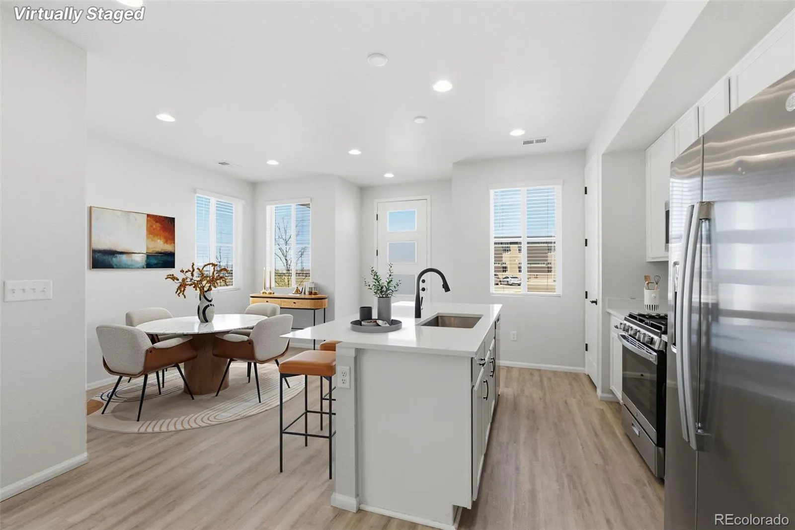 Turn-key townhome in the sought-after Aurora Highlands community, offering a bright and airy feel with elevated ceilings and an open, easy-living layout. The kitchen serves as the heart of the home, featuring a spacious island, quartz surfaces, abundant cabinetry, and pantry storage—all opening effortlessly to the dining and living spaces. Step out to your private, fenced patio—an ideal spot to unwind, whether starting your morning or winding down in the evening. The main level also includes a powder bath, additional storage, and a two-car attached garage. Upstairs, enjoy the convenience of all three bedrooms and a centrally located laundry area. The primary suite provides a comfortable retreat with a walk-in closet, dual sinks, and a generous walk-in shower. Two additional bedrooms offer flexibility for a variety of needs. Ideally situated near a greenbelt, parks, and community amenities, with access to a recreation center featuring a resort-style pool. Convenient proximity to DIA and the Anschutz Medical Campus adds to the appeal. Well-designed, well-located, and ready to go—this home checks all the boxes.