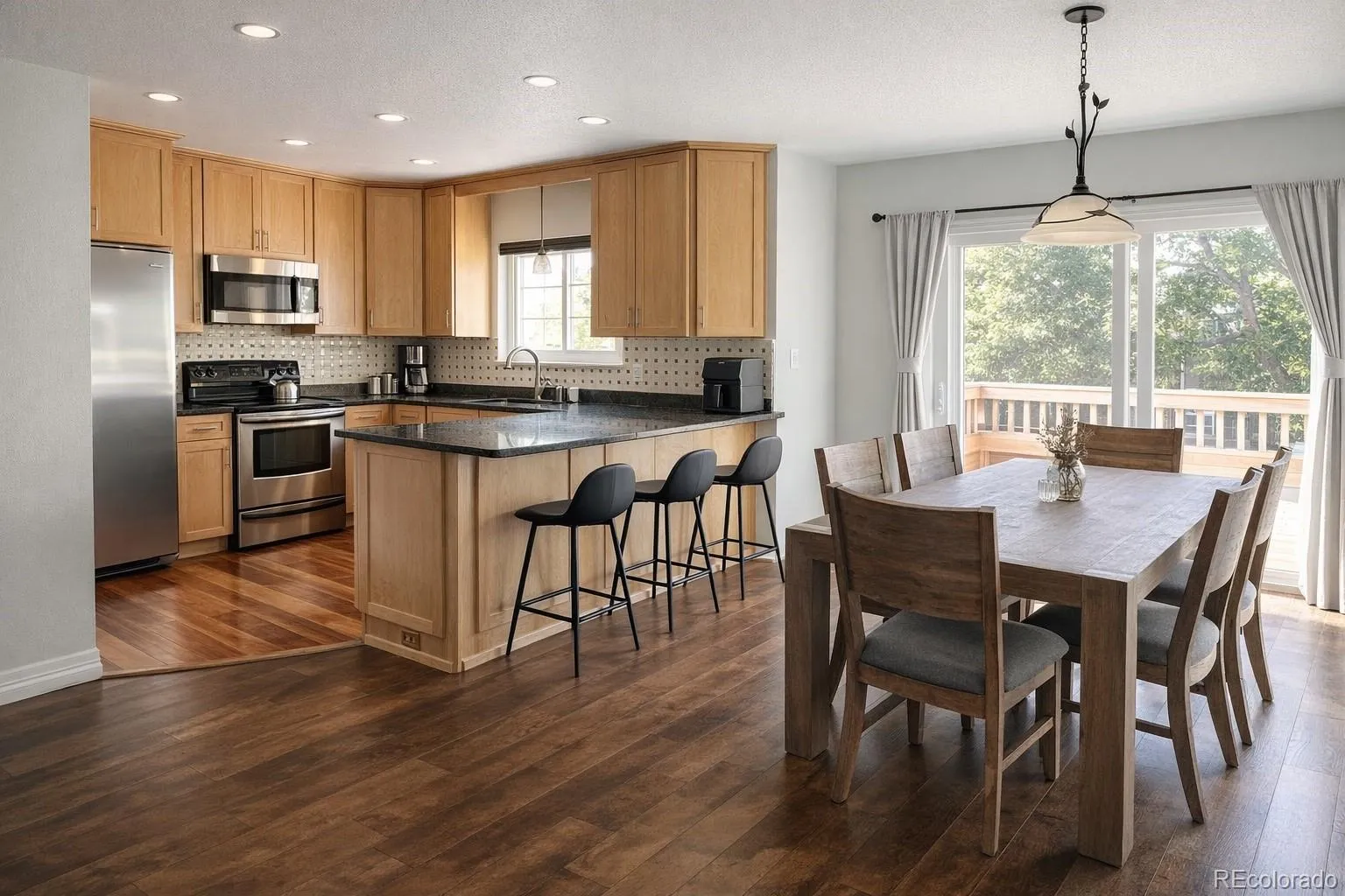 Step inside to a bright and inviting main level where warm flooring, abundant natural light, and an open layout create a welcoming atmosphere. The spacious living room is anchored by a cozy fireplace and flows seamlessly into the dining area with sliding glass door access to a private balcony—perfect for morning coffee or evening relaxation. The kitchen features granite countertops, stainless steel appliances, and ample cabinetry, ideal for both daily living and entertaining. A convenient powder bath completes the main level.