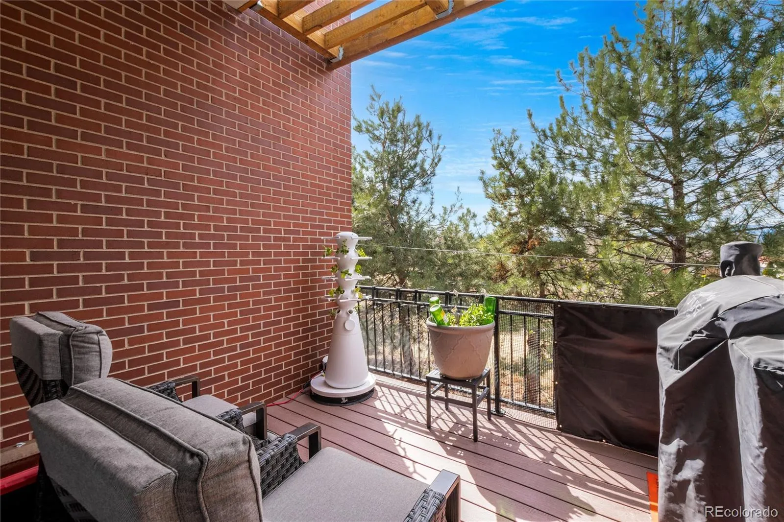 The living room opens to a covered west-facing balcony overlooking a community garden, creating a quiet outdoor setting with added privacy. A secondary outdoor patio on the lower level provides additional flexibility for entertaining or relaxing.