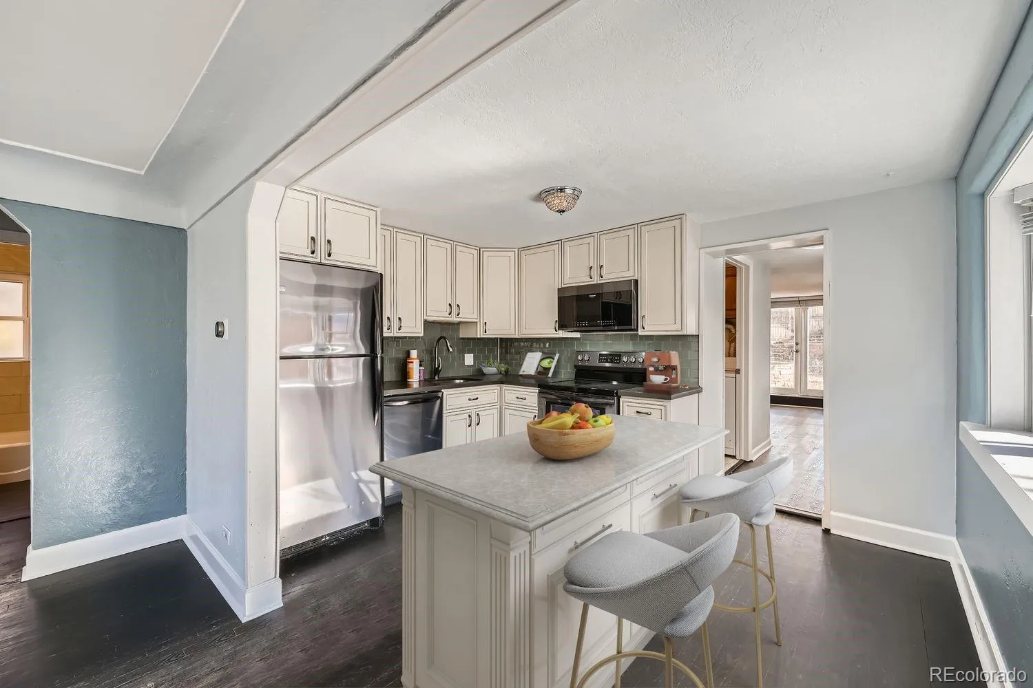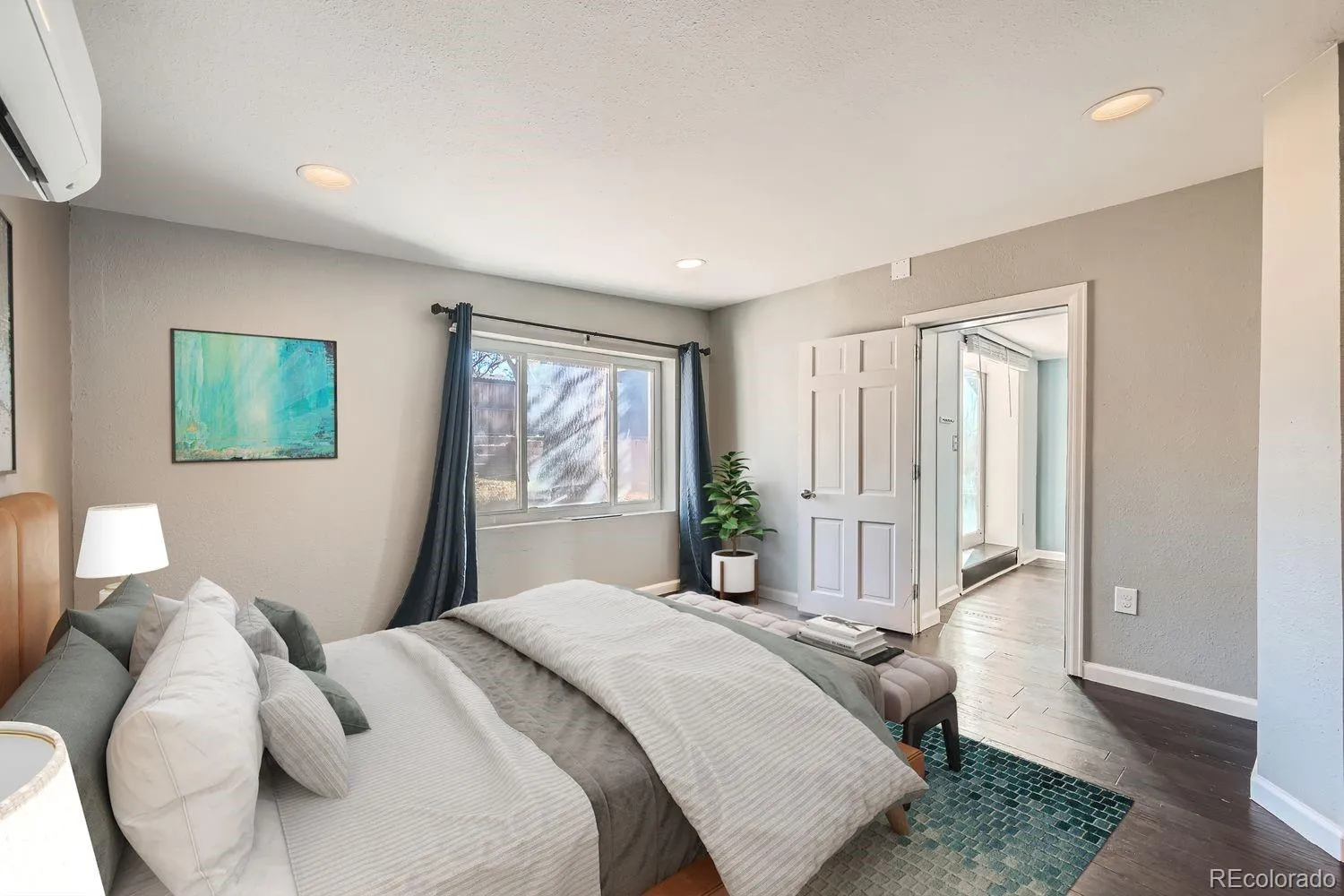Lovely brick ranch home, single-level 3-bed/2-bath in Englewood’s Evanston neighborhood with smart upgrades to the major systems. A brand-new $25,000 dual heat pump HVAC system delivers year-round energy efficiency with both heating and cooling covered under one setup, paired with a new water heater. The kitchen features updated countertops, modern cabinetry, and a full appliance suite including a self-cleaning oven, microwave, dishwasher, disposal, and refrigerator. The primary suite offers a walk-in closet and an en-suite bath with heated tile floors and a spacious walk-in shower. A second full bathroom with modern fixtures serves the two additional bedrooms. Hardwood floors and double-pane windows run throughout the 1,267 sqft of single-level living space. Walk outside to a private fenced backyard with a walkout patio, a large storage shed, and irrigated, landscaped grounds. A gated two-car concrete parking pad provides secure off-street parking. All with easy walking access to South Broadway, Old Hampden restaurants and bars, Swedish Hospital, and Cherry Hills Village just minutes away.