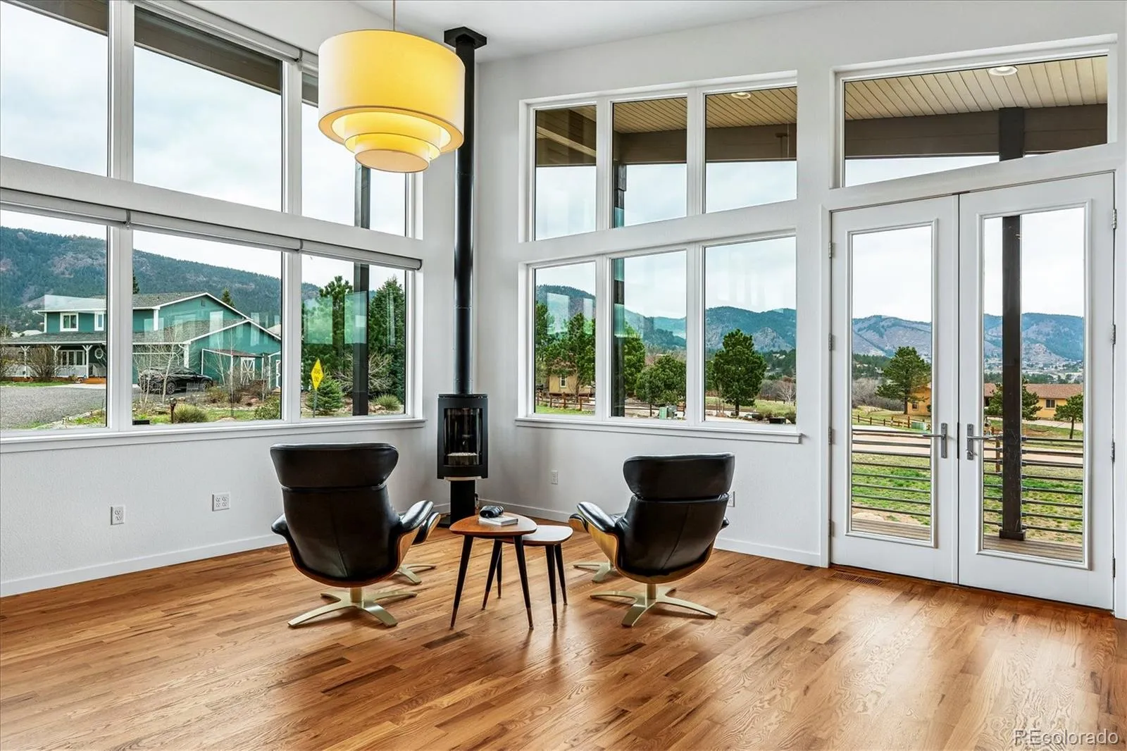 Tucked along the edge of the Pike National Forest in the Cloven Hoof Estates, this custom-built Mid-Century Modern home by Bison Builders offers a rare blend of architectural style, privacy, and Colorado beauty. Set on a .77-acre lot near Monument Lake, the home captures stunning views from nearly every angle including the fireworks in Palmer Lake, with a wraparound composite front deck and a private patio featuring a hot tub, perfect for soaking in the serenity. Inside, the open-concept design is elevated by soaring ceilings, expansive custom windows, solid wood doors, architectural embellishments, and a seamless connection to the outdoors. Appreciate a level of quality in the trim and finish of this home which is outstanding. The kitchen is both sleek and functional, showcasing iced white quartz countertops, soft-closing European cabinetry, mahogany accents with thoughtful modern finishes. Two Jøtul cast iron fireplace stoves with built-in fans anchor the living spaces, adding warmth and character. The home offers 4 bedrooms plus a dedicated office or workout room, along with 4 bathrooms. The main-level primary suite provides a private retreat with an ensuite bath and heated tile floors, while the basement features a fully functional stand-alone suite with a lock-off option—ideal for guests, multigenerational living, or potential rental flexibility. The lower-level suite has a private entrance, living room, dining area, kitchen and more. Additional highlights include: main level solid oak flooring with zero height thresholds, a 2.5-car garage wired for electric car charging, DogWatch electric fence, and a whole-house humidifier for year-round comfort. With nearby hiking and biking trails, parks, and open spaces, residents can easily immerse themselves in the breathtaking landscapes that Colorado is renowned for. This is living at its finest, where timeless design meets the quiet luxury of nature, just minutes from the heart of Monument.