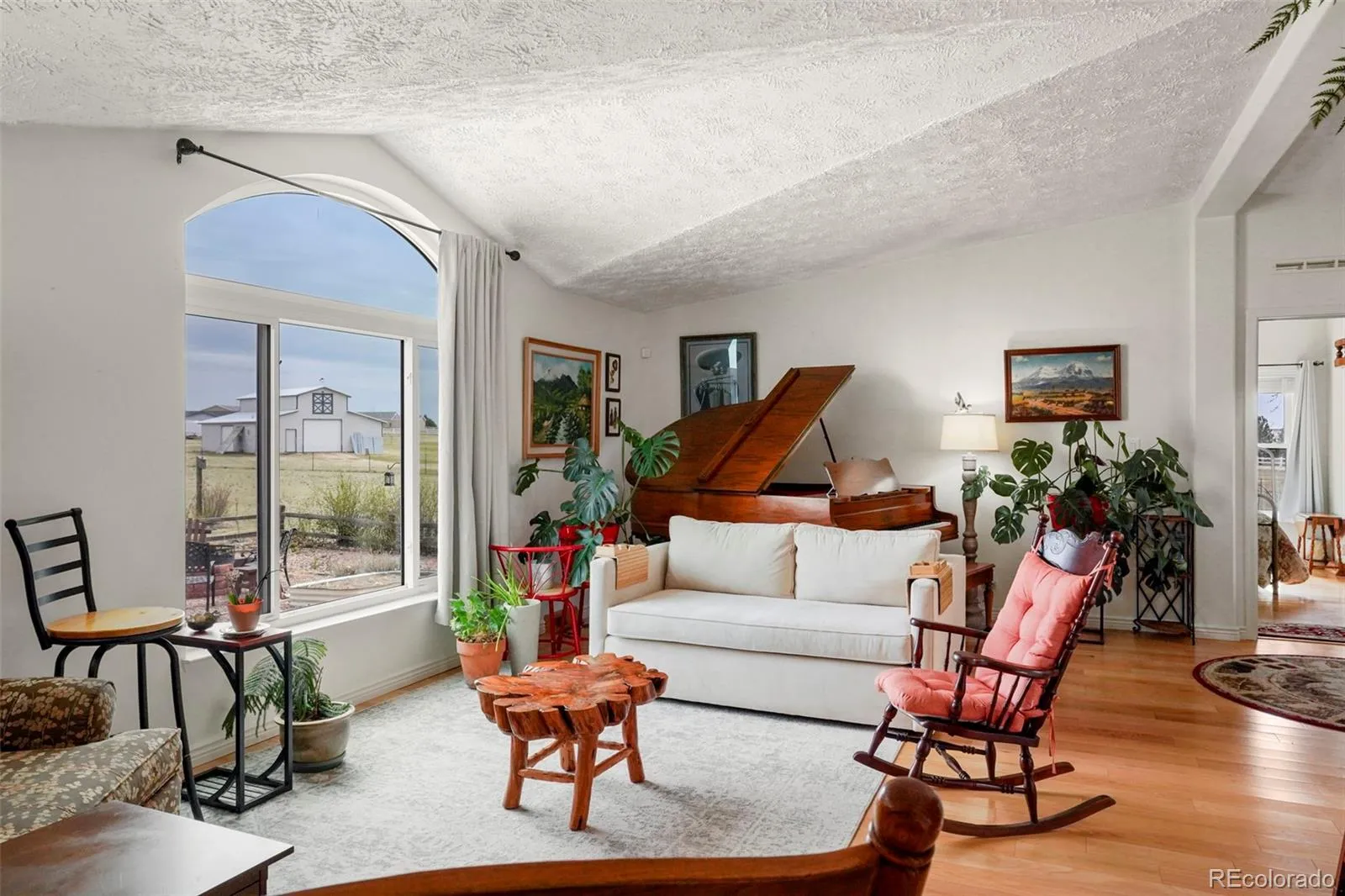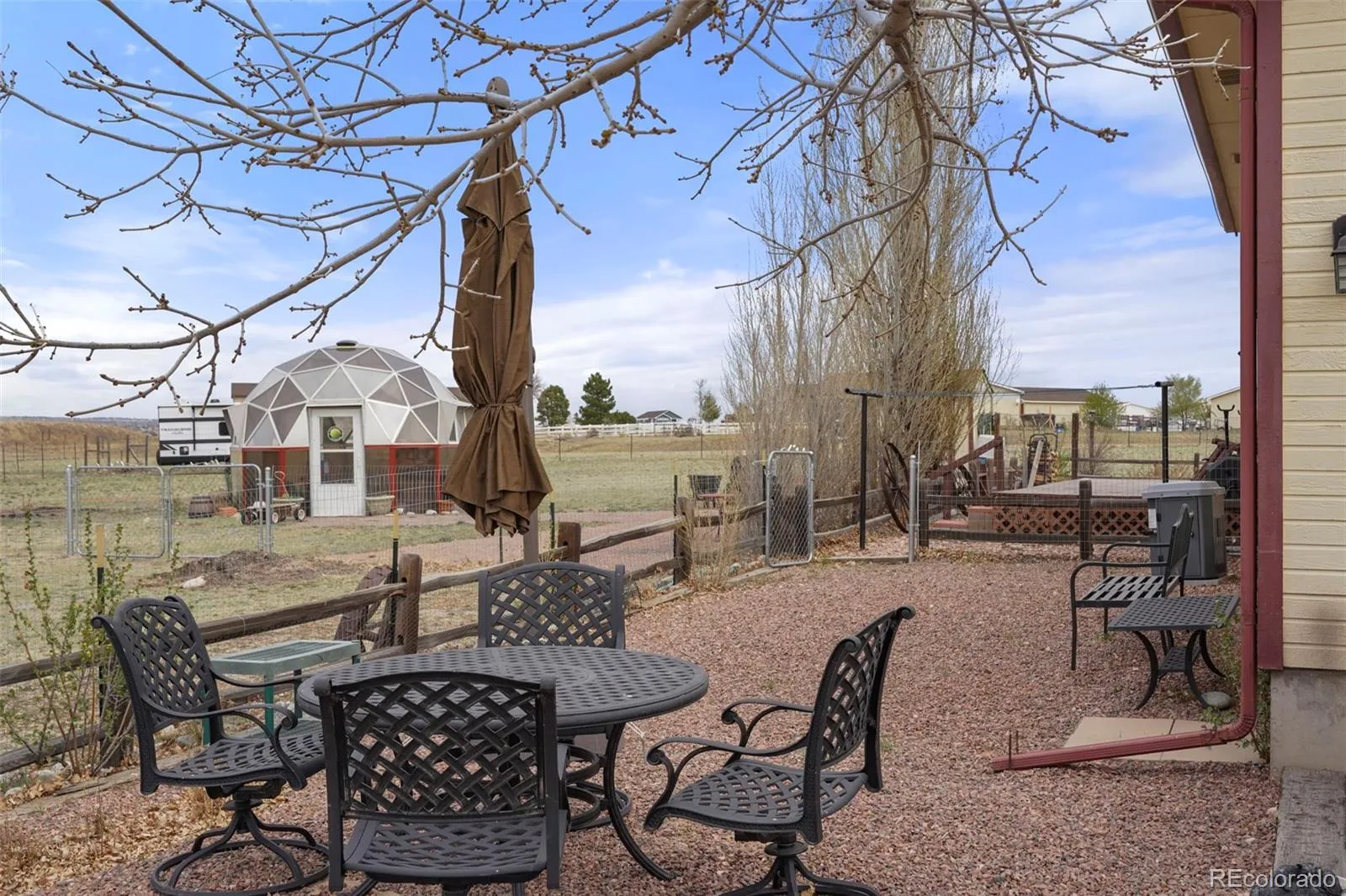 Set on expansive, fenced acreage with wide-open views in every direction, this well-maintained Peyton property offers a sense of space and privacy. The setting feels tucked away and peaceful, with minimal through traffic and a layout that gives each home room to breathe, while still being within reach of everyday essentials. The ranch-style layout is designed for comfortable main-level living, with natural light pouring through large windows and an arched picture window that frames the surrounding landscape. The living area feels open and welcoming with vaulted ceilings and warm wood flooring, flowing easily into a functional kitchen featuring abundant cabinetry, a central island, and skylights that keep the space bright throughout the day. The dining area connects directly to the deck, creating an easy transition for indoor-outdoor living. The primary suite offers a spacious retreat with a five-piece bath, including a soaking tub positioned to take in soft natural light. The finished basement adds flexibility with a bedroom, bathroom, and a large open area that can adapt to your needs, whether for additional living space, hobbies, or a home office. The fully fenced acreage provides a secure environment for pets while still offering plenty of usable space. Thoughtfully arranged outdoor areas include multiple seating spaces, a fire pit, garden beds, and a greenhouse dome for year-round growing or creative use. New soaker hoses have been installed in all perennial beds, making ongoing maintenance more efficient and keeping everything thriving with ease. A private deck overlooks the yard, creating a comfortable place to relax and take it all in. The attached garage includes a handicap-accessible ramp, adding an extra layer of functionality and accessibility. With its quiet setting, usable land, and thoughtfully designed outdoor spaces, this property offers a lifestyle centered around comfort and flexibility.