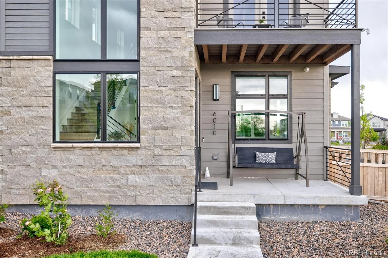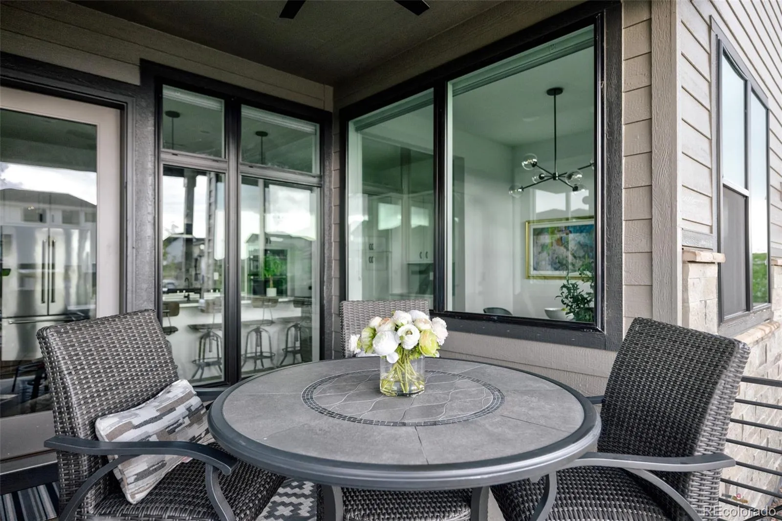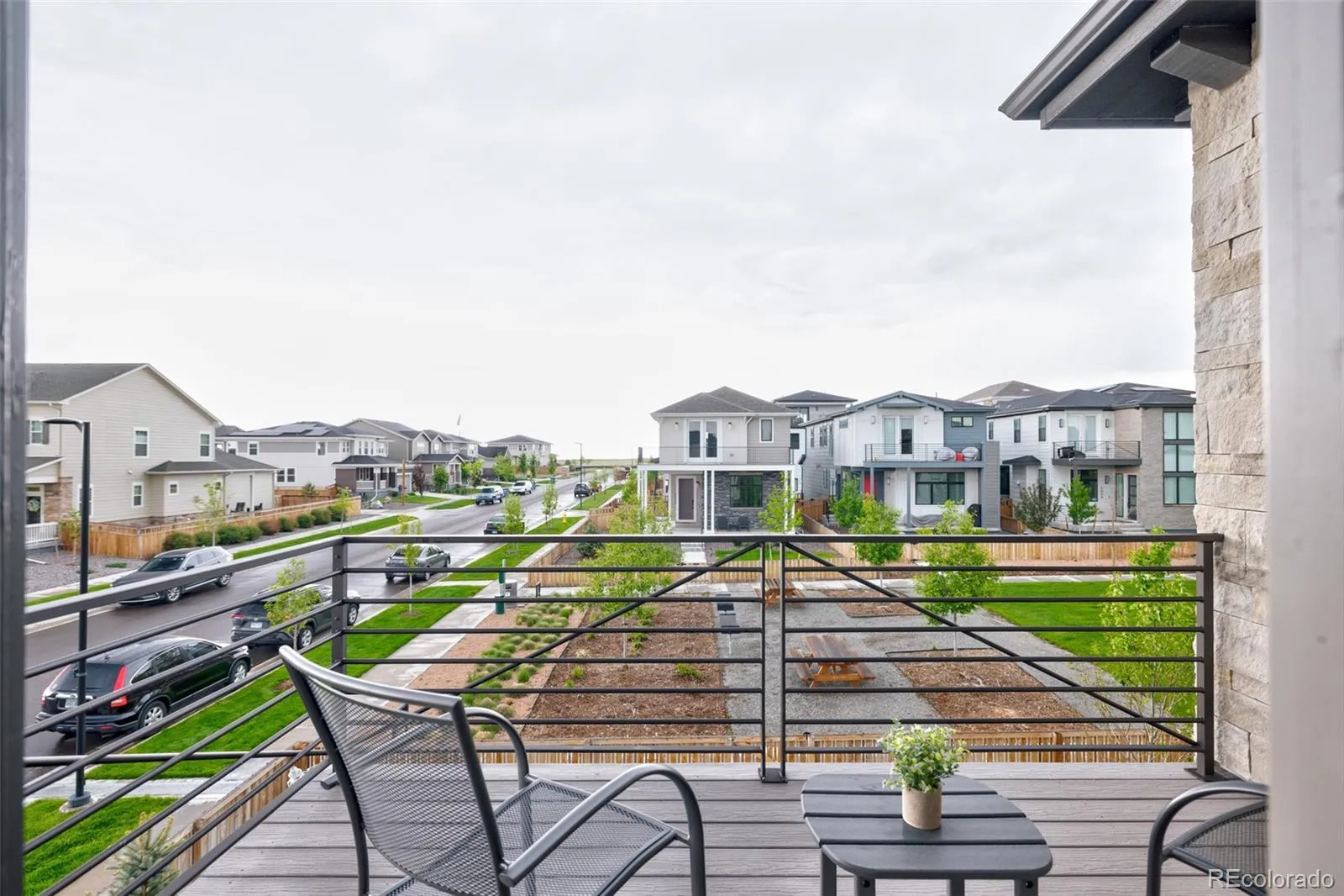 Experience elevated living in this stunning contemporary home in Painted Prairie, where high-end finishes meet effortless, low-maintenance living. Thoughtfully designed with clean lines and modern touches throughout, this home offers both style and comfort in every space. A fully fenced front entrance opens to a welcoming courtyard with picnic tables, trails to explore, and green space—perfect for enjoying Colorado’s beautiful seasons. Inside, a bright, open foyer showcases a sleek horizontal railing that creates a striking, floating staircase effect. The gourmet kitchen is a true centerpiece, featuring quartz countertops, a custom backsplash, stainless steel hood, 5-burner gas cooktop, and an expansive eat-in island—plus beautiful mountain views to inspire your cooking. Adjacent, the dining area glows under designer lighting and overlooks the private yard, while the spacious living room is filled with natural light from oversized windows and enhanced by custom fixtures. Upstairs, the luxurious primary suite offers a private balcony with unobstructed mountain views, a spa-like bath with an oversized tiled shower and bench, dual quartz vanities, and a custom walk-in closet. Two additional bedrooms, a stylish full bath, and a versatile loft provide flexible living space for work or relaxation. Welcome home!