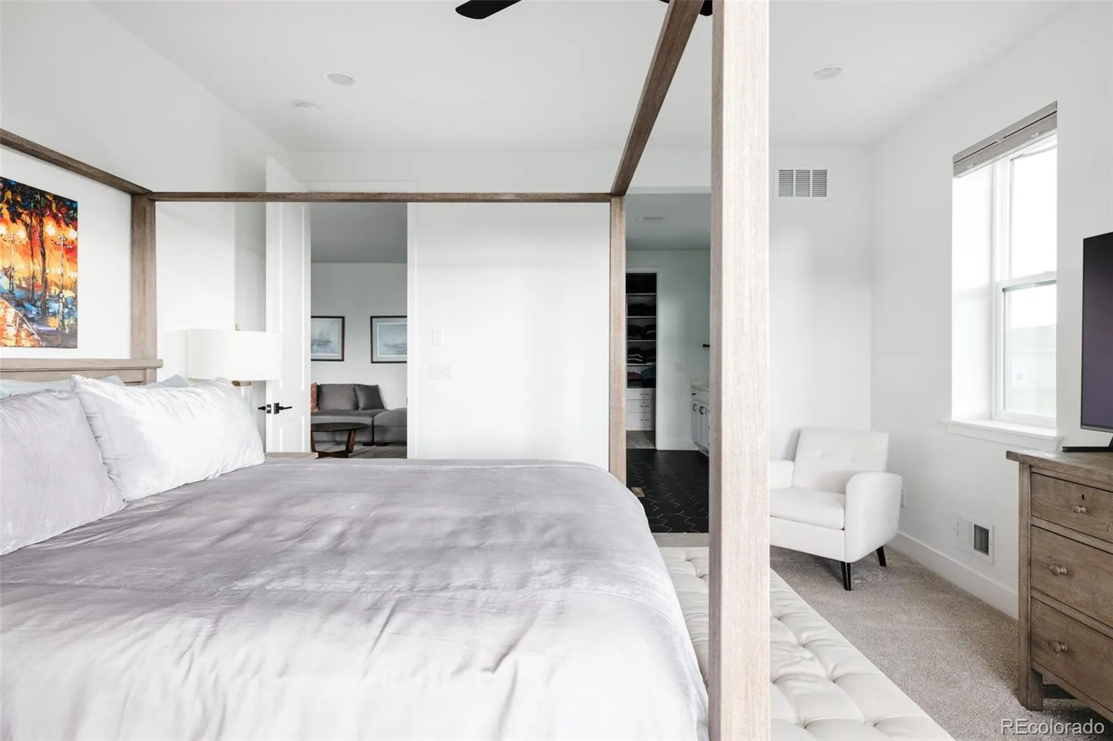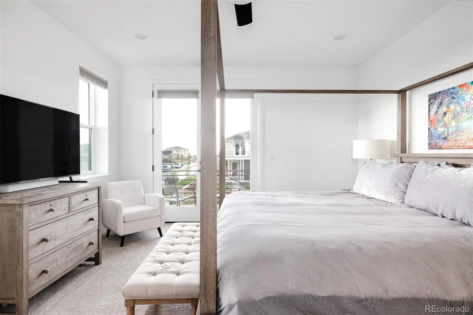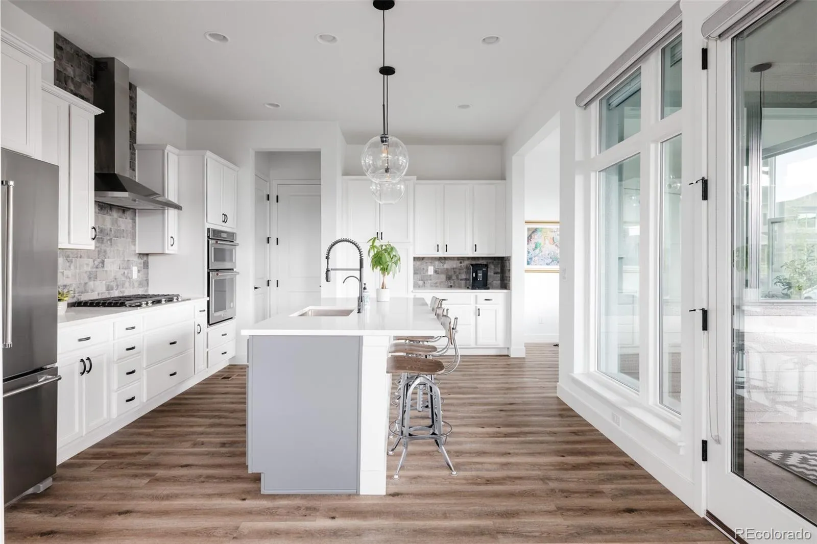 Experience elevated living in this stunning contemporary home in Painted Prairie, where high-end finishes meet effortless, low-maintenance living. Thoughtfully designed with clean lines and modern touches throughout, this home offers both style and comfort in every space. A fully fenced front entrance opens to a welcoming courtyard with picnic tables, trails to explore, and green space—perfect for enjoying Colorado’s beautiful seasons. Inside, a bright, open foyer showcases a sleek horizontal railing that creates a striking, floating staircase effect. The gourmet kitchen is a true centerpiece, featuring quartz countertops, a custom backsplash, stainless steel hood, 5-burner gas cooktop, and an expansive eat-in island—plus beautiful mountain views to inspire your cooking. Adjacent, the dining area glows under designer lighting and overlooks the private yard, while the spacious living room is filled with natural light from oversized windows and enhanced by custom fixtures. Upstairs, the luxurious primary suite offers a private balcony with unobstructed mountain views, a spa-like bath with an oversized tiled shower and bench, dual quartz vanities, and a custom walk-in closet. Two additional bedrooms, a stylish full bath, and a versatile loft provide flexible living space for work or relaxation. Welcome home!