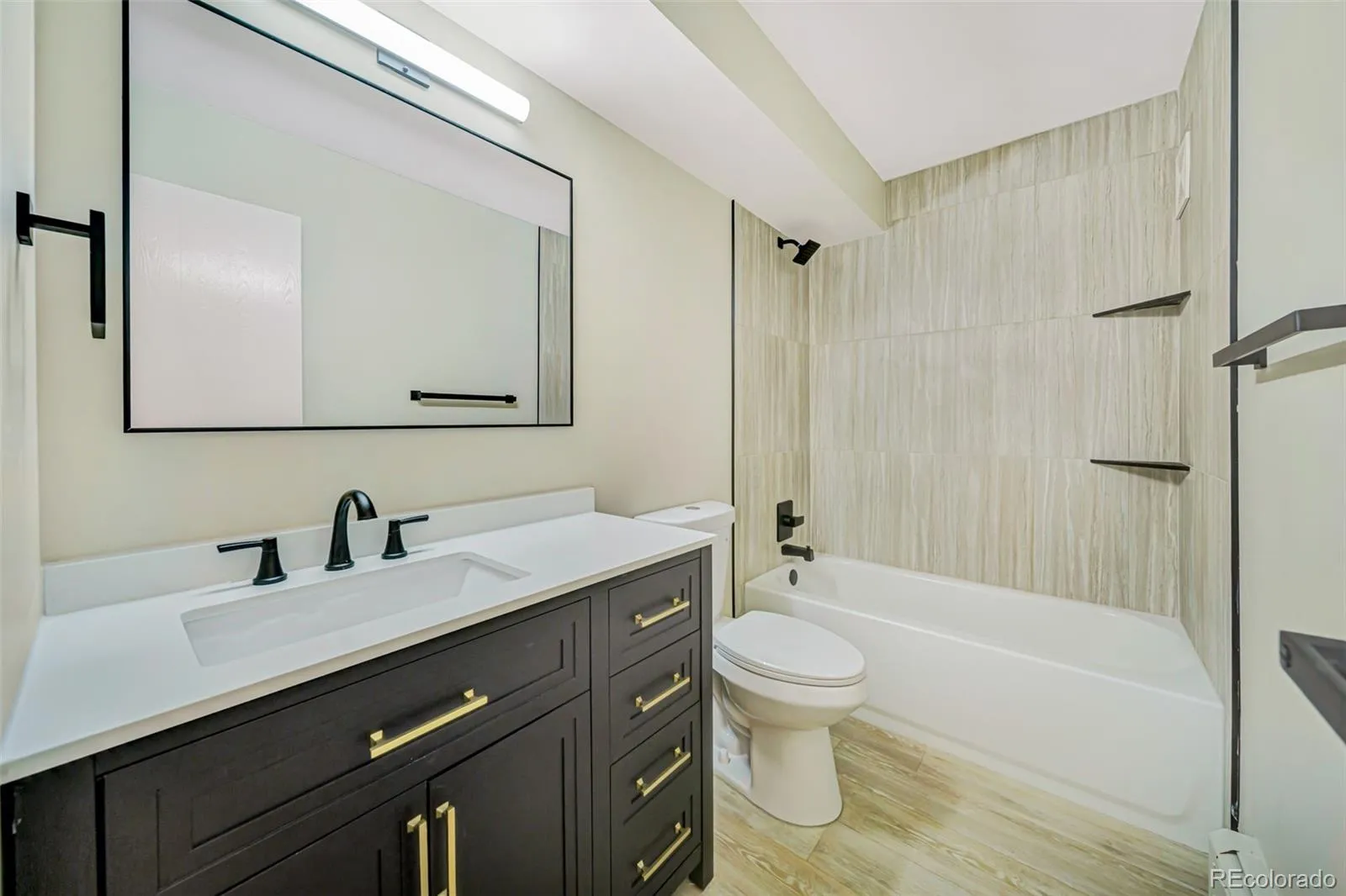 Two bathrooms, two completely different personalities. One is bold and dramatic — statement slab walls, a dark vanity with gold hardware, matte black fixtures that hit exactly right. The other is clean and serene — white shaker cabinetry, quartz counters, a deep soaking tub. Both are flawless.