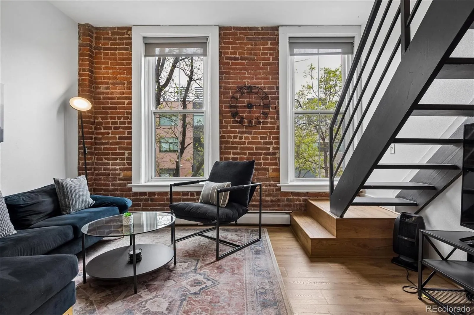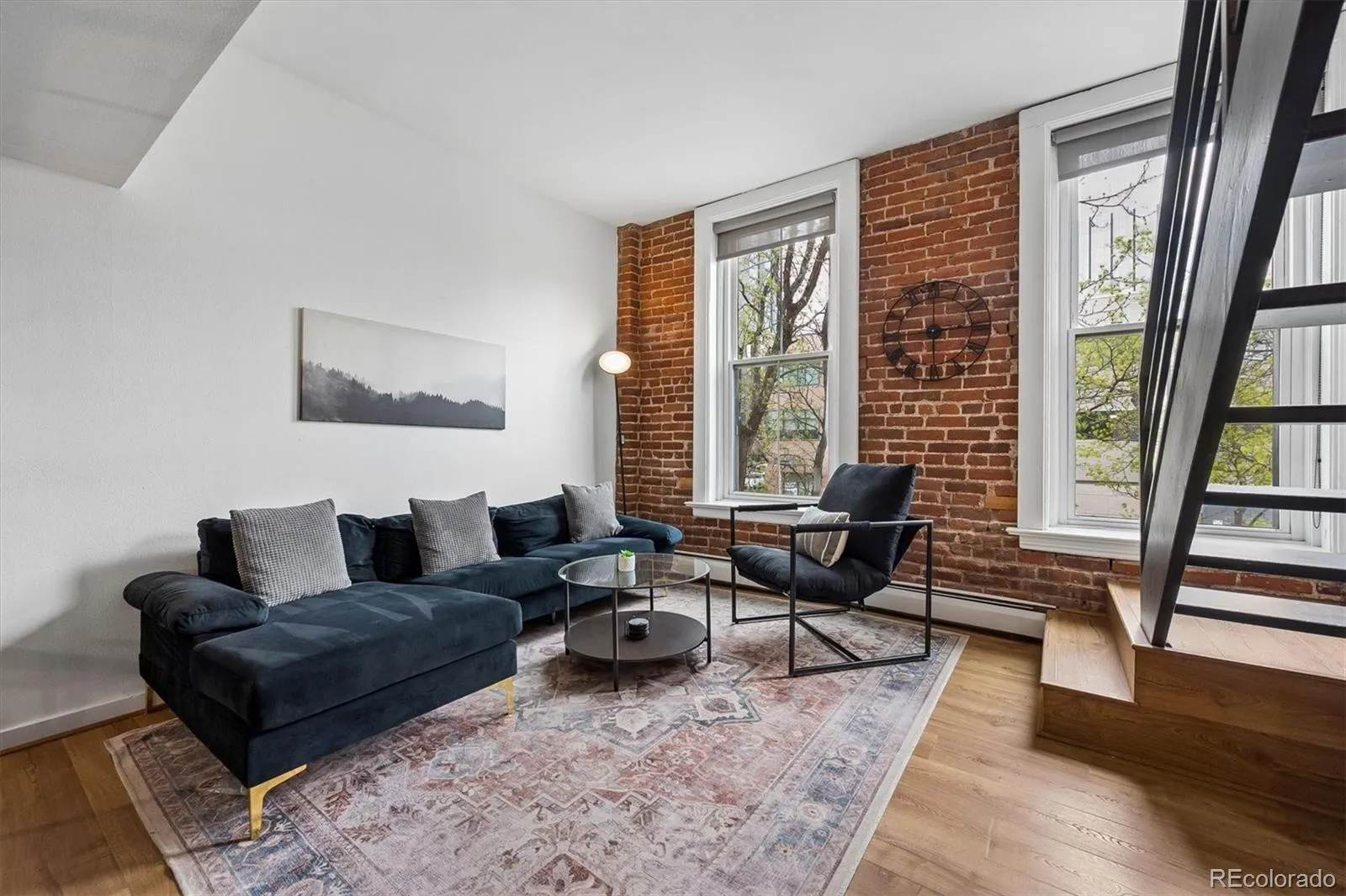 This multi-level loft in the historic Paris Hotel offers a standout living experience in the heart of Denver. The residence blends industrial character with modern functionality, featuring exposed brick throughout, rich hardwood floors, and soaring ceilings that enhance the sense of space and light.