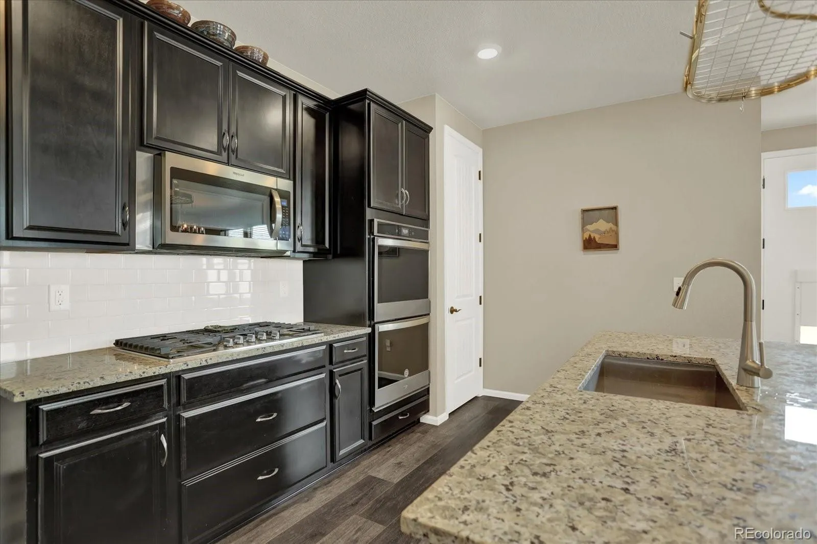 Step inside and the quality speaks for itself. Hunter Douglas blinds, granite countertops, and laminate flooring set the tone throughout. The living area centers around a sleek electric fireplace — the kind that makes any evening feel intentional. The chef’s kitchen is built for real cooking: 42-inch cabinets, granite counters, a double oven, 5-burner stovetop, stainless steel appliances, a statement island, and an accent backsplash that pulls it all together.