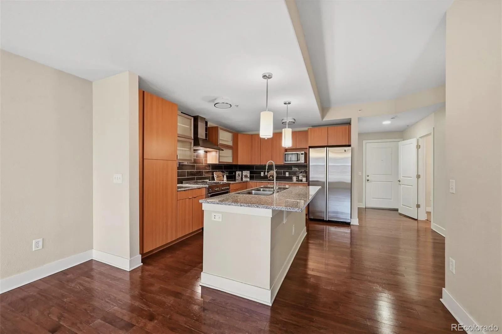 The spacious kitchen is the centerpiece of the home, featuring a large island, stainless steel appliances, custom tile backsplash, and seamless flow into the dining and living areas—perfect for both everyday living and entertaining. A wall of windows floods the space with natural light while showcasing the incredible park views.