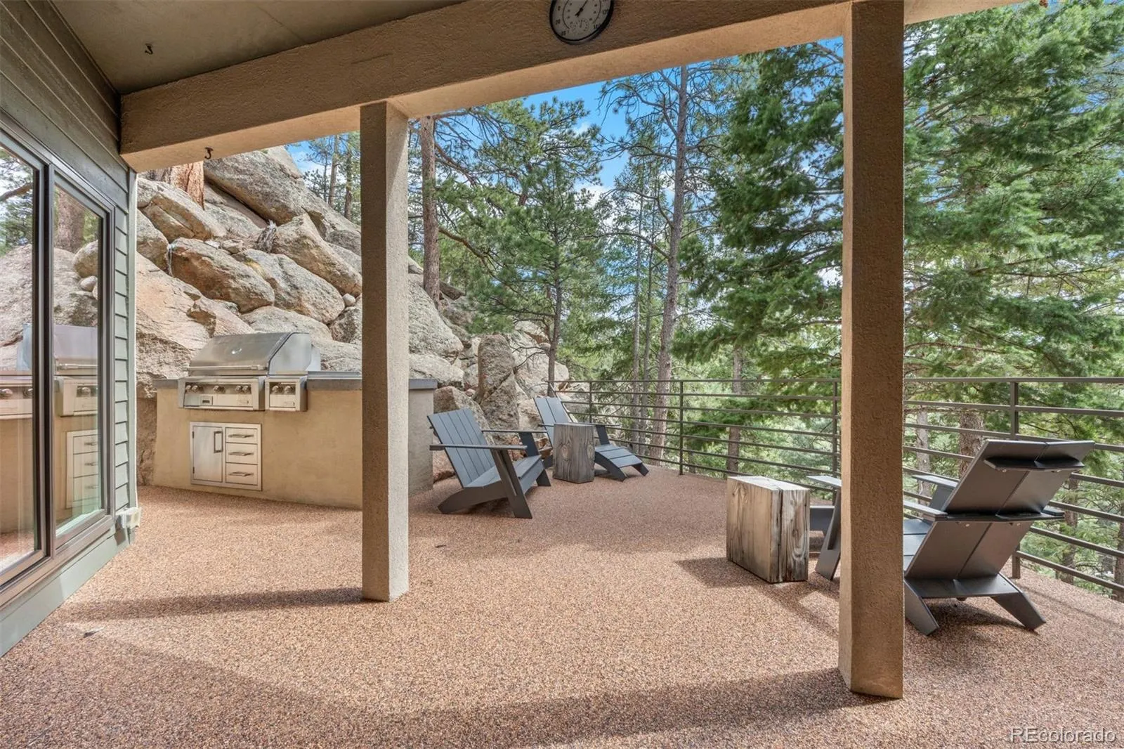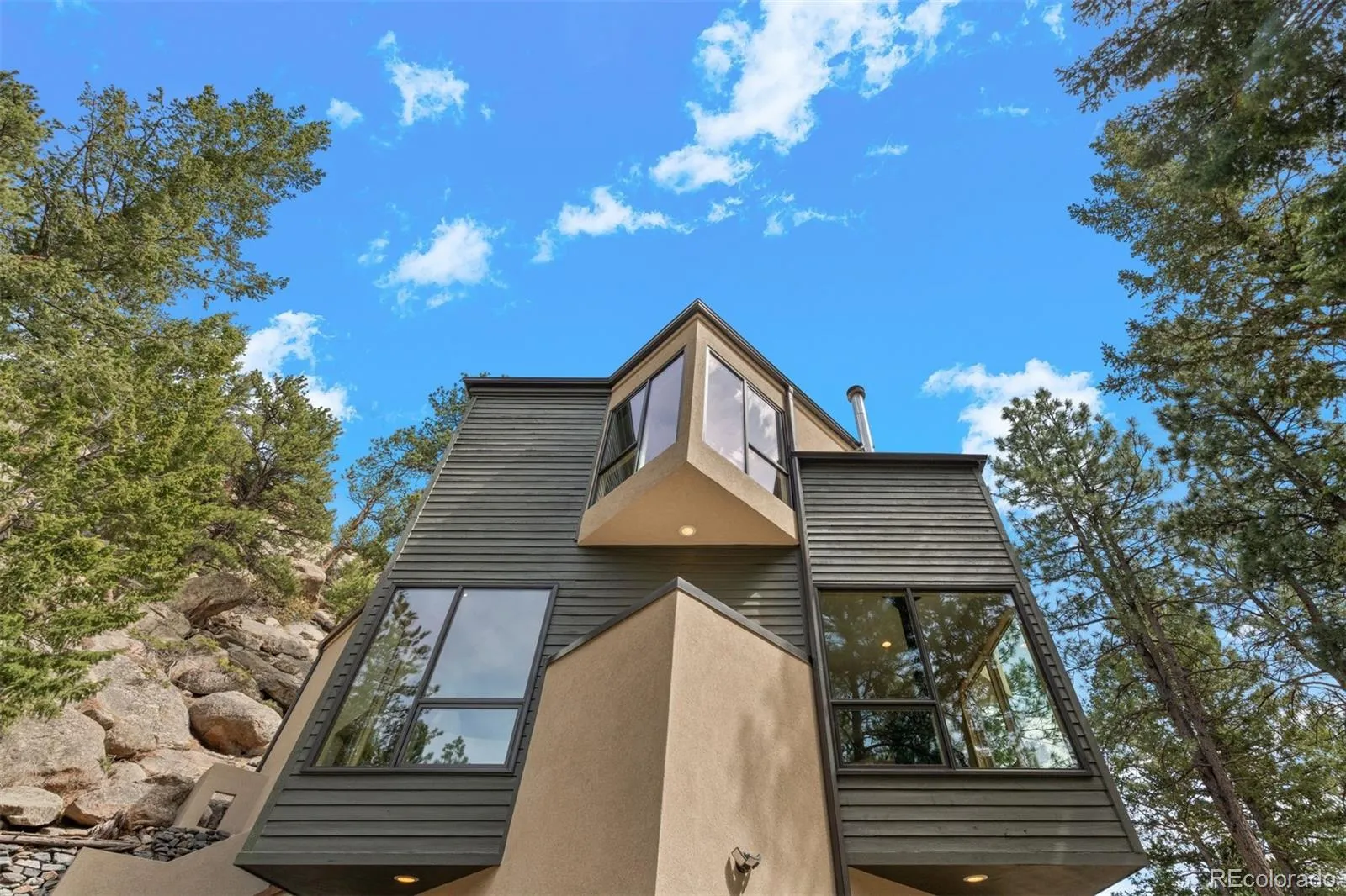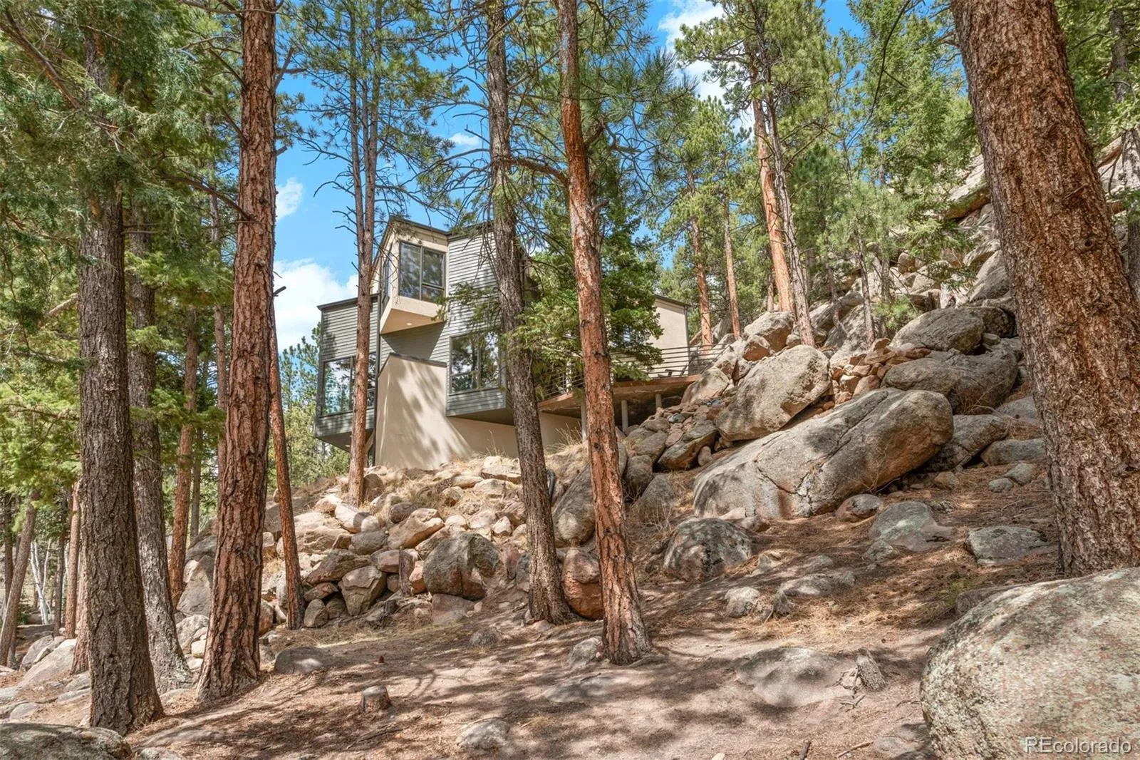 Architecturally stunning and fully re-imagined, this 3-bedroom, 3-bathroom home in Hiwan Hills offers 1,840 square feet of refined mountain living in the heart of central Evergreen. Thoughtfully remodeled by Meadow Creek Design, every detail blends modern sophistication with the surrounding natural landscape. The entry makes a lasting impression with rustic epoxy pebble stairs and entryway by Everstone, setting the tone for the craftsmanship found throughout. Additional upgrades include newer Pella windows and sliding doors, a new roof, fresh exterior paint, and a durable stucco coating. Inside, matte oak flooring flows throughout, complemented by custom stair railings and balusters that create a striking architectural focal point. The kitchen is both functional and beautiful, featuring quartz counters, stainless steel appliances and contemporary finishes designed for everyday living and entertaining alike. The primary suite is a true standout, highlighted by an incredible bathroom remodel with elevated finishes and a spa-like feel. Walls of windows bring the outdoors in, framing dramatic views in every direction, including massive granite rock outcroppings that anchor the home to its setting. Natural light pours into every space, enhancing the home’s open, airy feel. Outdoor living is equally impressive, with two expansive levels of decking designed to take full advantage of the scenery. The main level deck features a plumbed gas grill alongside a tranquil rock waterfall and fountain, creating a peaceful and private setting for relaxing or gathering. Modern comfort meets mountain practicality with the rare addition of both air conditioning and a newly installed generator, providing year-round peace of mind. Ideally located just minutes from Evergreen Lake, downtown, shopping, and amenities, with quick access to I-70 for easy Front Range commutes or weekend escapes to the high country, this exceptional home offers a unique blend of design, comfort, and location.