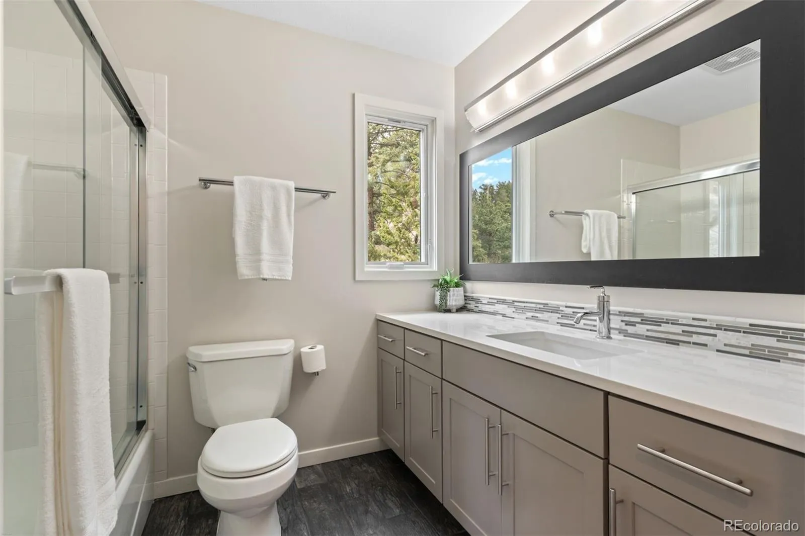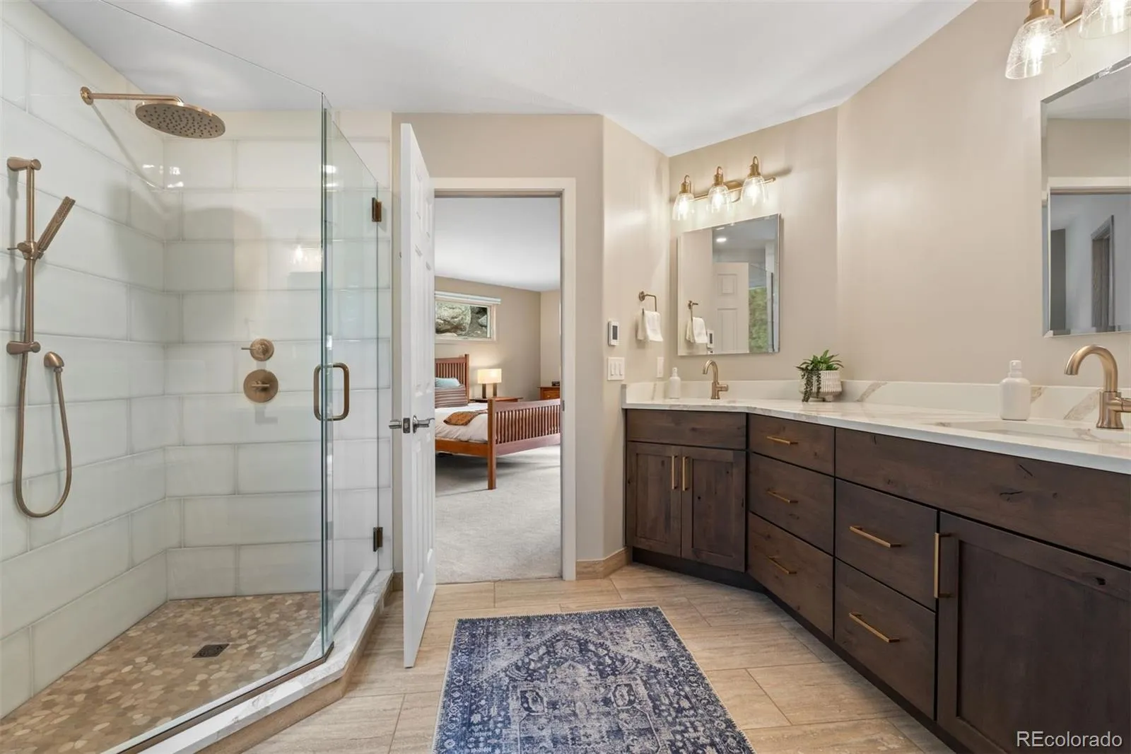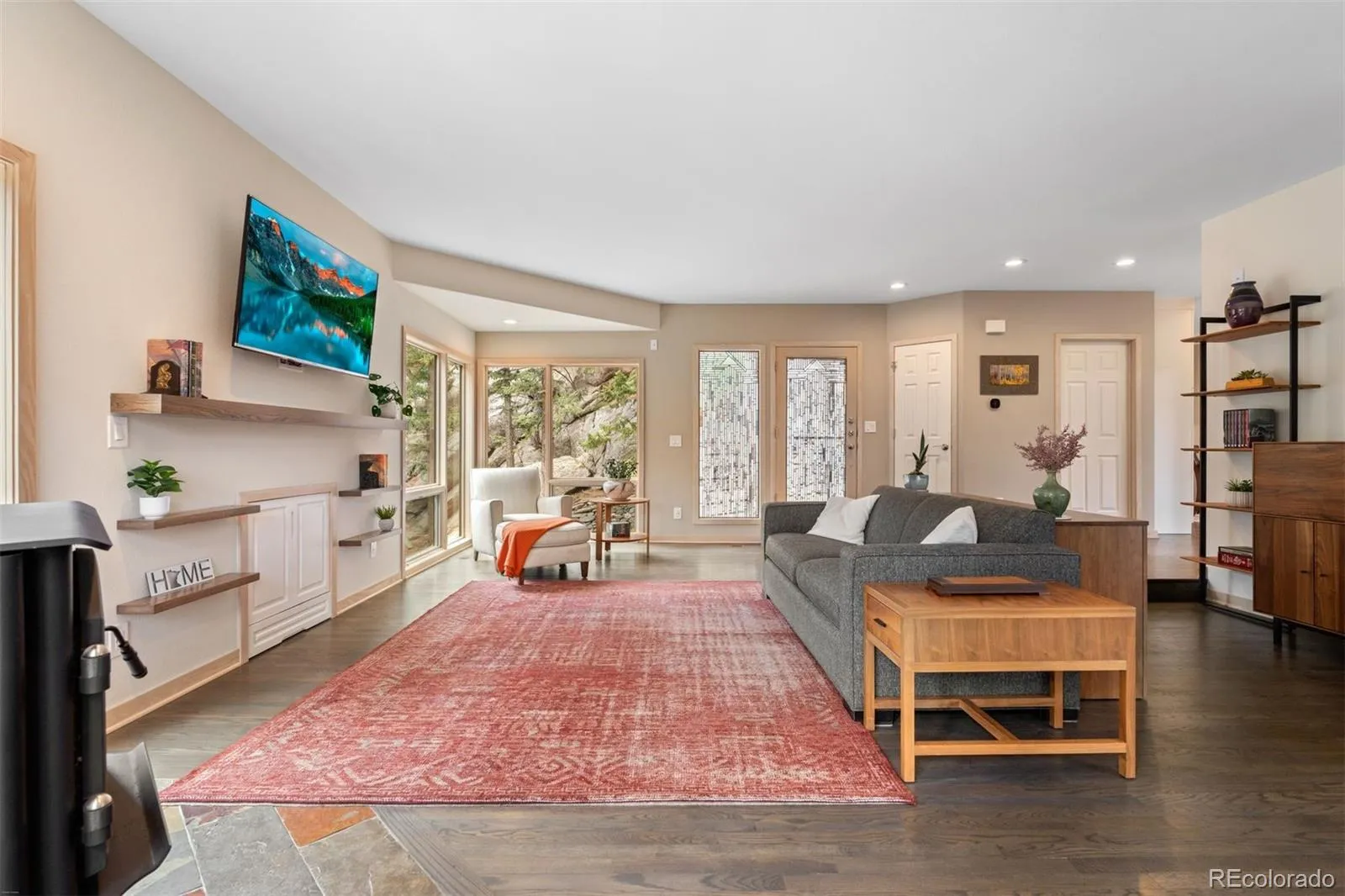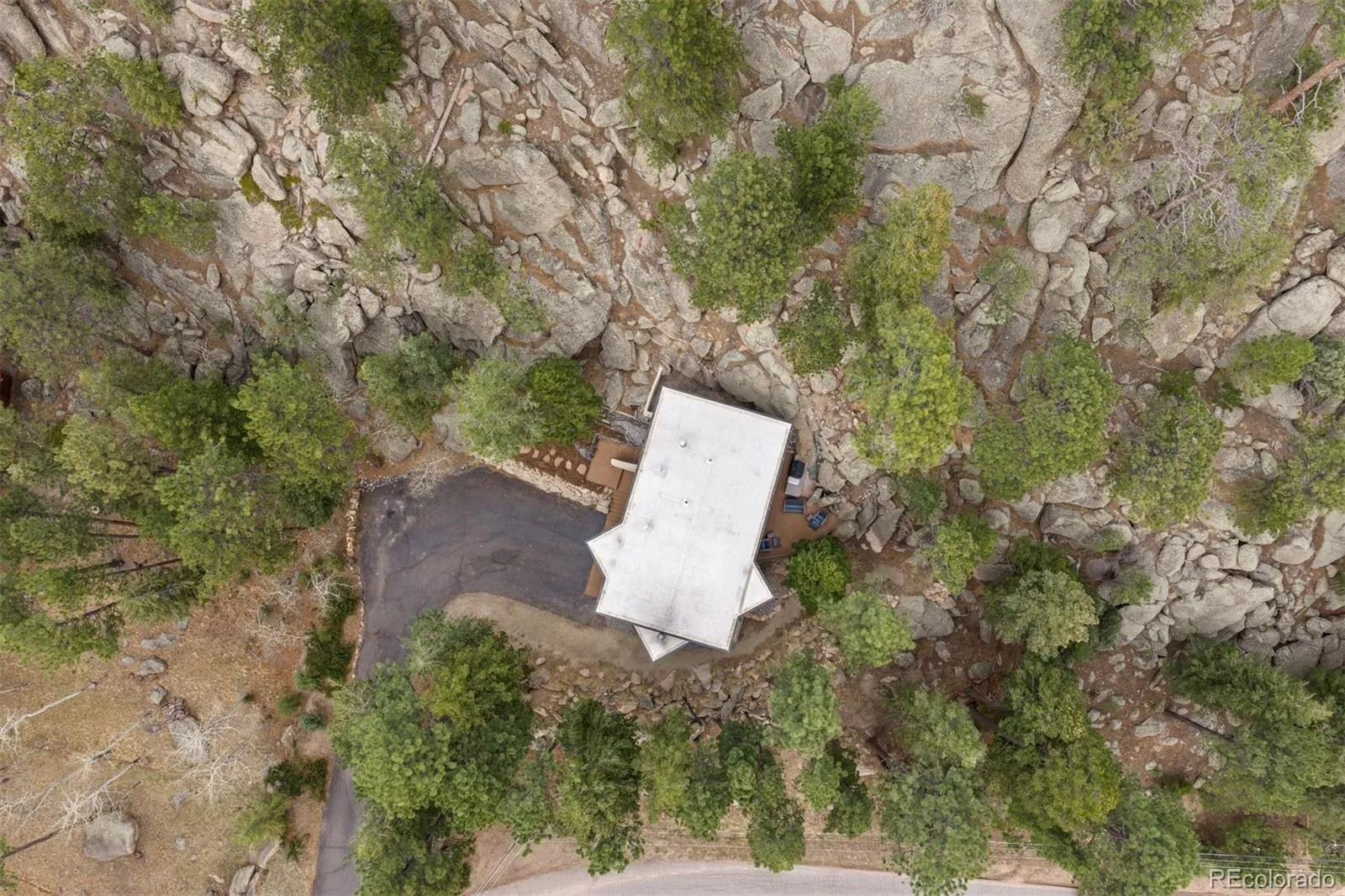 Architecturally stunning and fully re-imagined, this 3-bedroom, 3-bathroom home in Hiwan Hills offers 1,840 square feet of refined mountain living in the heart of central Evergreen. Thoughtfully remodeled by Meadow Creek Design, every detail blends modern sophistication with the surrounding natural landscape. The entry makes a lasting impression with rustic epoxy pebble stairs and entryway by Everstone, setting the tone for the craftsmanship found throughout. Additional upgrades include newer Pella windows and sliding doors, a new roof, fresh exterior paint, and a durable stucco coating. Inside, matte oak flooring flows throughout, complemented by custom stair railings and balusters that create a striking architectural focal point. The kitchen is both functional and beautiful, featuring quartz counters, stainless steel appliances and contemporary finishes designed for everyday living and entertaining alike. The primary suite is a true standout, highlighted by an incredible bathroom remodel with elevated finishes and a spa-like feel. Walls of windows bring the outdoors in, framing dramatic views in every direction, including massive granite rock outcroppings that anchor the home to its setting. Natural light pours into every space, enhancing the home’s open, airy feel. Outdoor living is equally impressive, with two expansive levels of decking designed to take full advantage of the scenery. The main level deck features a plumbed gas grill alongside a tranquil rock waterfall and fountain, creating a peaceful and private setting for relaxing or gathering. Modern comfort meets mountain practicality with the rare addition of both air conditioning and a newly installed generator, providing year-round peace of mind. Ideally located just minutes from Evergreen Lake, downtown, shopping, and amenities, with quick access to I-70 for easy Front Range commutes or weekend escapes to the high country, this exceptional home offers a unique blend of design, comfort, and location.