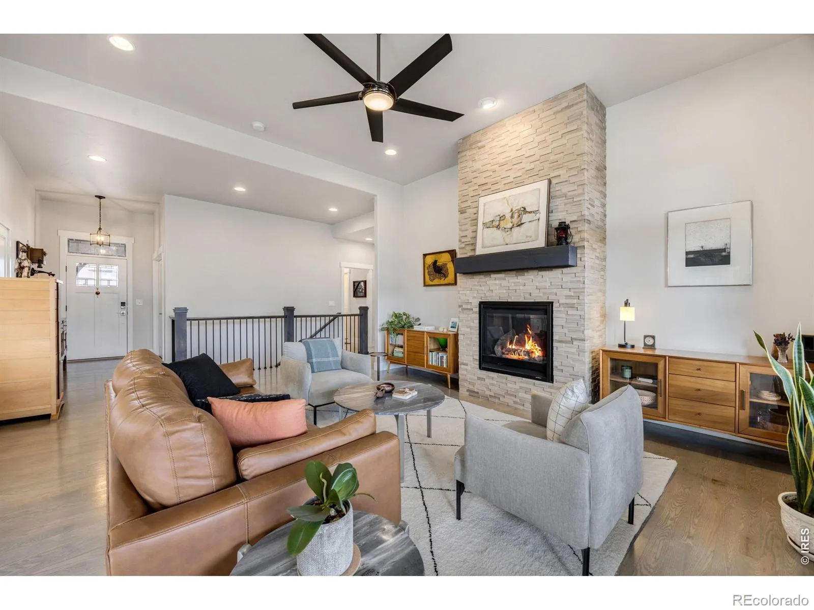 Welcome home to this exceptional 5-bedroom, 4-bath ranch-style home in the gated community of Overlook at Mariana, ideally situated on a quiet cul-de-sac where true Colorado living takes center stage. Inside, the thoughtfully designed open-concept layout features soaring ceilings, expansive windows, and abundant natural light that showcase sweeping Rocky Mountain views. The living room is anchored by a striking floor-to-ceiling fireplace, while oversized windows flood the space with light and frame the surrounding scenery. The spacious living area flows seamlessly into a well-appointed gourmet kitchen featuring granite countertops, a large pantry, and a convection range with gas connection behind should you choose to switch back. Ample counter space and a convenient breakfast bar make the space ideal for both everyday living and entertaining. A covered deck extends the living space outdoors, offering the perfect setting for relaxed morning coffee or alfresco dining while enjoying the wildlife that frequently visits the area. The landscaping has been thoughtfully designed with future privacy in mind, with strategic plantings that will mature into natural screening over time. An expansive 4-car garage provides exceptional space for vehicles, storage, and all your gear. Enjoy unmatched access to Mariana Butte Golf Course, nearby trails, and Boedecker Lake, offering year-round opportunities for recreation and relaxation. This is a prime opportunity to own in one of Loveland’s premier gated communities, combining privacy, views, and the best of Foothills living.