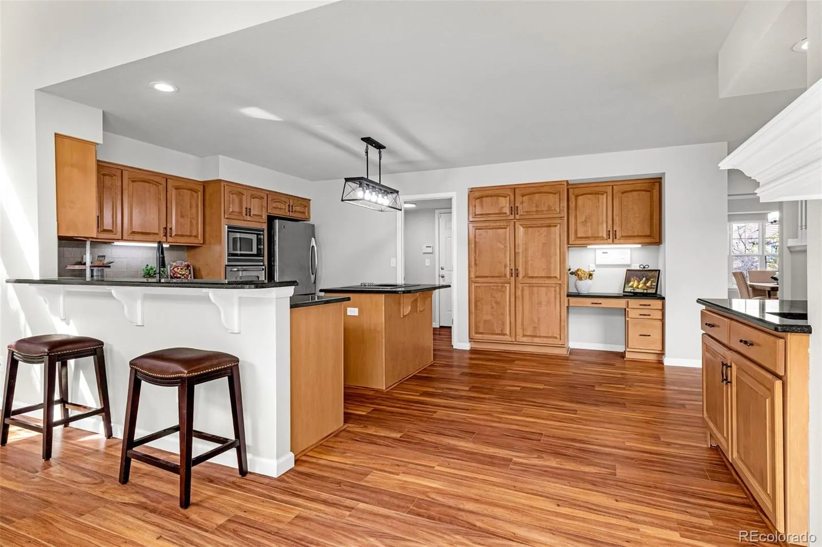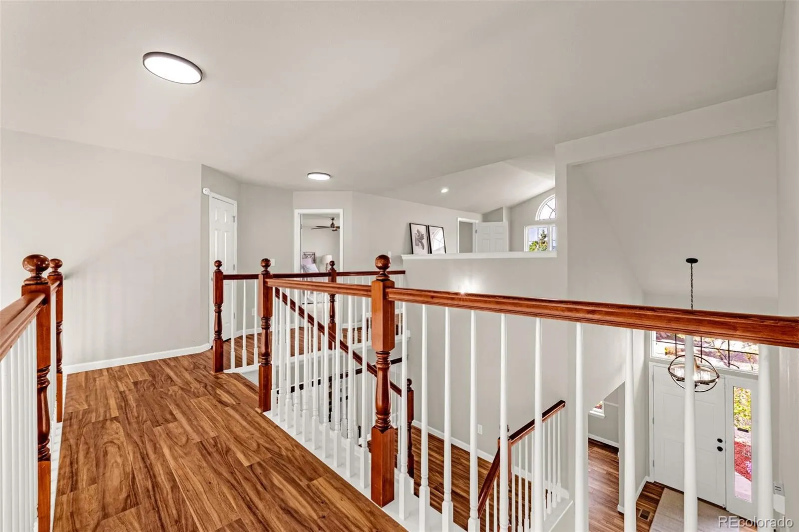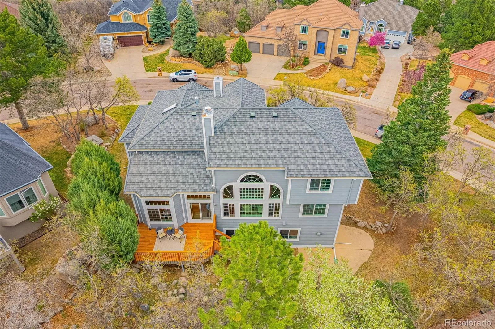 Nestled in a quiet, treed Broadmoor Bluffs neighborhood with dramatic mountain views as your backdrop, this 6-bedroom, 4-bathroom two-story home makes a strong first impression with its classic brick and lap siding exterior, three-car garage, and mature, boulder-accented landscaping. Arched windows and a covered front entry add architectural character that carries throughout the home. Located within the highly regarded Cheyenne Mountain School District 12. Inside, soaring two-story ceilings anchor the great room, where a floor-to-ceiling brick fireplace and an expansive wall of arched windows flood the space with natural light. LVP flooring extends through the main level, connecting the formal living and dining areas to a well-appointed kitchen featuring granite countertops, raised-panel cabinetry, a center island, stainless steel appliances including a double oven, a tile backsplash, and a built-in desk nook. A main-level mini primary suite adds flexibility, and the home offers an abundance of storage throughout. The upper-level primary suite features a tile fireplace, ceiling fan, walk-in closet, and a private bath with a soaking tub and separate glass-enclosed shower. The finished lower level provides additional living space with a wet bar, a second fireplace, skylights, and walkout access to a concrete patio. Minutes from North Cheyenne Cañon Park, Seven Falls, Cheyenne Mountain State Park, and the world-renowned Broadmoor Hotel.