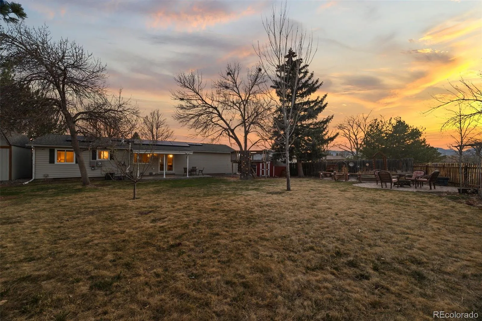 Step outside to a backyard designed for Colorado living, featuring a covered patio, custom paver fire pit area, fenced garden space with raised beds, and a built-in treehouse. A 10×12 barn-style shed with loft and windows, additional storage shed, and side RV parking add flexibility.