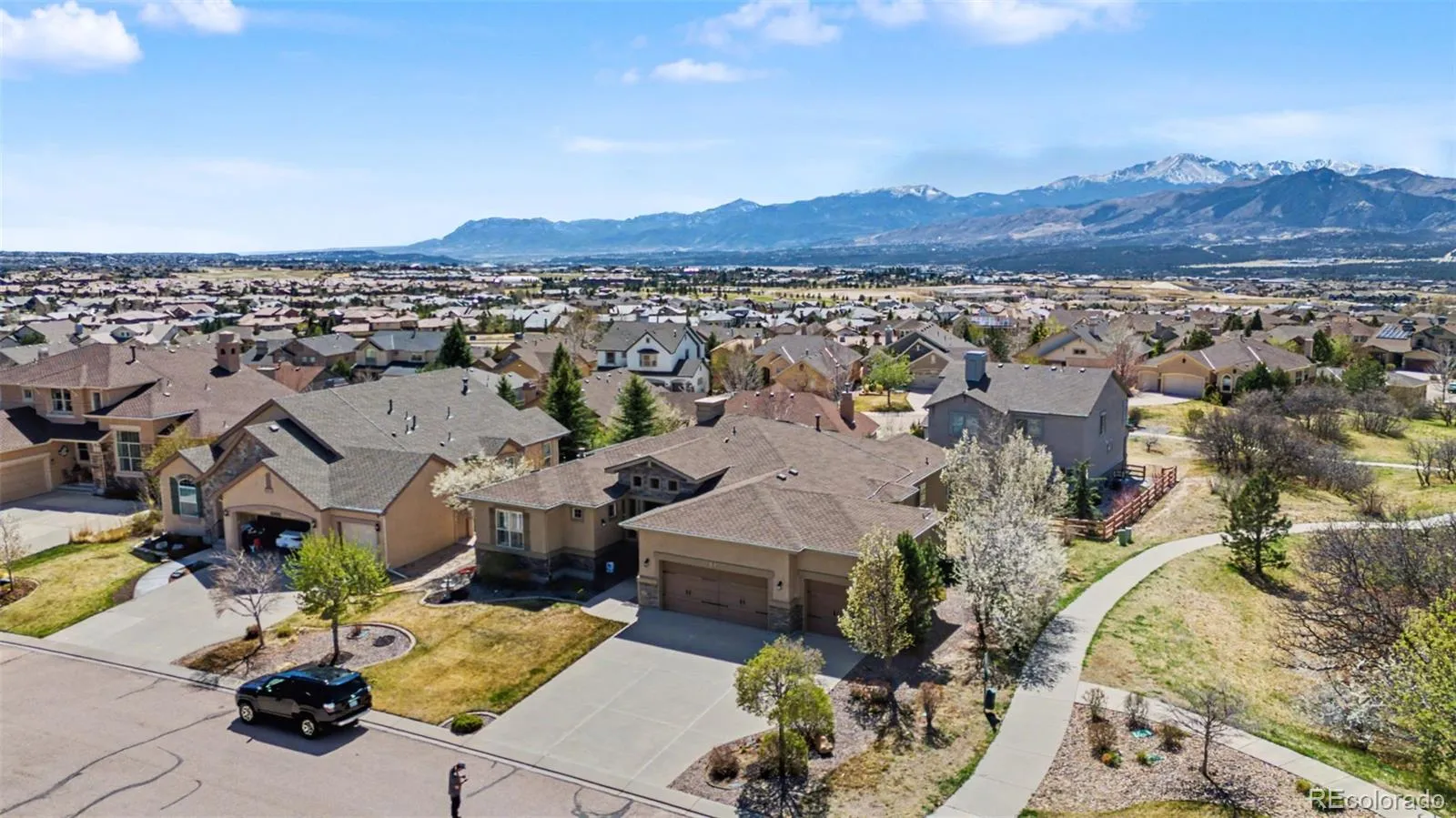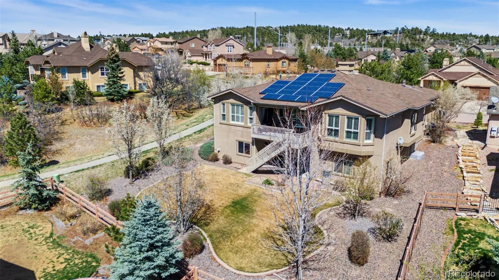 4 Bedroom, 3 Bath, 3 car garage Rancher on fabulous View Lot , over 4000 sq ft of great living in Flying Horse neighborhood. Great schools, fabulous country club and Golf Course, but not mandatory membership. Very well maintained, and third stall of garage is walled and secured for workshop. Kitchen has maple cabinets with 10 pull-outs, and huge island with separate sink, and lots of counter space and Breakfast nook that has walk-out to large deck with incredible views. Greenbelt with maintained trail adjacent to property. Schools and shopping conveniences are all within a short walk. The home has installed and functioning Solar panels and the Manufacturer is Tesla Solar who still maintains the system. Come enjoy the comfortable living , the fabulous views, the beautiful landscaping, and the convenience of all the close amenities. Exclusions: Main Level Front Bedroom Ceiling Fan, All Draperies including shower curtains and rods.