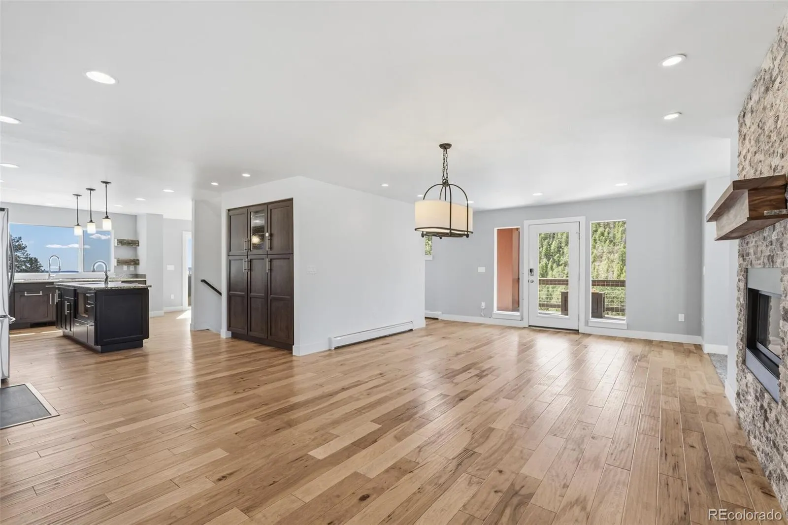 Perched on over 5 acres in the heart of Colorado’s Rocky Mountains, this spectacular mountain contemporary home offers incredible views of snow-capped peaks, dramatic rock outcroppings, and pine-forested ridge lines. Completely reimagined and rebuilt in 2015, this 3,704 sq ft home blends modern luxury with mountain authenticity. Step inside to an open, light-filled floor plan anchored by a gorgeous great room with a two-sided gas fireplace featuring a stone facade. The gourmet chef’s kitchen offers dark espresso cabinetry, solid surface countertops, stainless appliances including a gas range with hood, a large center island with pendant lighting, and warm hickory hardwood floors that flow throughout. The upper level is your private sanctuary. The expansive primary suite features a five-piece bath with soaking tub, a frameless glass walk-in shower, and a private covered balcony deck perfectly positioned to capture amazing mountain views. Two additional bedrooms and a bath round out the upper floor, along with a convenient laundry room. The finished walkout basement adds flexibility, with 2 more bedrooms, a full bath, and family room with an exterior ground level entrance door and a connecting garage access door. Outside, the living space is just as impressive. A stamped concrete patio with a custom gas fire pit and hot tub creates the ultimate outdoor entertaining area. Multiple decks offer front-row seats to the sweeping mountain panorama no matter the time of day. Additional highlights include an oversized two-car garage plus bonus shop space, a whole-home, auto-starting, natural gas powered generator, all new carpet throughout (March 2026), new interior main level paint (March 2026), newer exterior paint (2024). All this just minutes from Highway 285, Conifer shopping, restaurants, and easy access to Denver — the perfect blend of total mountain seclusion and everyday convenience. This is Colorado mountain living without compromise.