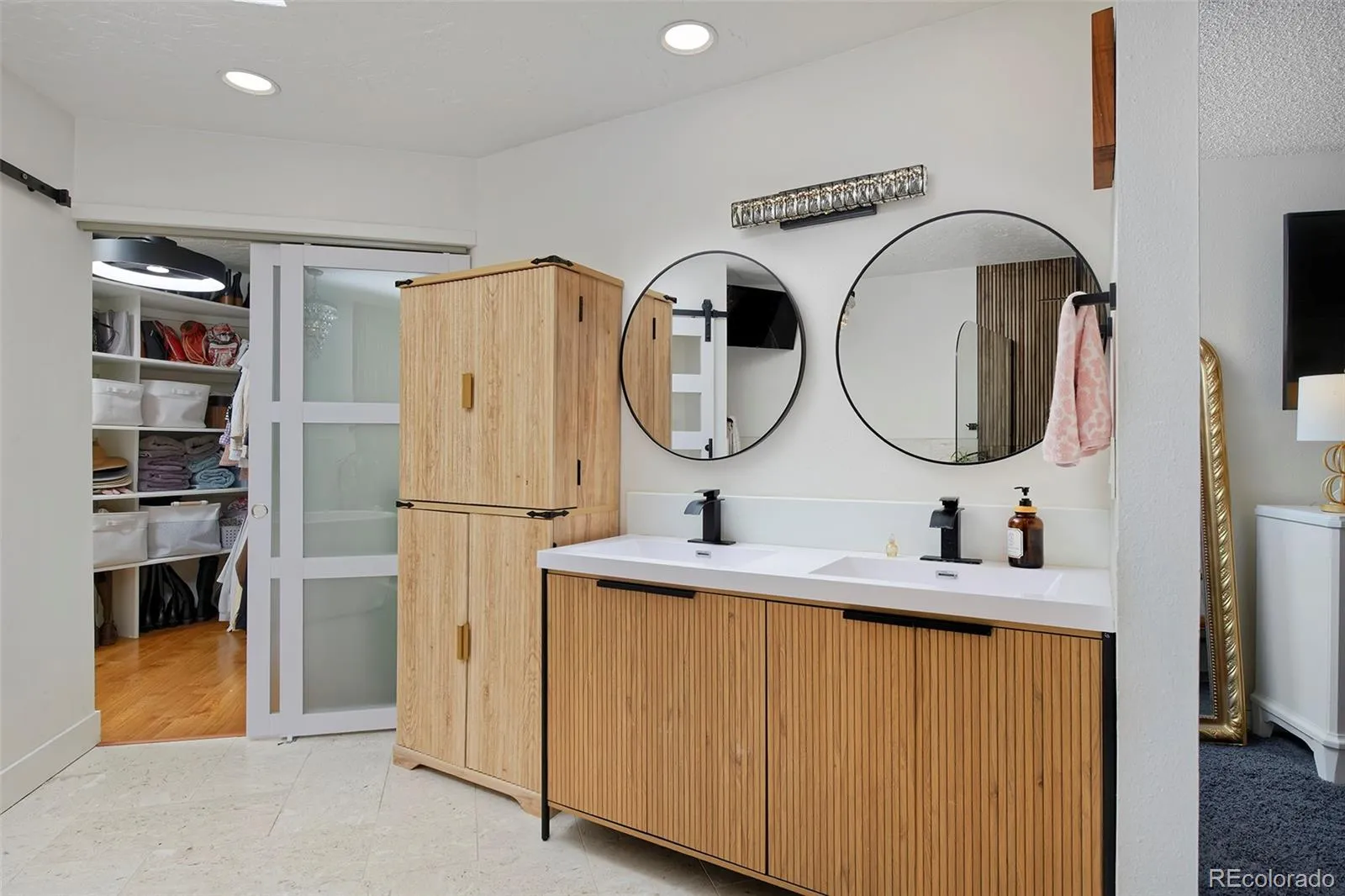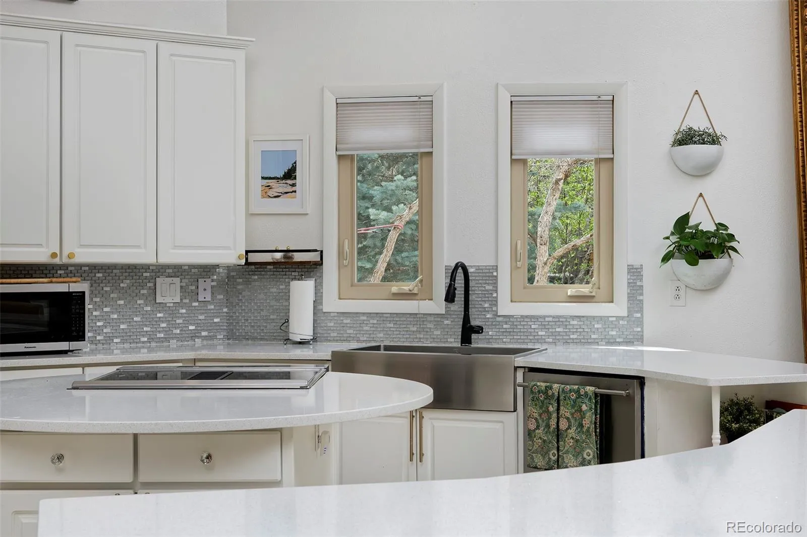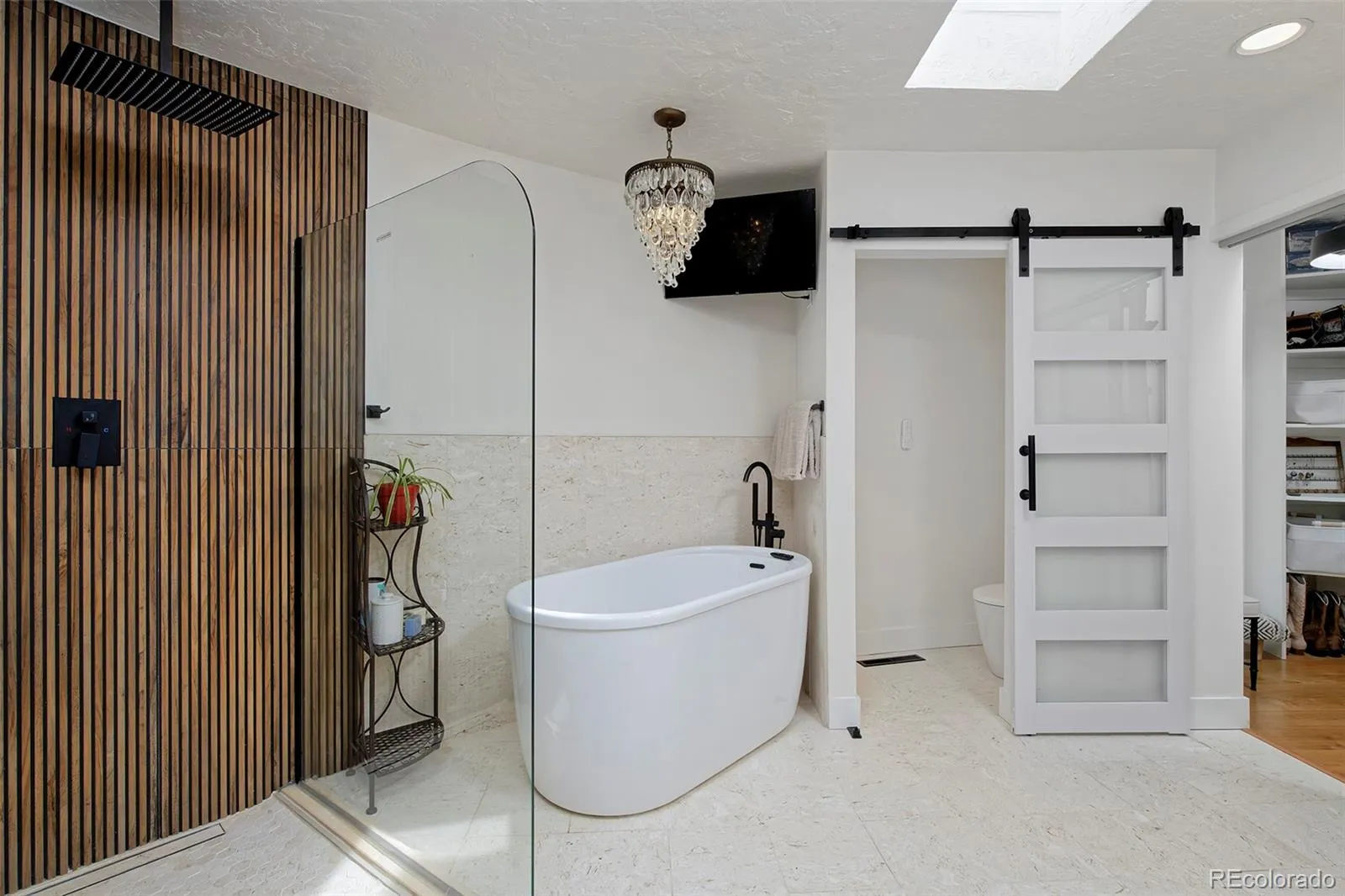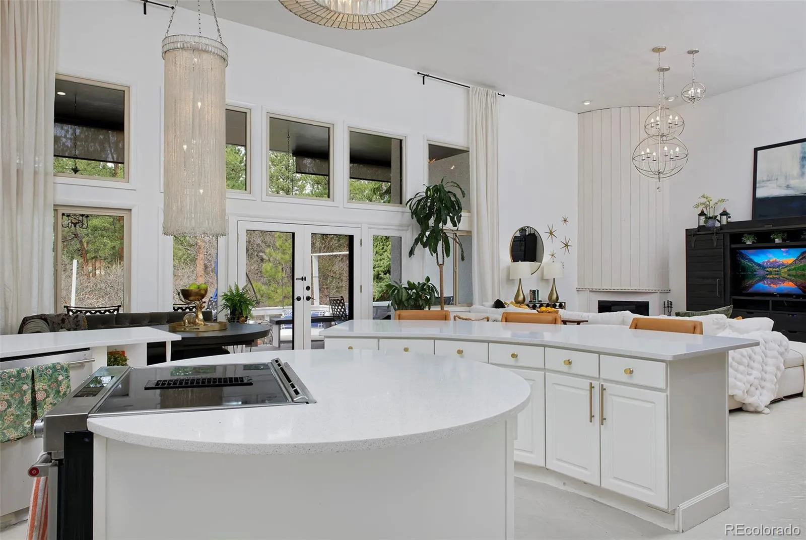 Five steps down, the kitchen anchors the home with two quartz islands—ideal for entertaining. Magnificent chandeliers grace the refined comfort of the room, centered around the mid-century modern fireplace. Double doors open to expansive decks, perennial gardens, fruit trees, and deer-protected planting space.