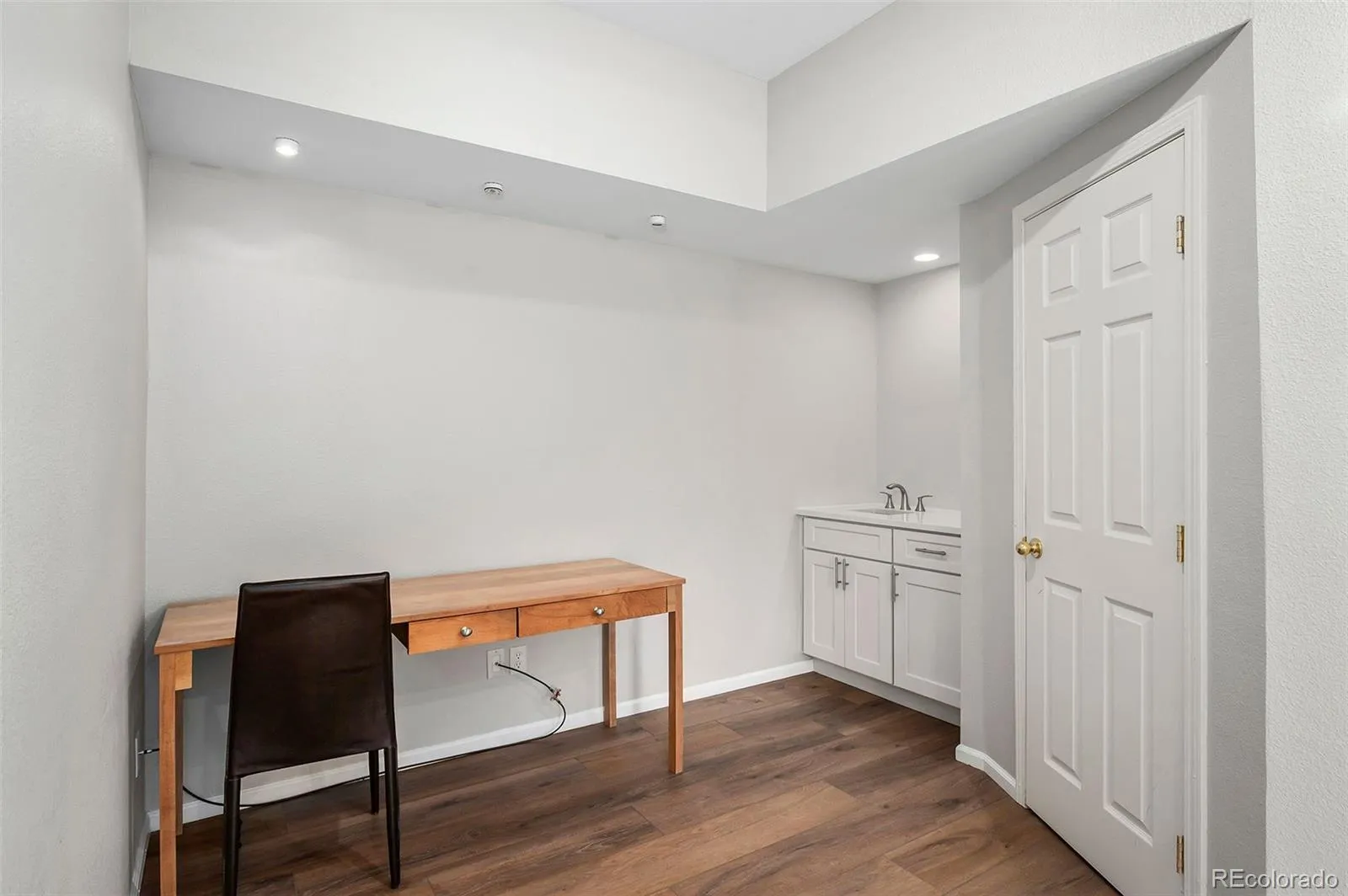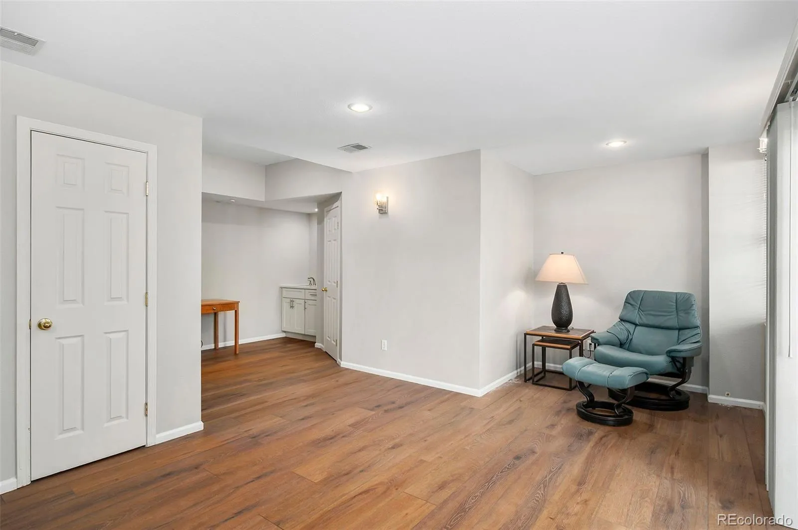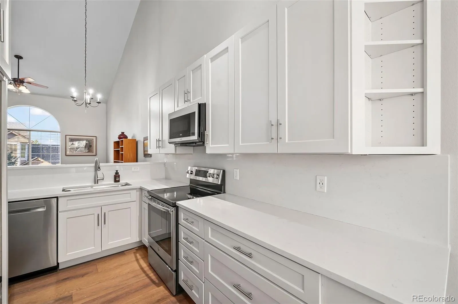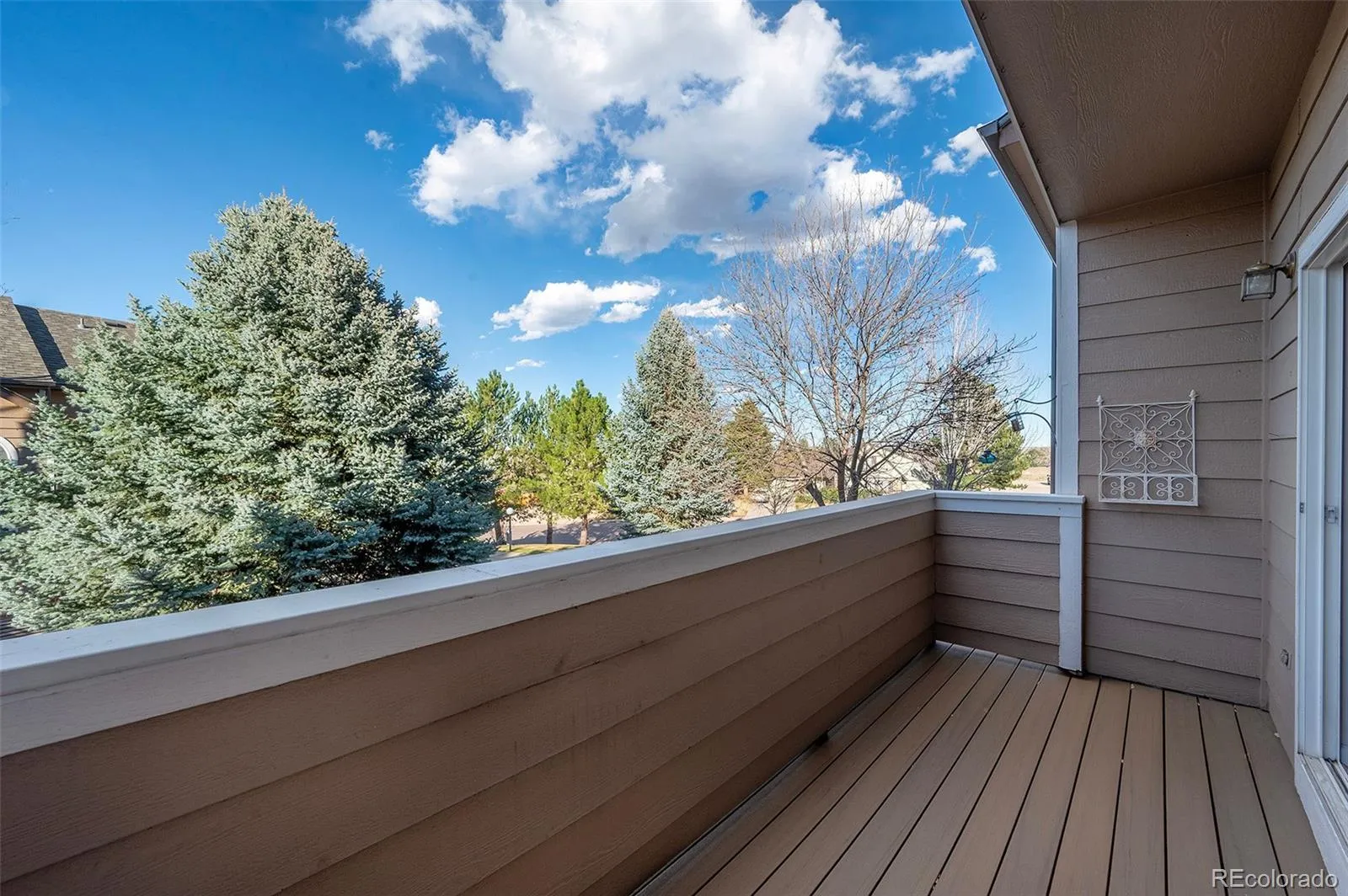 Welcome home to this beautifully updated 2,595 sq ft luxury townhome, where light-filled spaces and refined finishes create an exceptional living experience. This thoughtfully designed three-bedroom, four-bath townhome showcases soaring cathedral ceilings on the main level, vaulted upper-level suites, and three separate living areas ideal for both everyday comfort and elevated entertaining. Expansive arched windows flood the open-concept main floor with natural light, highlighting the custom wide-plank CoreTec Grande Petronas Oak Wood flooring throughout. The seamless layout flows effortlessly from the fully remodeled kitchen featuring crisp white 40” custom cabinetry, quartz countertops, stainless steel appliances, a built-in pantry, and casual dining space into a spacious great room, dining area and second main floor living room sharing a warm gas fireplace with the family room and a private powder room. Step outside onto your large, private Everwood deck, overlooking mature trees, blue spruce, open space with mountain views and stunning sunrises and sunsets! Enjoy the convenience of main floor laundry and a large mud room leading to your attached 2 car garage. Retreat upstairs to the expansive vaulted master suite with a beautifully updated four-piece bath with dual vanities, a large walk-in shower, ample storage linen closet, and a spacious walk-in closet. A second vaulted bedroom with its own full bath provides comfort and privacy for family or guests. The newly finished 987 sq ft walk-out basement with 9-foot ceilings—adds incredible versatility, perfectly suited for multigenerational, in-law living or extended guest stays in the large family room, third bedroom, a remodeled bath with dual sinks, media room or study, and a flexible hobby or kitchenette area. The walk-out patio door leads to the shaded patio for a private, relaxed retreat. Located minutes from C-470, Clement Park, miles of trails, parks, dining, recreation, Southwest Plaza and more.