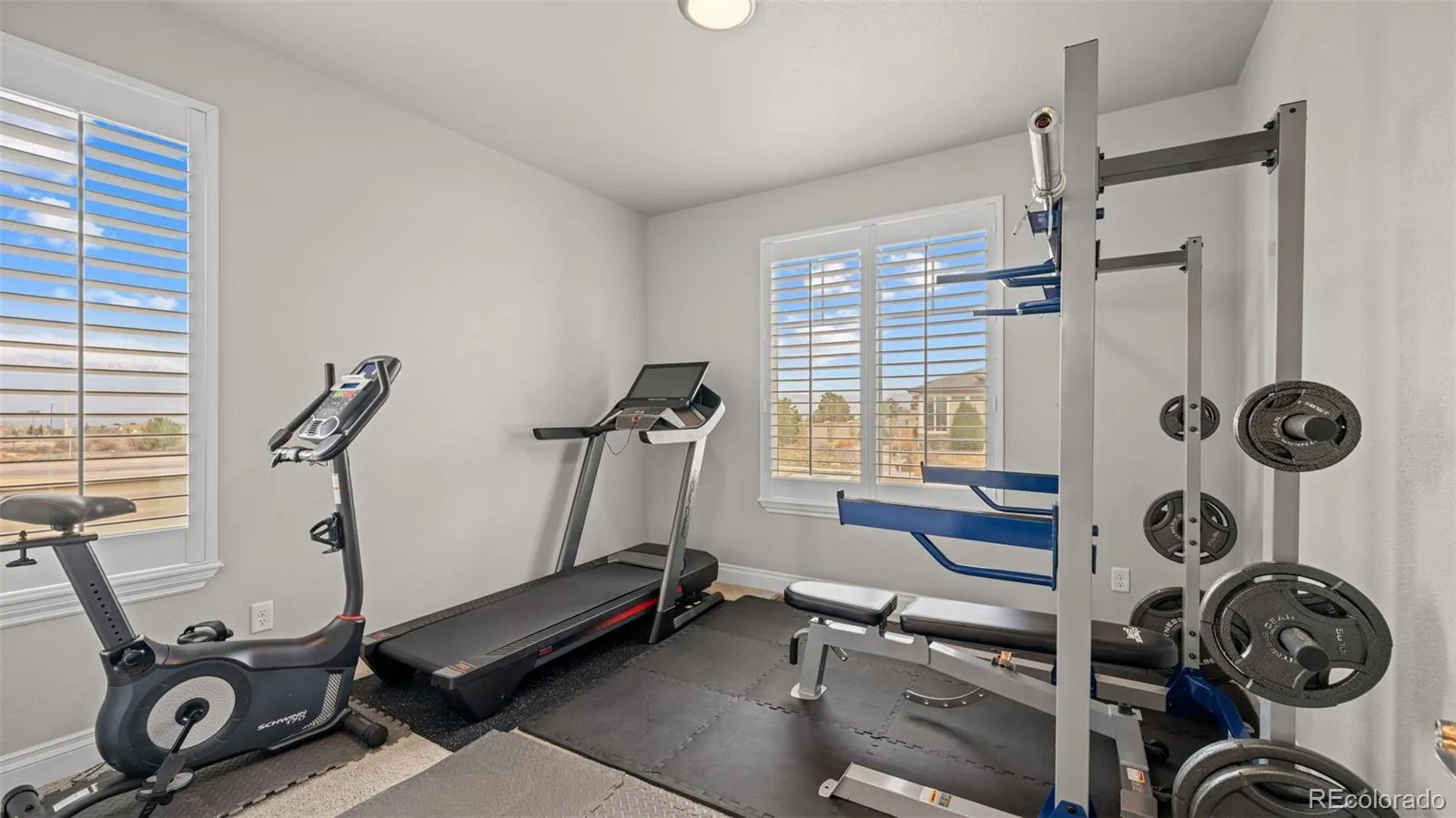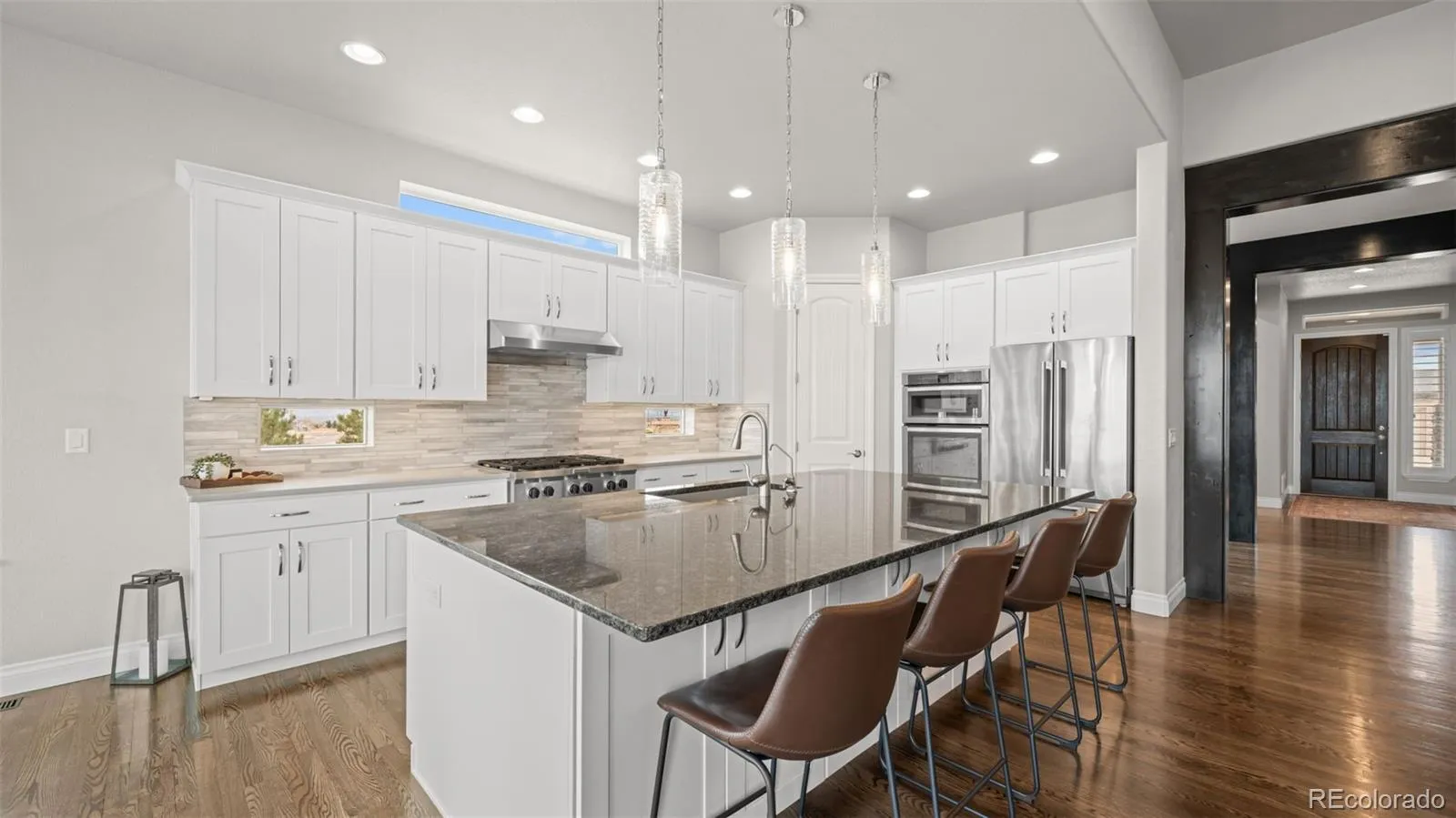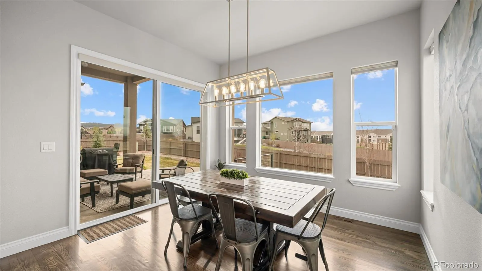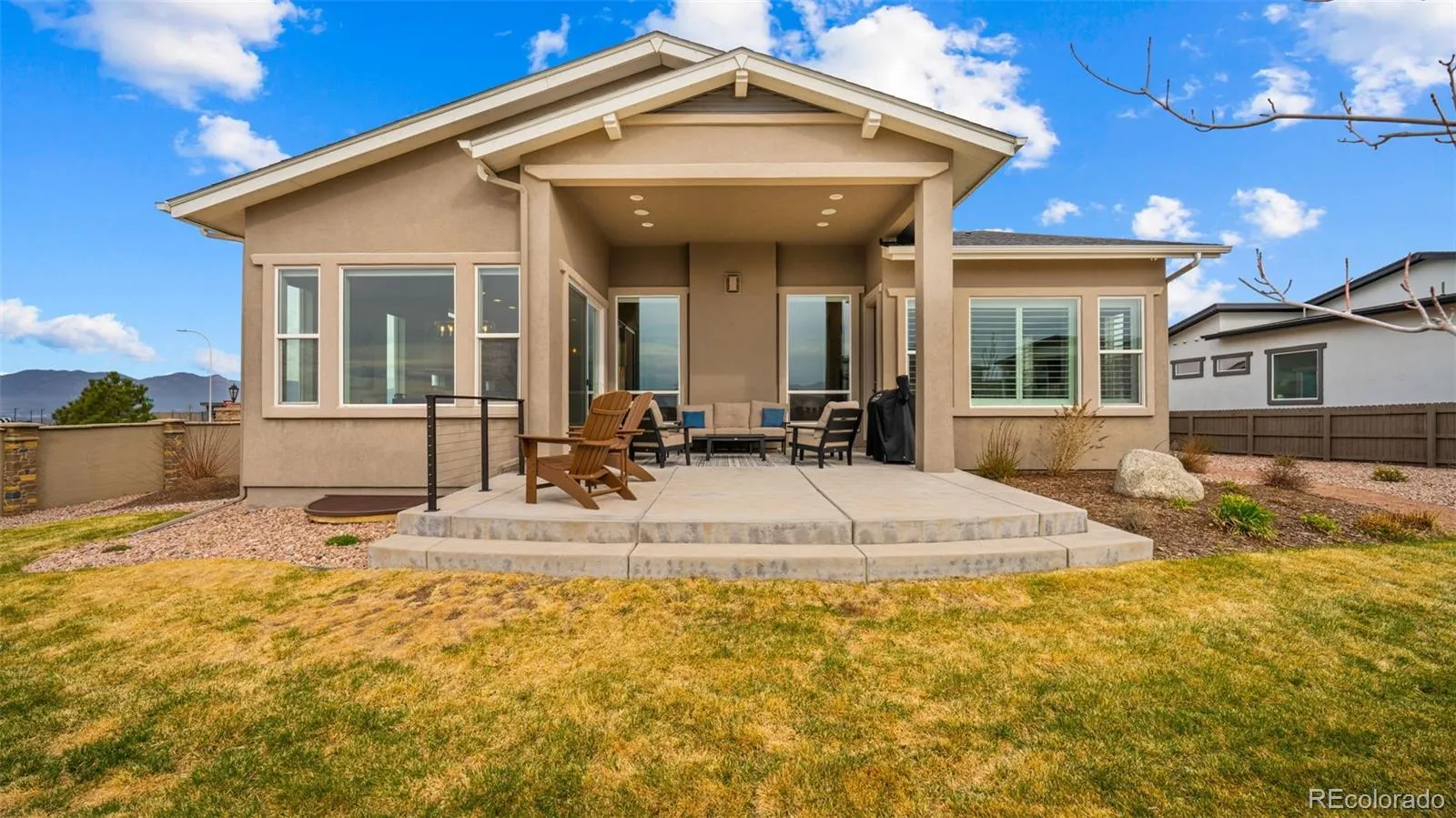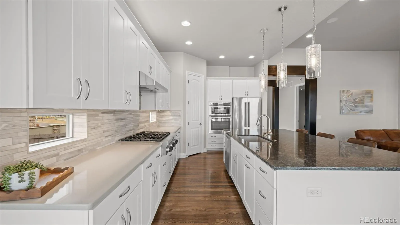 Step into this stunning Cordera Saddletree model home and experience the perfect blend of elegance and functionality. This open-concept ranch floor plan offers 5 bedrooms, 4 bathrooms, and over 4,000 finished square feet, designed for both everyday living and entertaining. The main level features a spacious primary suite, guest bedroom, private office, and a 3-car garage. Beautiful oak hardwood floors flow throughout the entry, great room, kitchen, dining area, and office, creating a warm and cohesive feel. The gourmet kitchen is a true centerpiece, featuring KitchenAid/Whirlpool appliances, a 6-burner gas cooktop, oven/microwave combo, large 9’x5’ island, full-tile backsplash, and quartz or granite countertops with upgraded cabinetry. The great room impresses with 12’ ceilings, expansive windows, and a gas fireplace with full stone surround, while thoughtful upgrades like 8’ doors and 9’ basement ceilings enhance the home’s open, spacious design. The finished basement expands your living space with a wet bar, junior suite, large rec room, game area, and abundant storage, offering flexibility for entertaining or multi-generational living. Additional features include a whole-house water purification system, security and camera system, programmable exterior lighting, and a newer hail-rated roof. The laundry room includes built-in cubbies, a quartz-topped sink, and direct access to the primary closet for added convenience. Enjoy outdoor living on the covered patio with recessed lighting and speakers, overlooking a fully landscaped and fenced corner lot with mountain views. Located in the highly desirable Cordera community, residents enjoy access to parks, trails, fitness center, and clubhouse amenities, all within Academy District 20. This home offers a true turnkey luxury lifestyle with every detail thoughtfully designed.