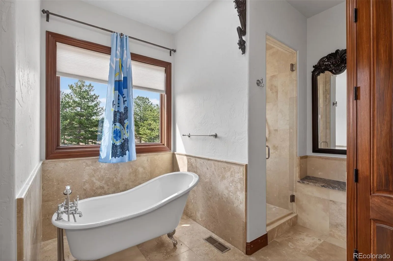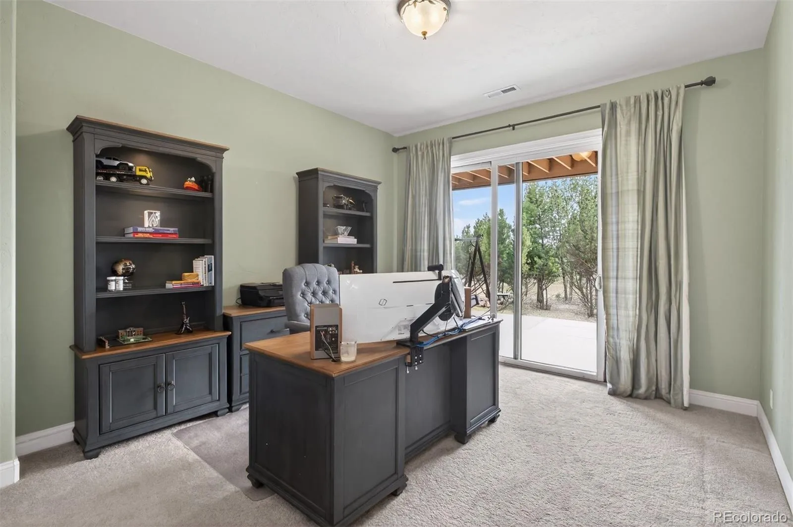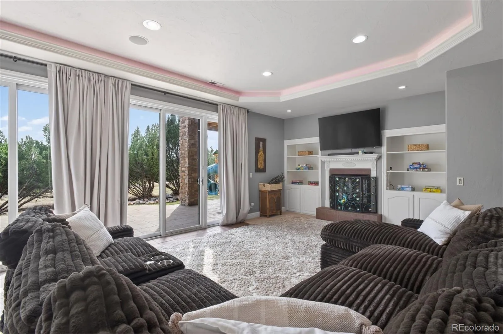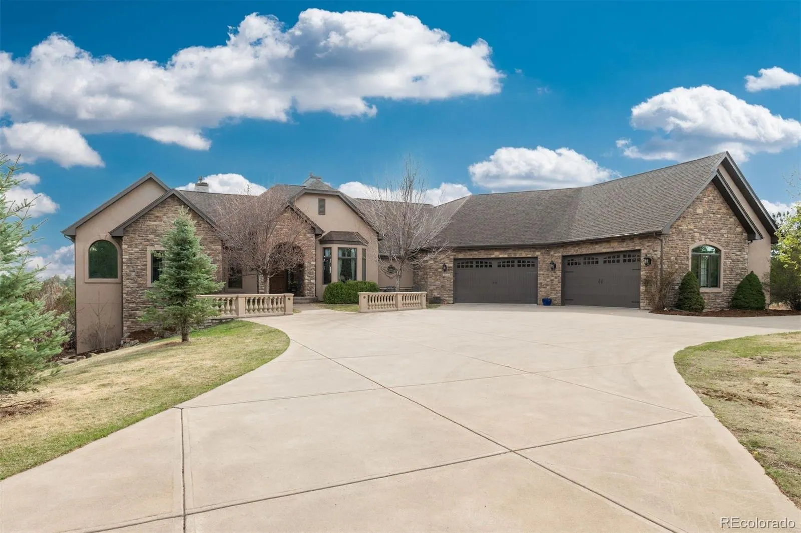Set on five private, tree filled acres in the sought-after Sterling Tree Farm community, this striking 7,000-square-foot custom home blends modern style with timeless luxury, all framed by unobstructed Pikes Peak views. Thoughtfully designed as an ideal family home, it offers abundant space both inside and out, with plenty of room to live, gather, and play. The main level has been refreshed with updated, contemporary paint tones, creating a clean, elevated aesthetic that complements the rich mahogany detailing throughout. Designed with today’s lifestyle in mind, the layout offers generous, flexible spaces that allow families to spread out comfortably while still feeling connected. A chef-inspired kitchen with a Butler’s pantry anchors the space, while the formal dining room makes a statement. Two expansive main floor bedrooms each feature their own private laundry, offering comfort and convenience with a thoughtful, modern touch. Architectural highlights include a stunning main-level library that adds character and craftsmanship you don’t often find. The lower level is designed for both entertaining and everyday living, with 3 additional bedrooms, a second laundry room, a high end theater, and a beautifully finished secondary kitchen. A handicap-accessible basement entrance further enhances functionality and ease of access. Outdoor living is equally inviting, with a serene water feature, private patio, and three expansive decks perfectly positioned to take in the mountain views. There’s ample room for outdoor fun, including dedicated spaces to play and a classic horseshoe pit, perfect for gathering with family and friends. The property also includes an oversized four-car attached garage and a 1,800-square-foot outbuilding with a 3-car garage door ideal for storage, hobbies, or a workshop. Private, polished, and perfectly located near Parker, this home delivers space, style, and sophistication.