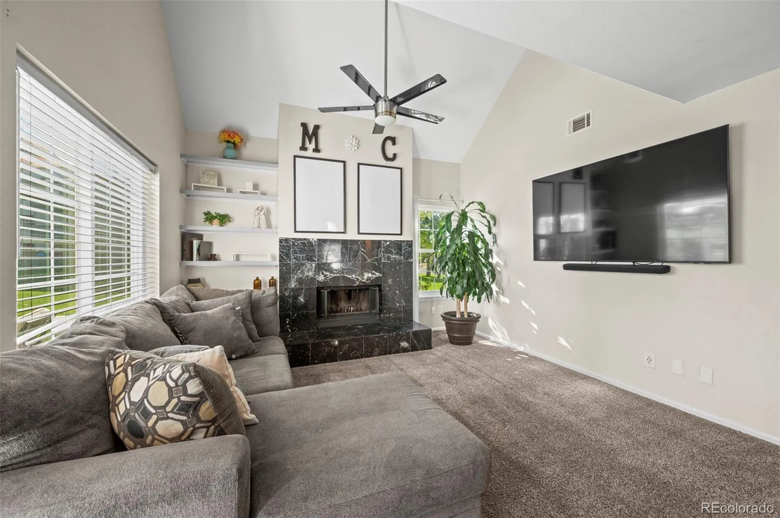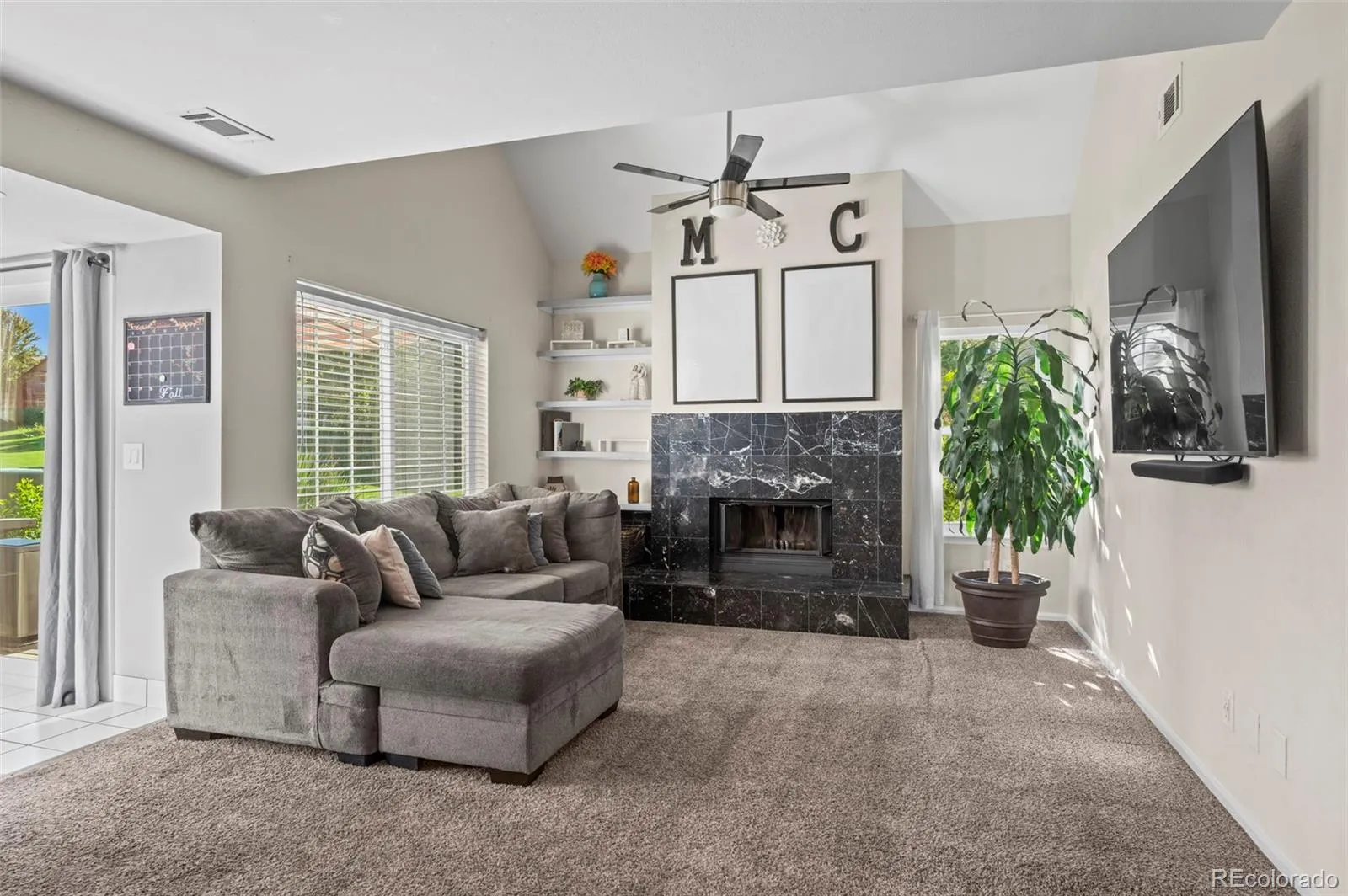 Welcome to this charming two bed two bath townhome in the desirable Heather Ridge South community, perfectly positioned along the 9th hole of the Heather Ridge Golf Course. This inviting home offers a light-filled open floor plan with vaulted ceilings. When you enter, you are greeted by a spacious family room where a cozy fireplace creates the ideal spot to relax. Large windows all around the main floor bring in abundant natural light. The kitchen is equipped with the essential appliances and the perfect spot for your dining room table. The kitchen flows out to a private patio which opens to serene views of the golf course, making it a wonderful space to entertain guests or enjoy peaceful evenings outdoors. On the main floor, there is a guest bedroom with a separate full bathroom. Upstairs, you’ll find a primary suite that spans the entire second level with an ensuite primary bath and generous sized walk-in closet.