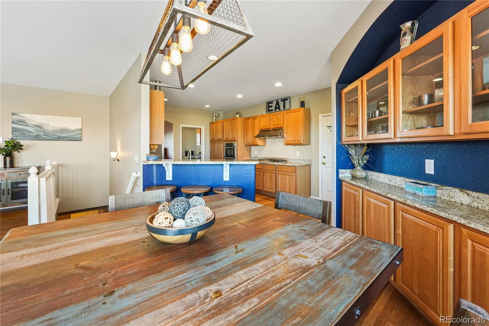 The formal dining room with exquisite tile is the perfect setting for a great meal from the amazing kitchen with granite, a coffee bar, and eat in kitchen, 5 burner GE Cafe gas top, double oven. Large pantry and laundry on the main level.